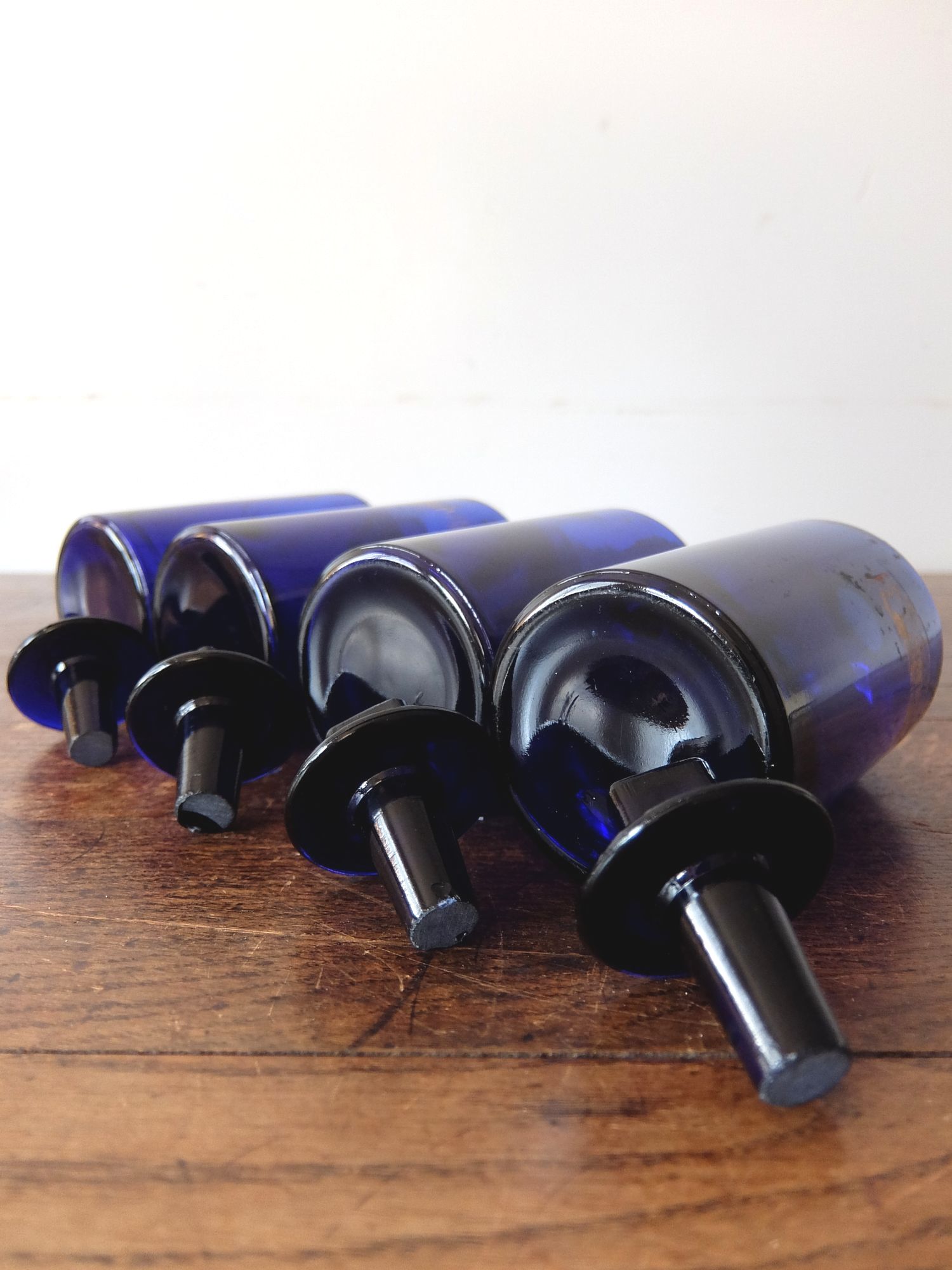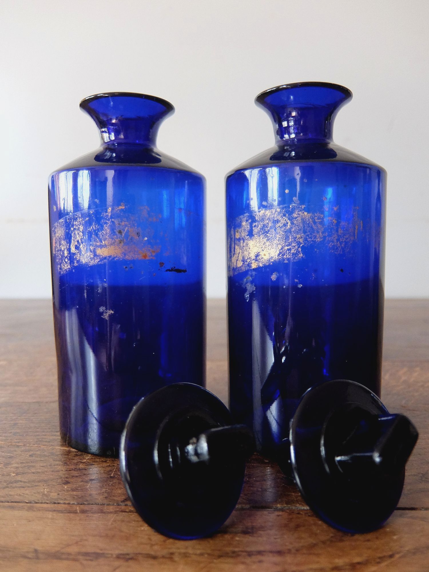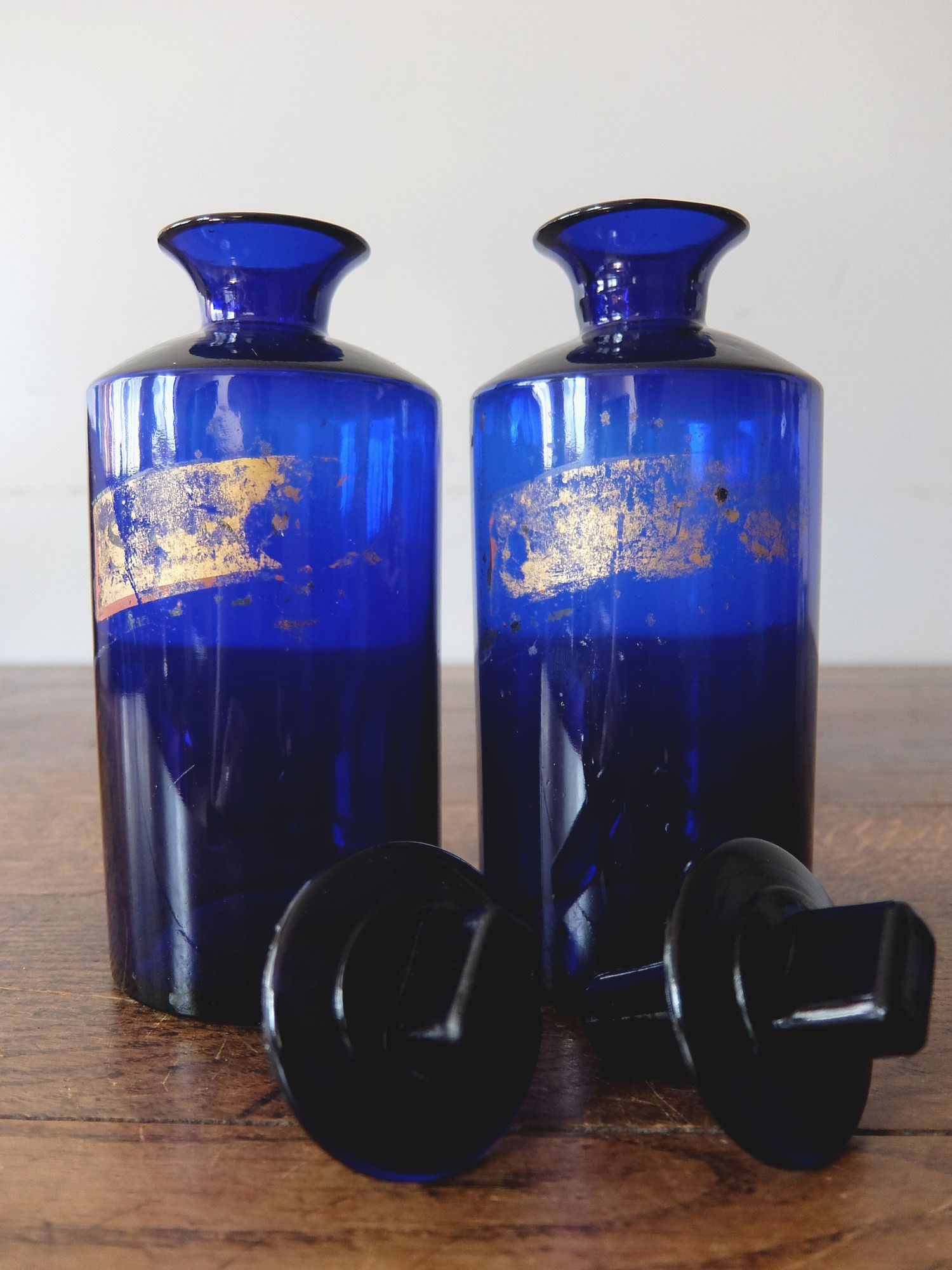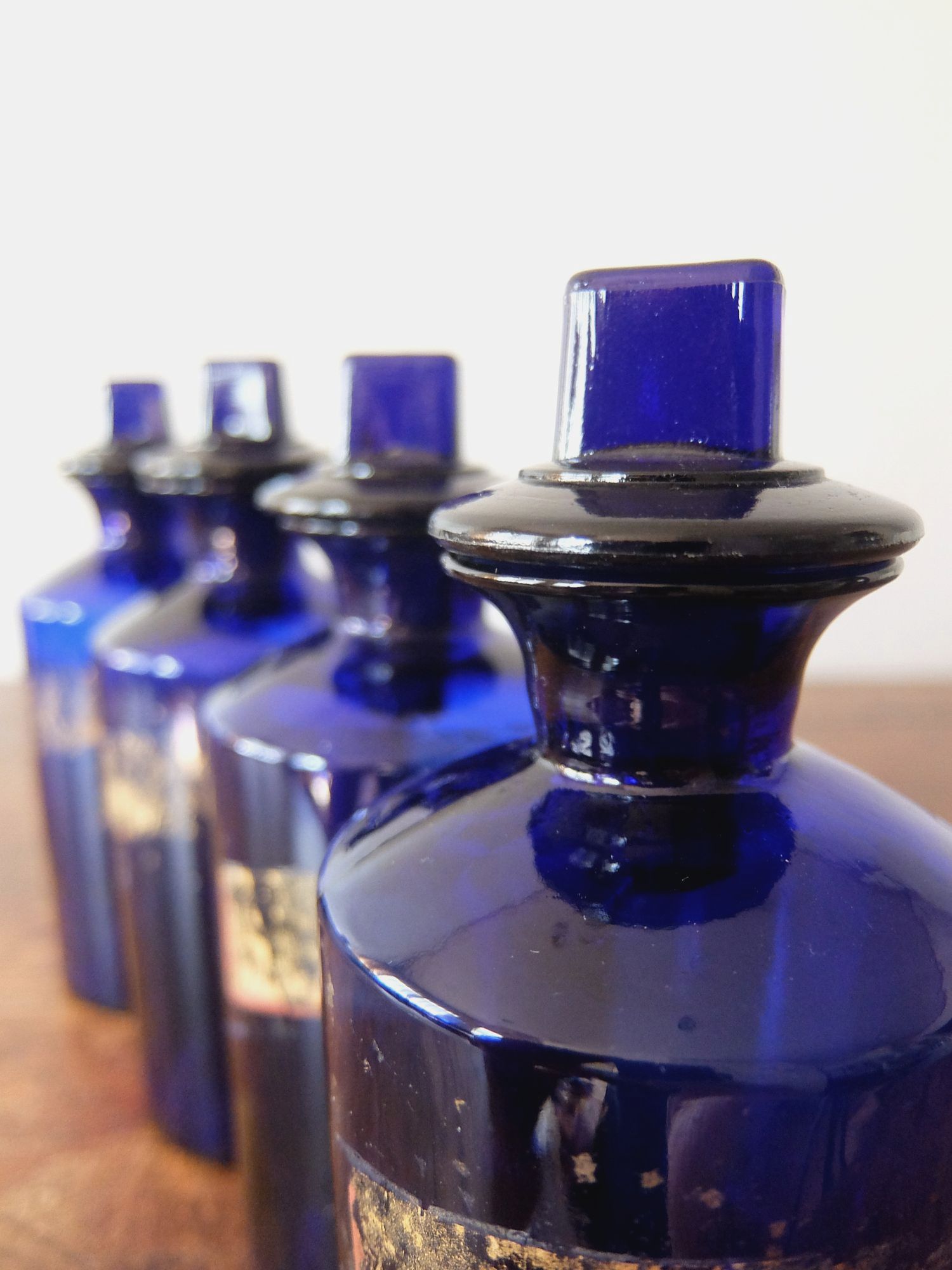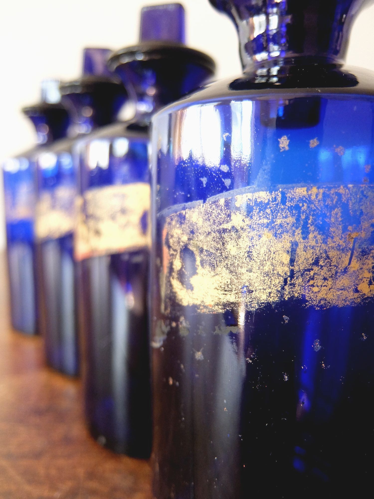 ゴールドのペイントのラベルが印象的なブルーの薬瓶