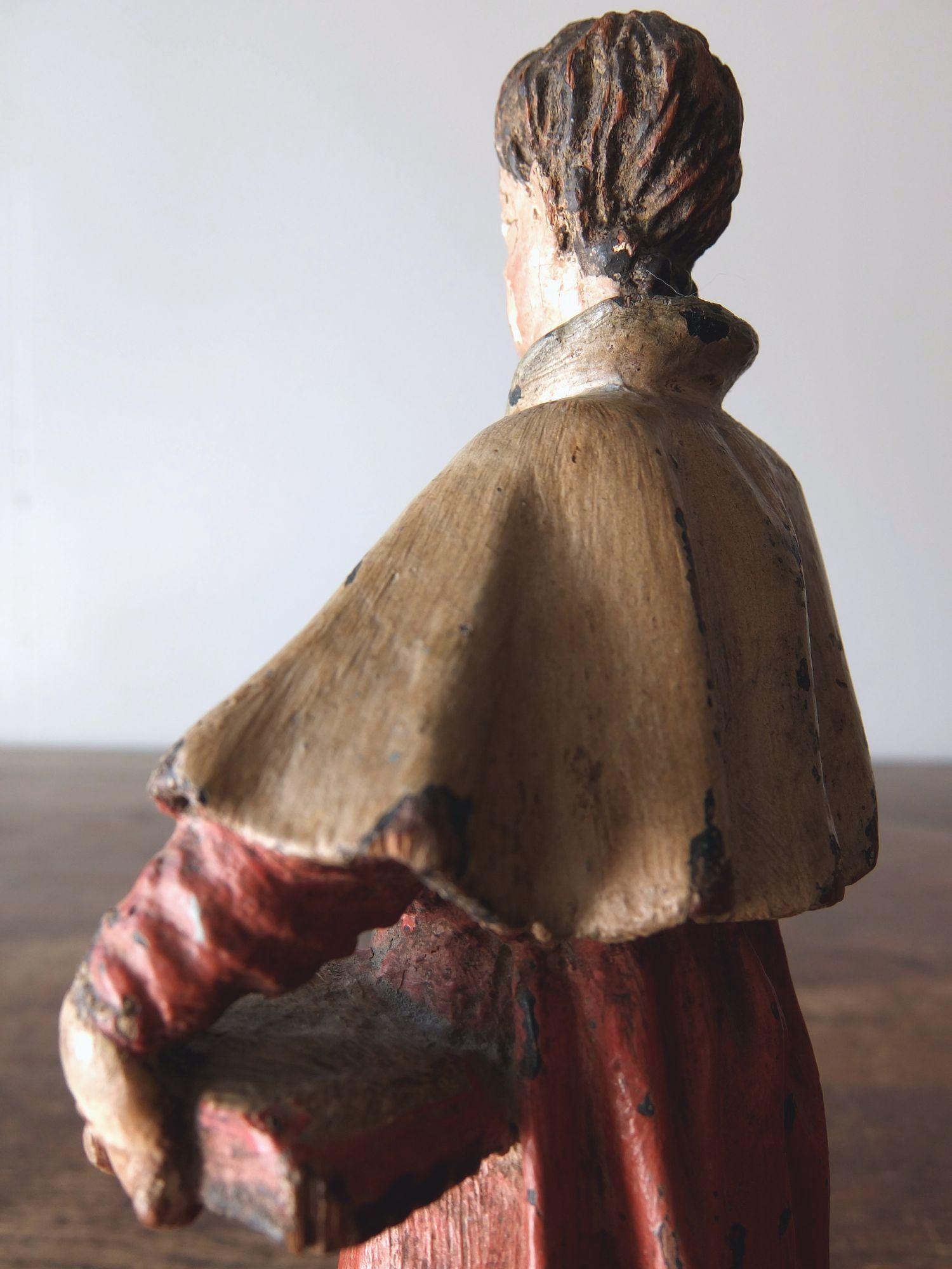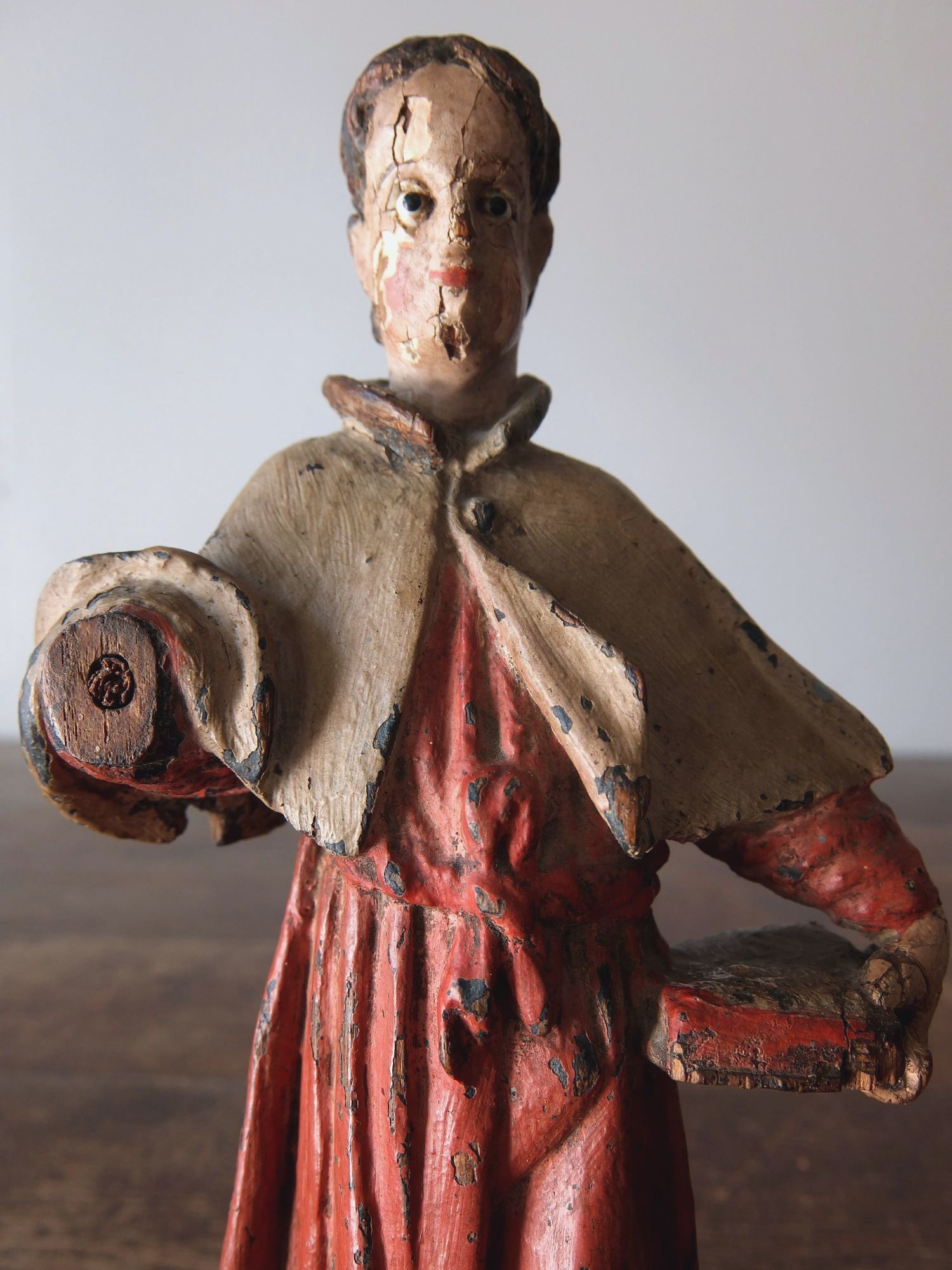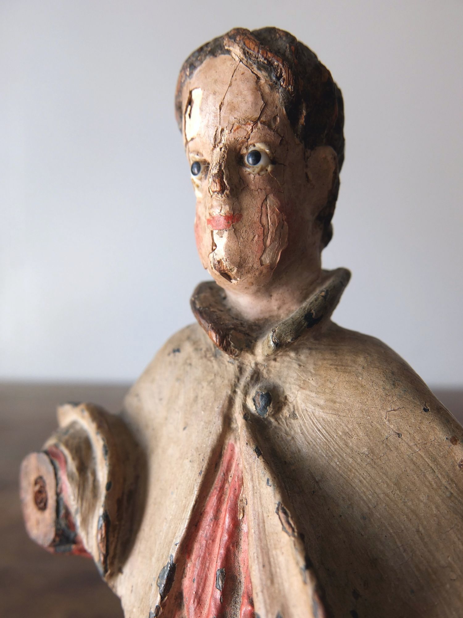 豊かな彩色とグラスアイズの表情が美しい木彫りの聖人像