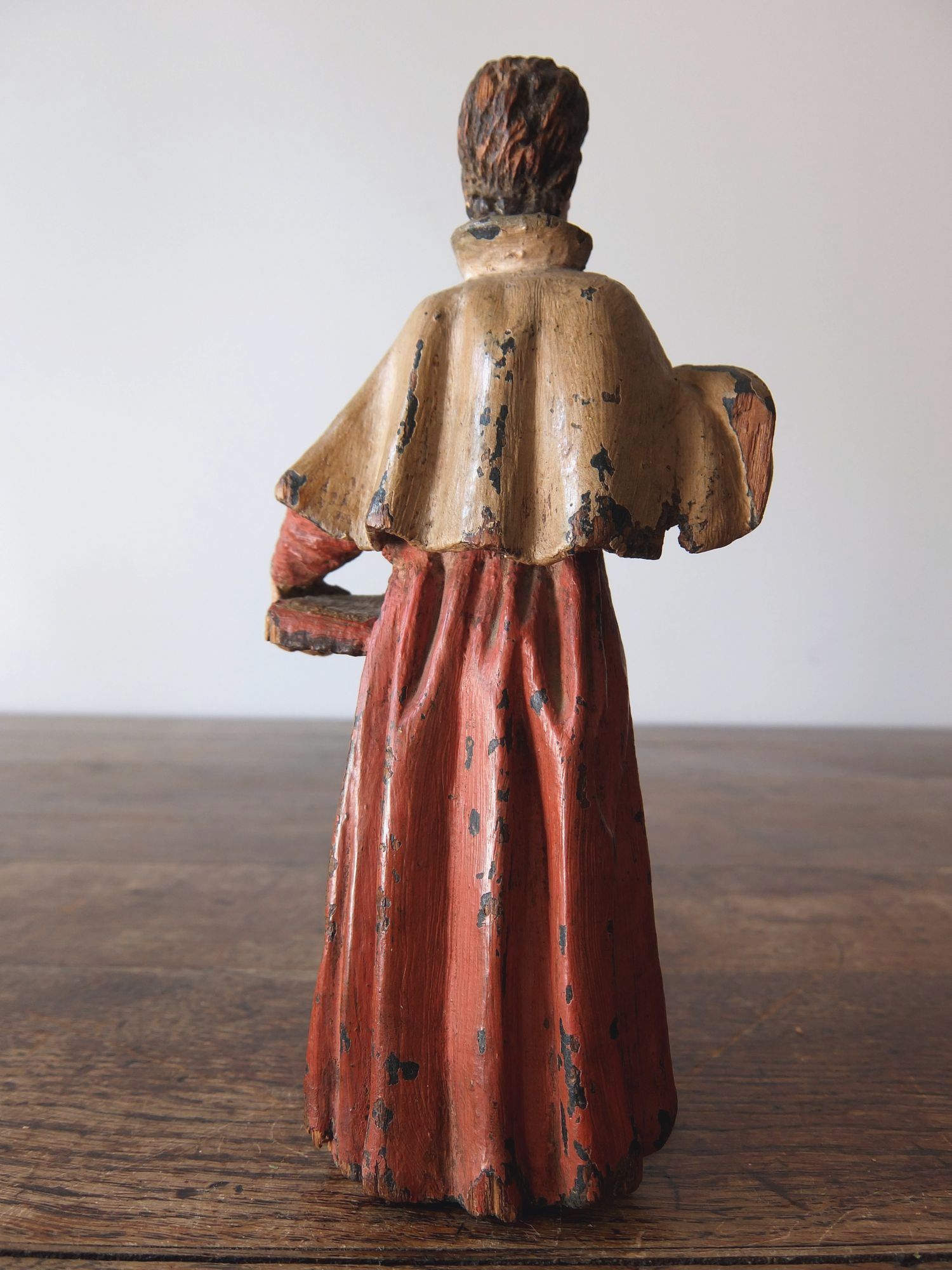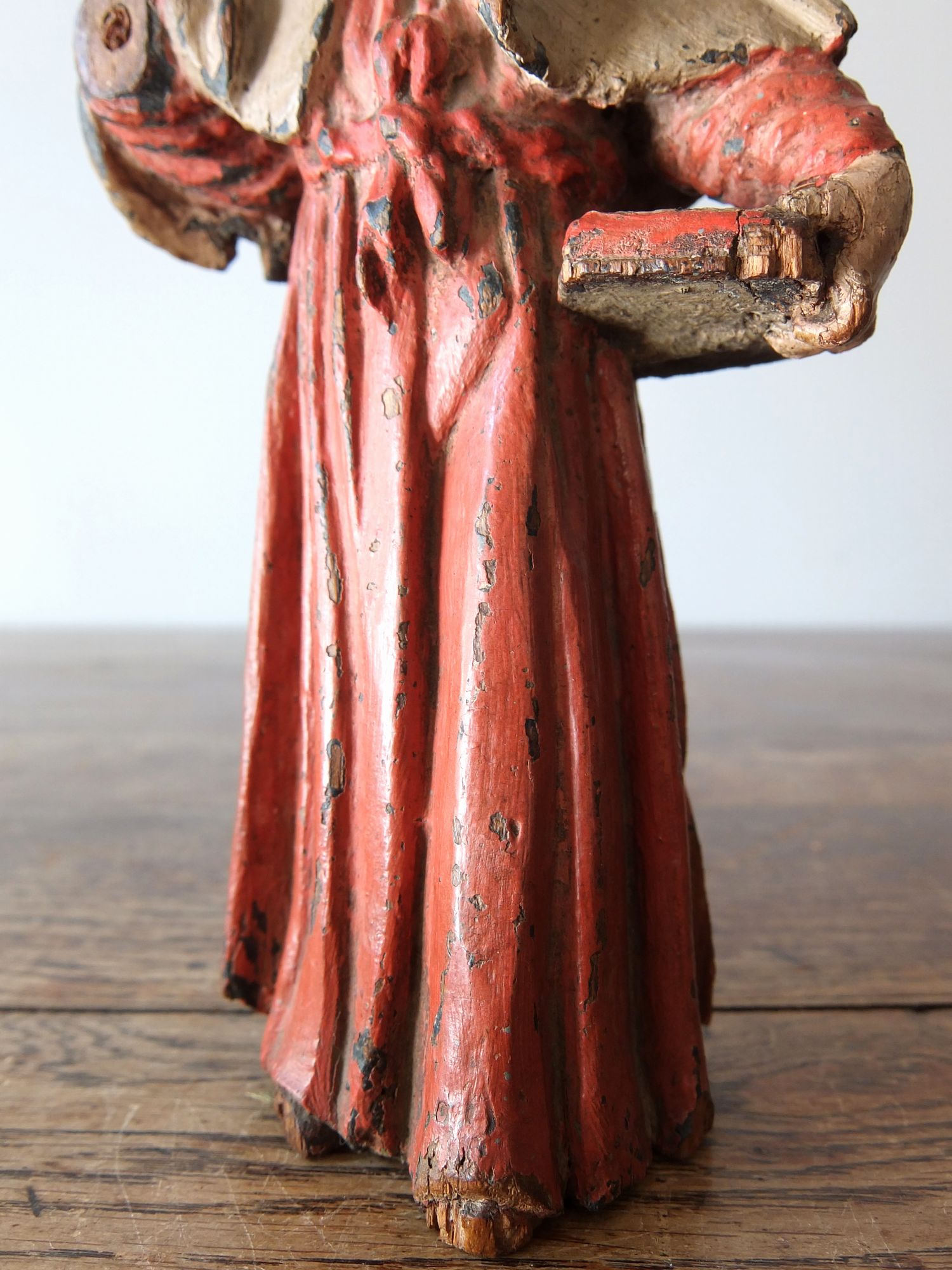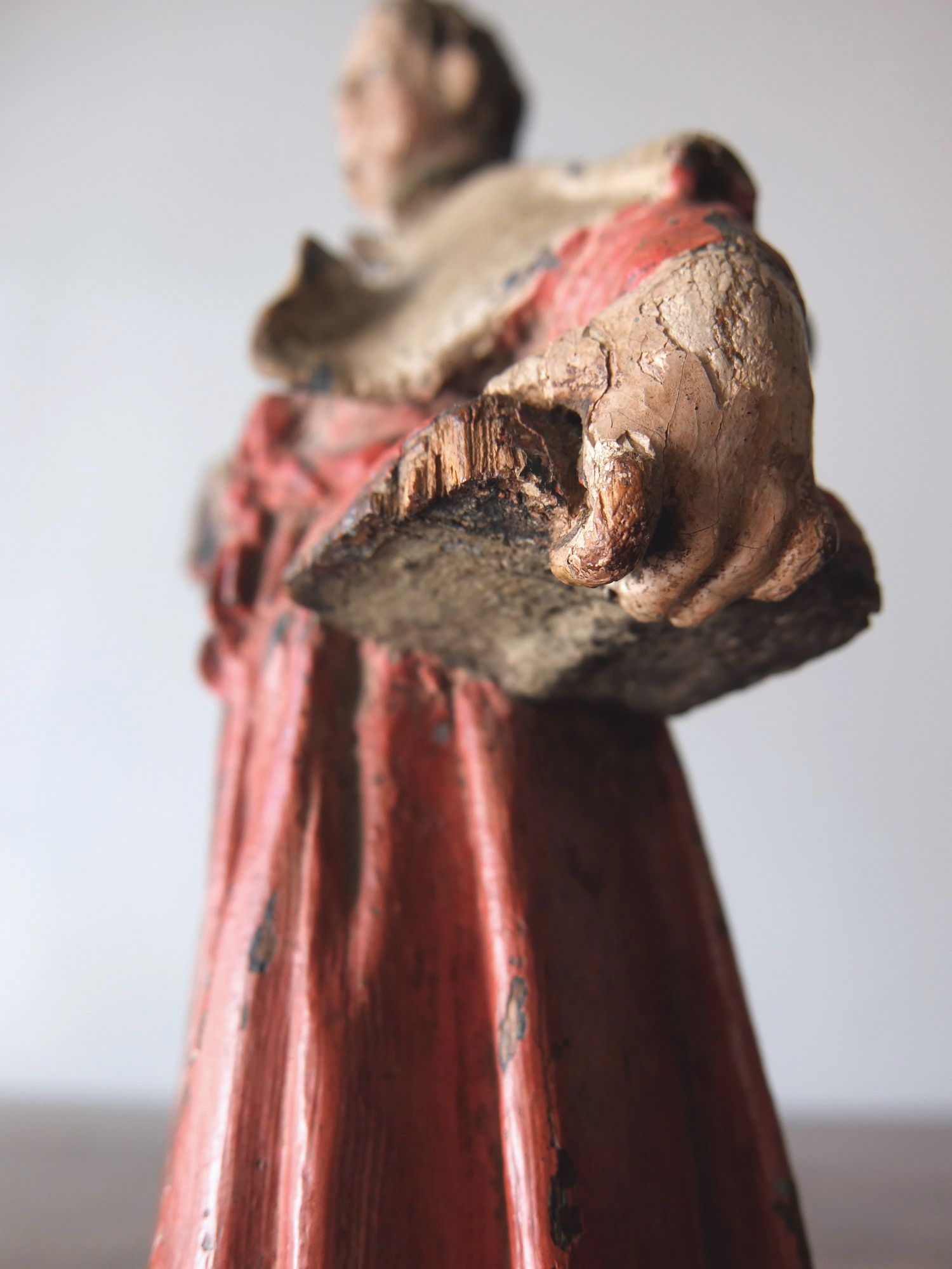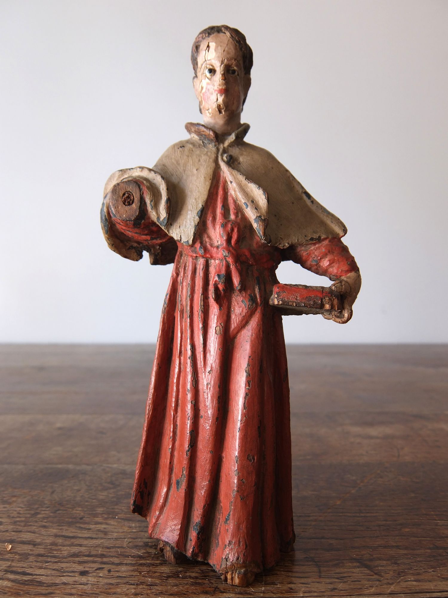 豊かな彩色とグラスアイズの表情が美しい木彫りの聖人像