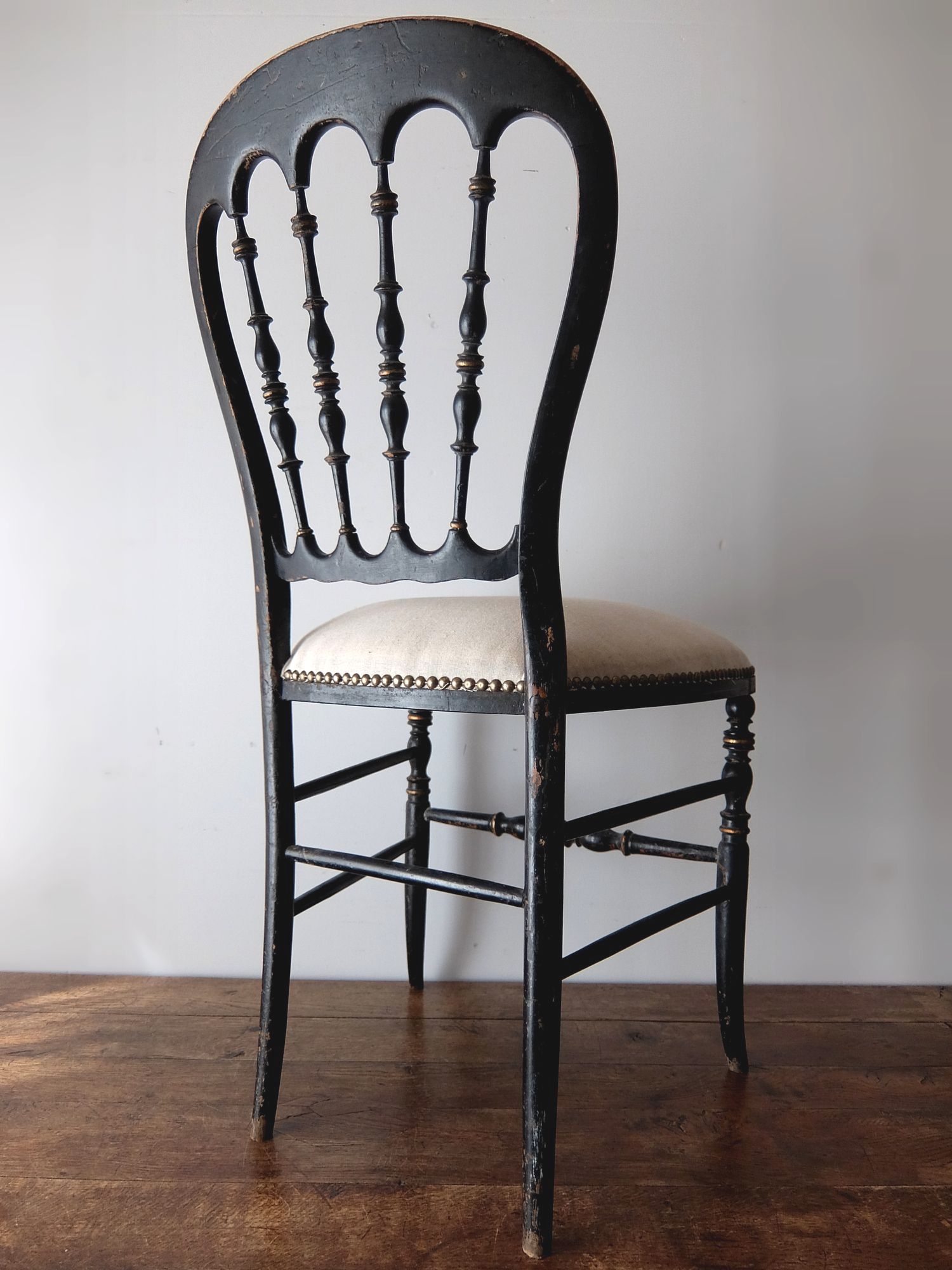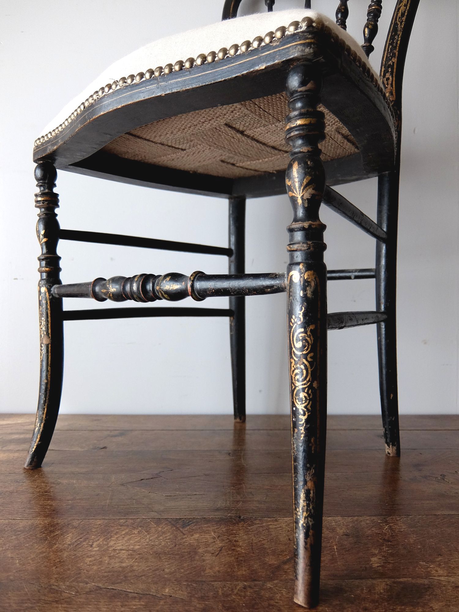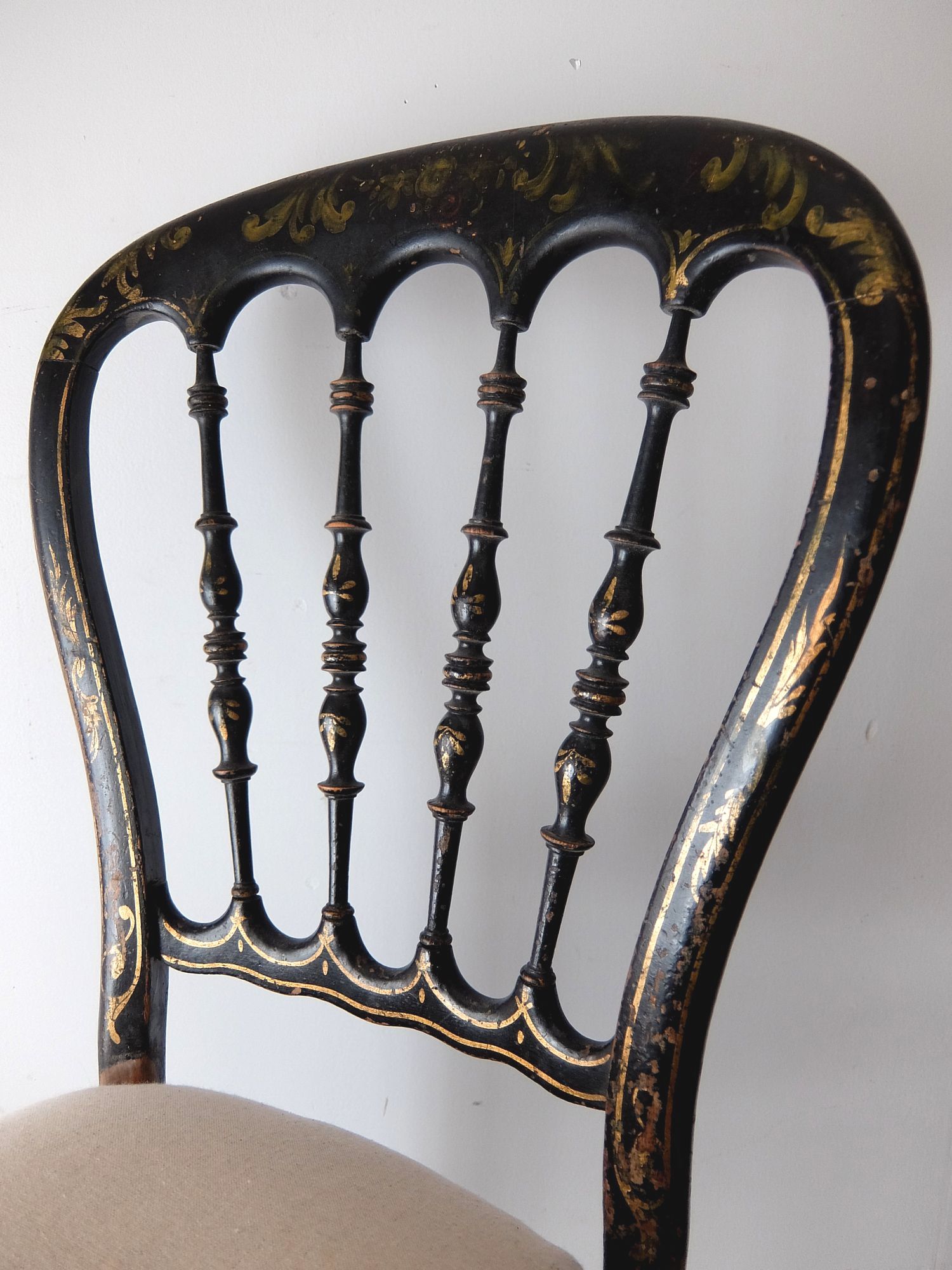 背もたれの意匠と黒と金の塗装が美しいナポレオンⅢ世様式のチェアー