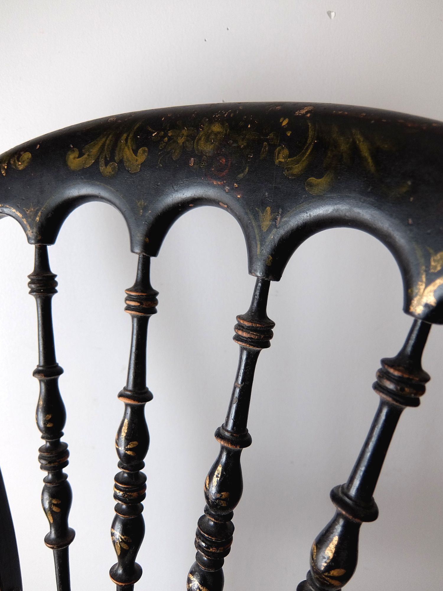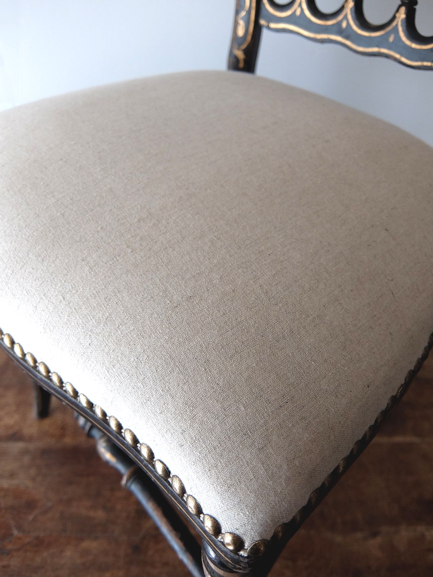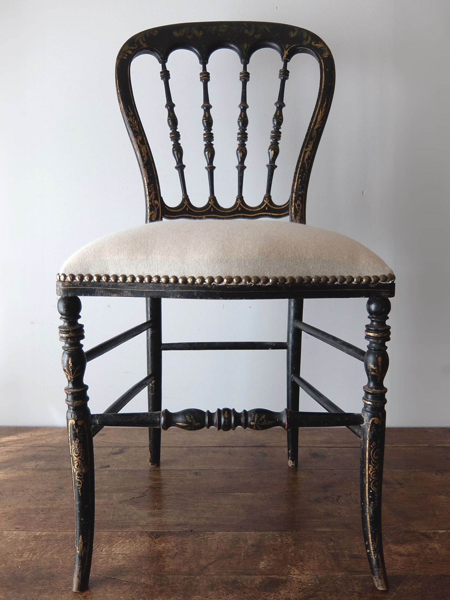 背もたれの意匠と黒と金の塗装が美しいナポレオンⅢ世様式のチェアー