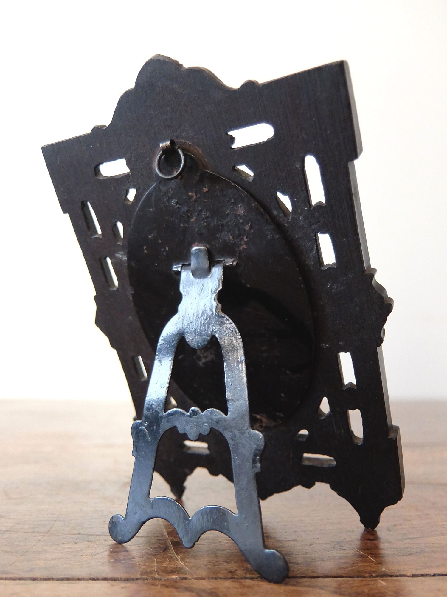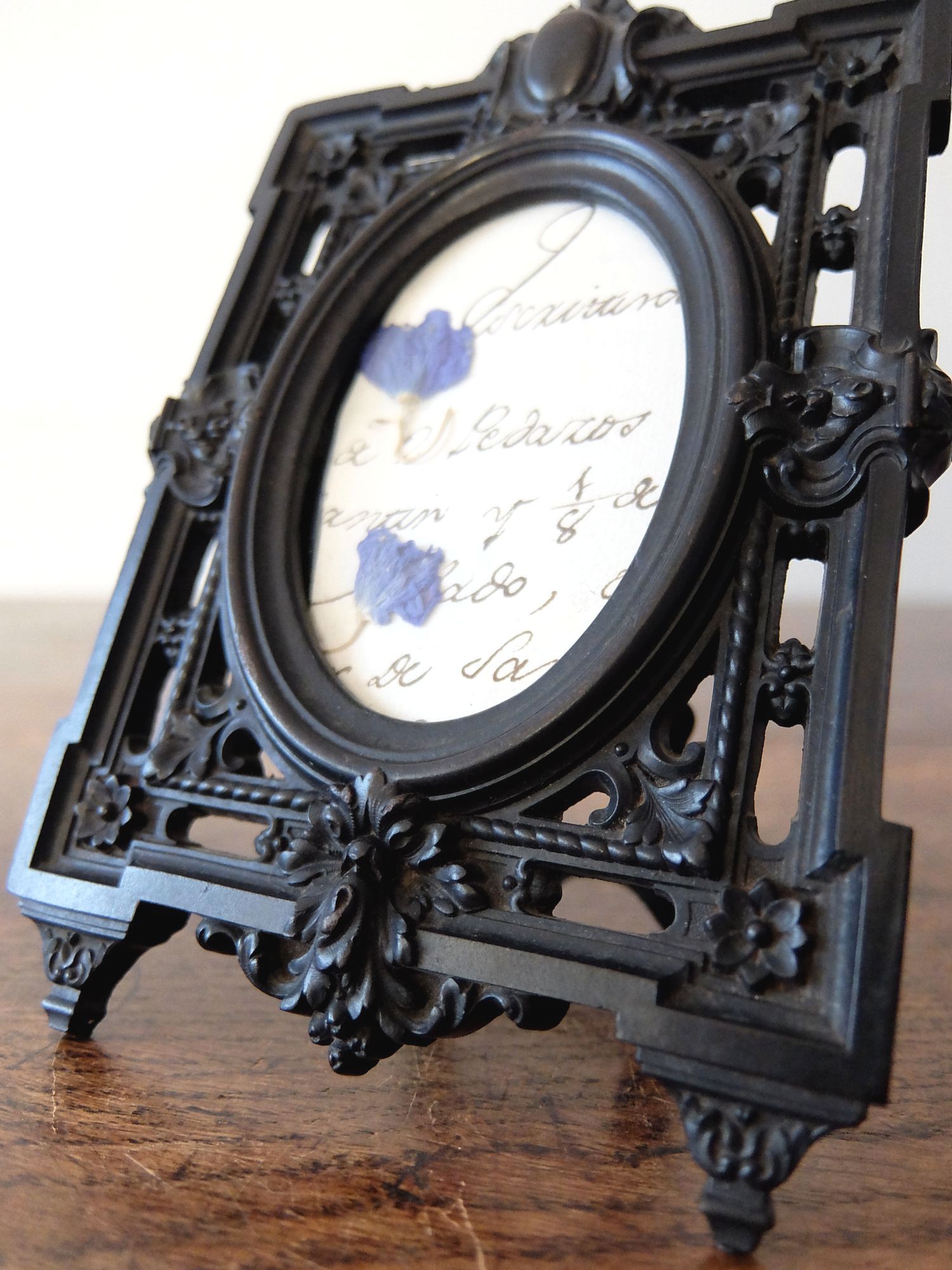 雄牛の血液と木屑を混ぜて熱圧縮した素材【Bois Durci】で作られたナポレオンⅢ世様式の写真たて(古紙・ドライフラワー入り)
