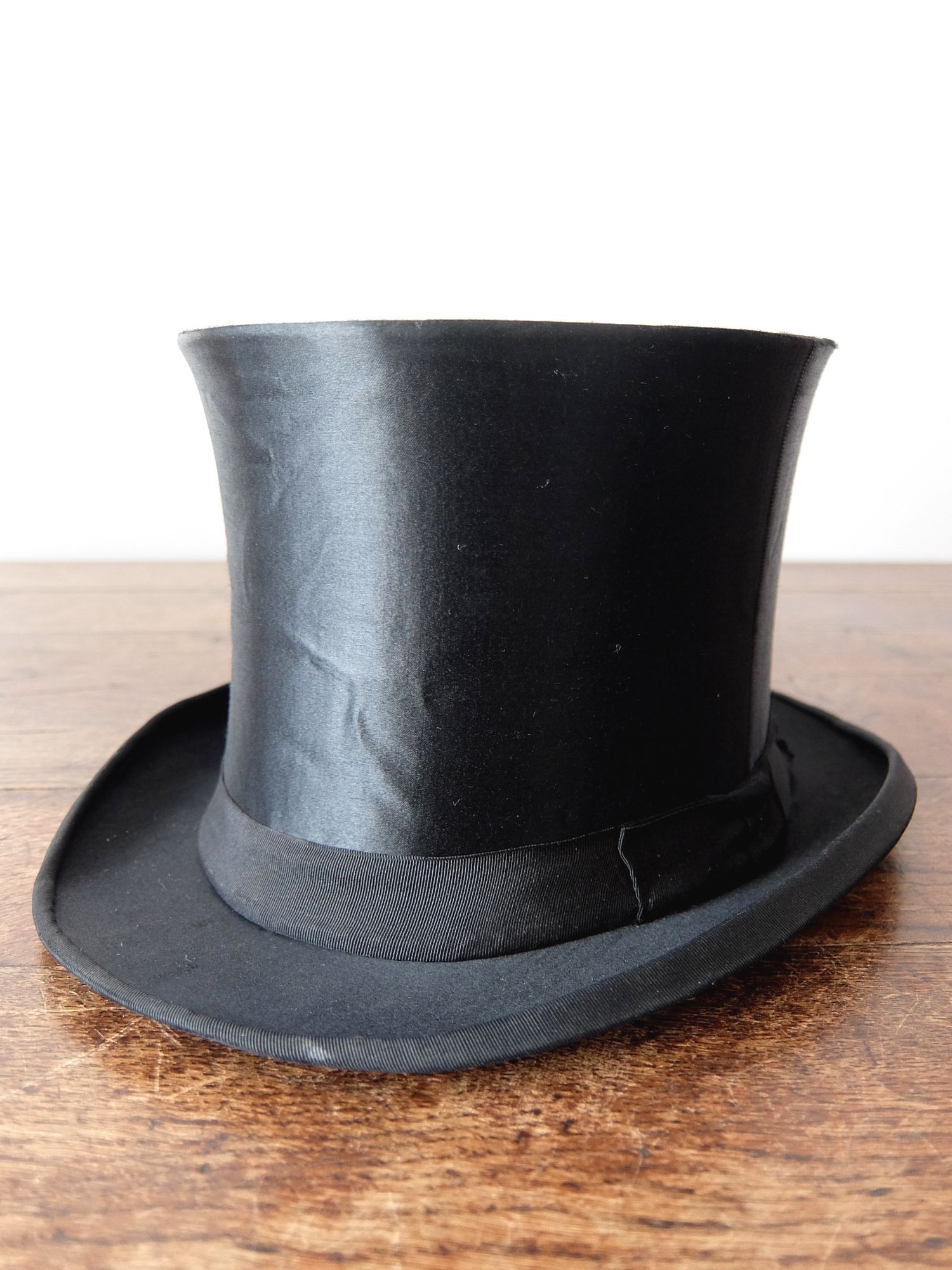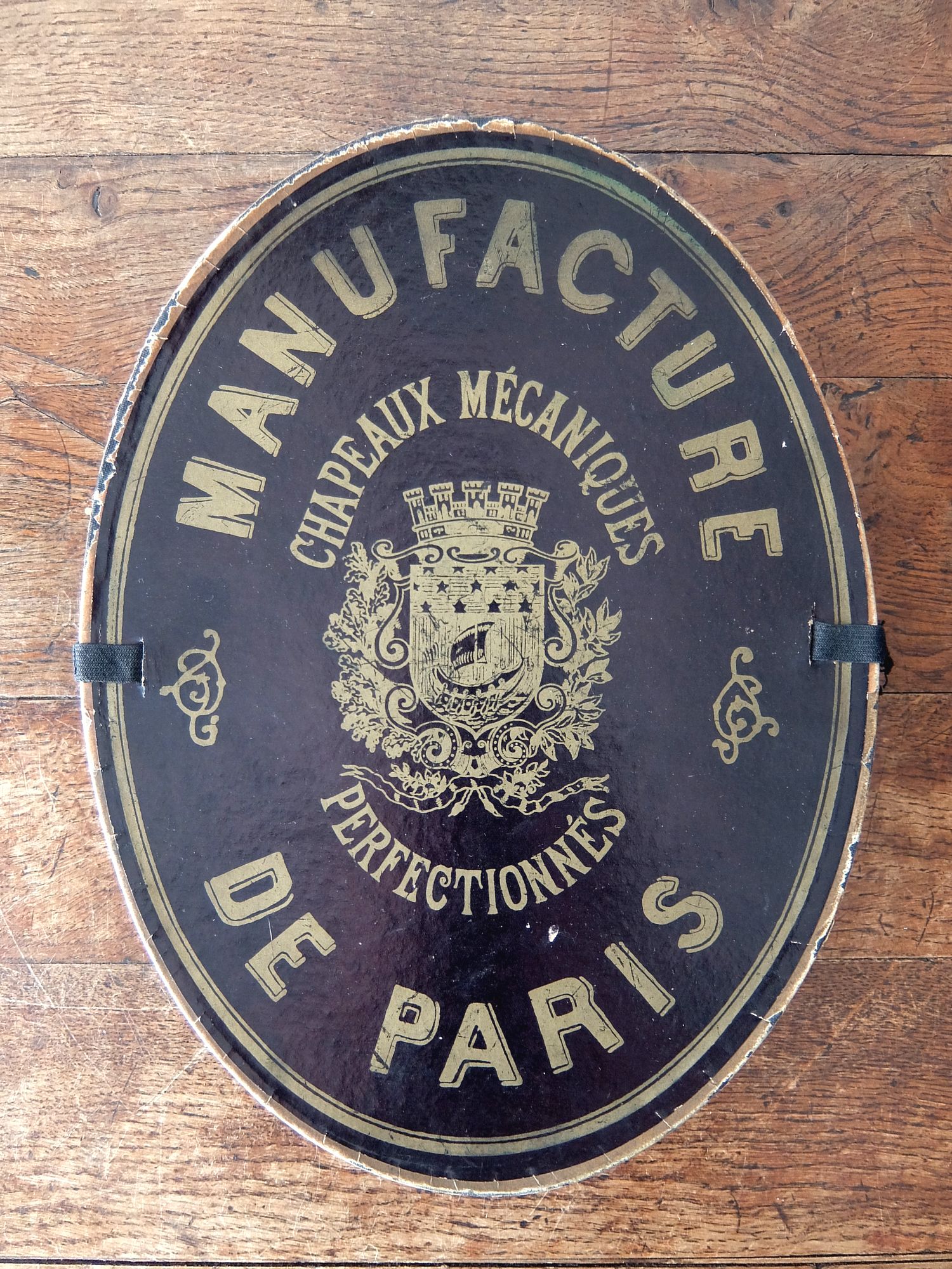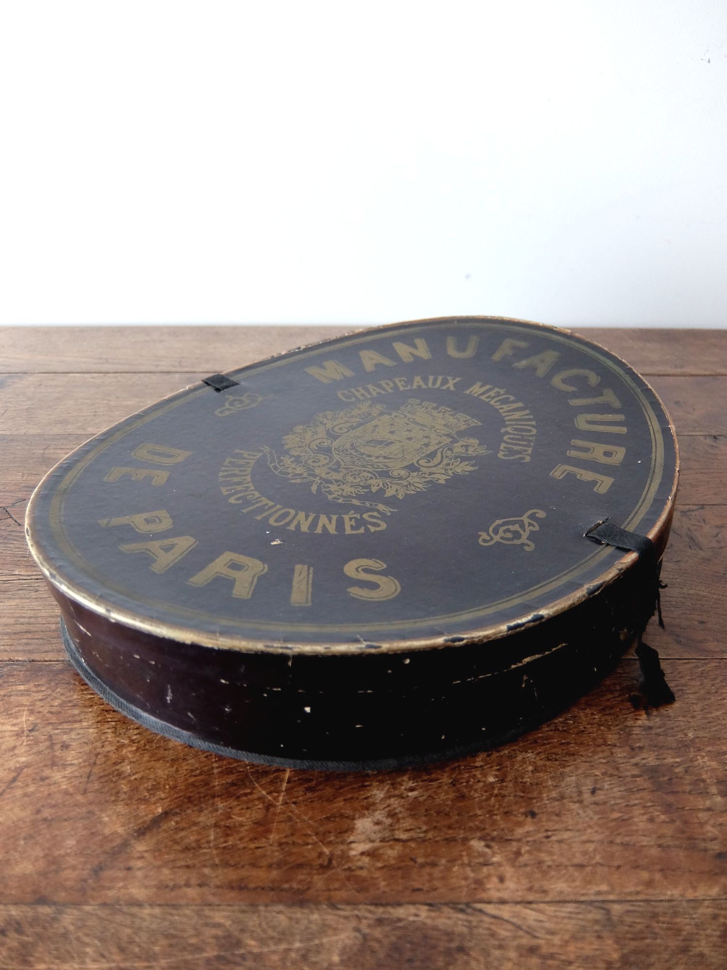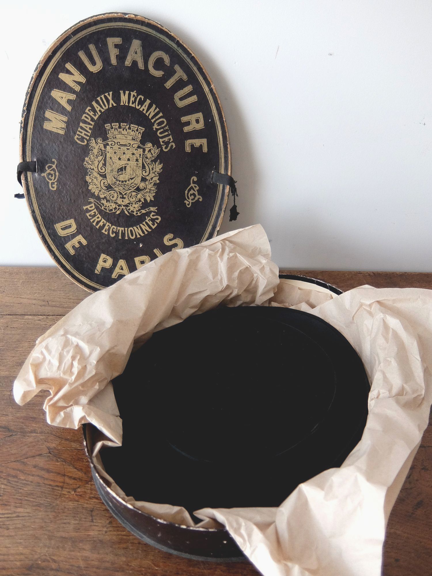 雰囲気のある素敵な【Manufacture Chapeaux Mecaniques Perfectionns de Paris】社の紙箱と折り畳み式のシルクハット