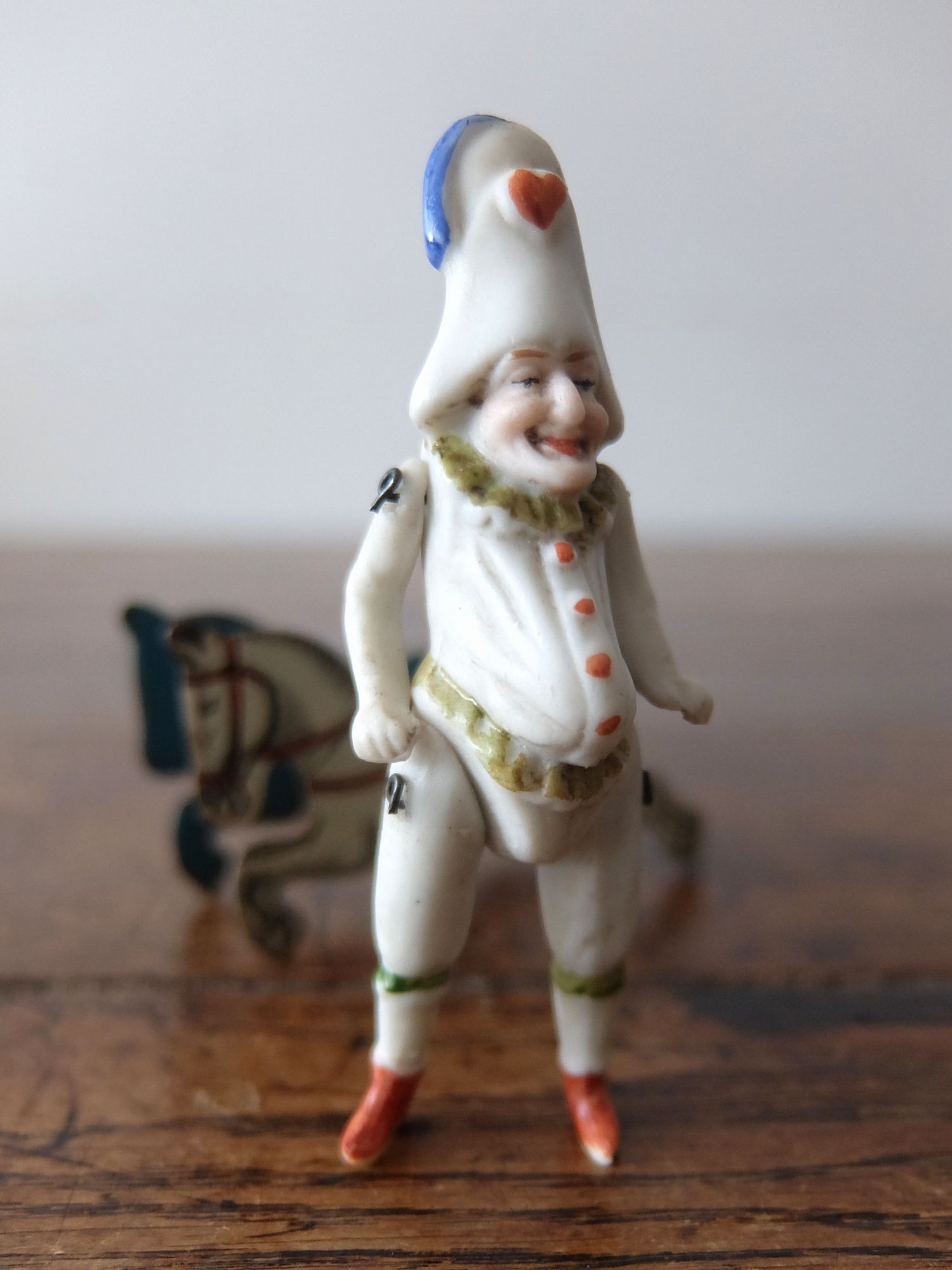 可愛らしい恰好のハーレクイン(道化師)のミニョネットとブリキ製の白馬