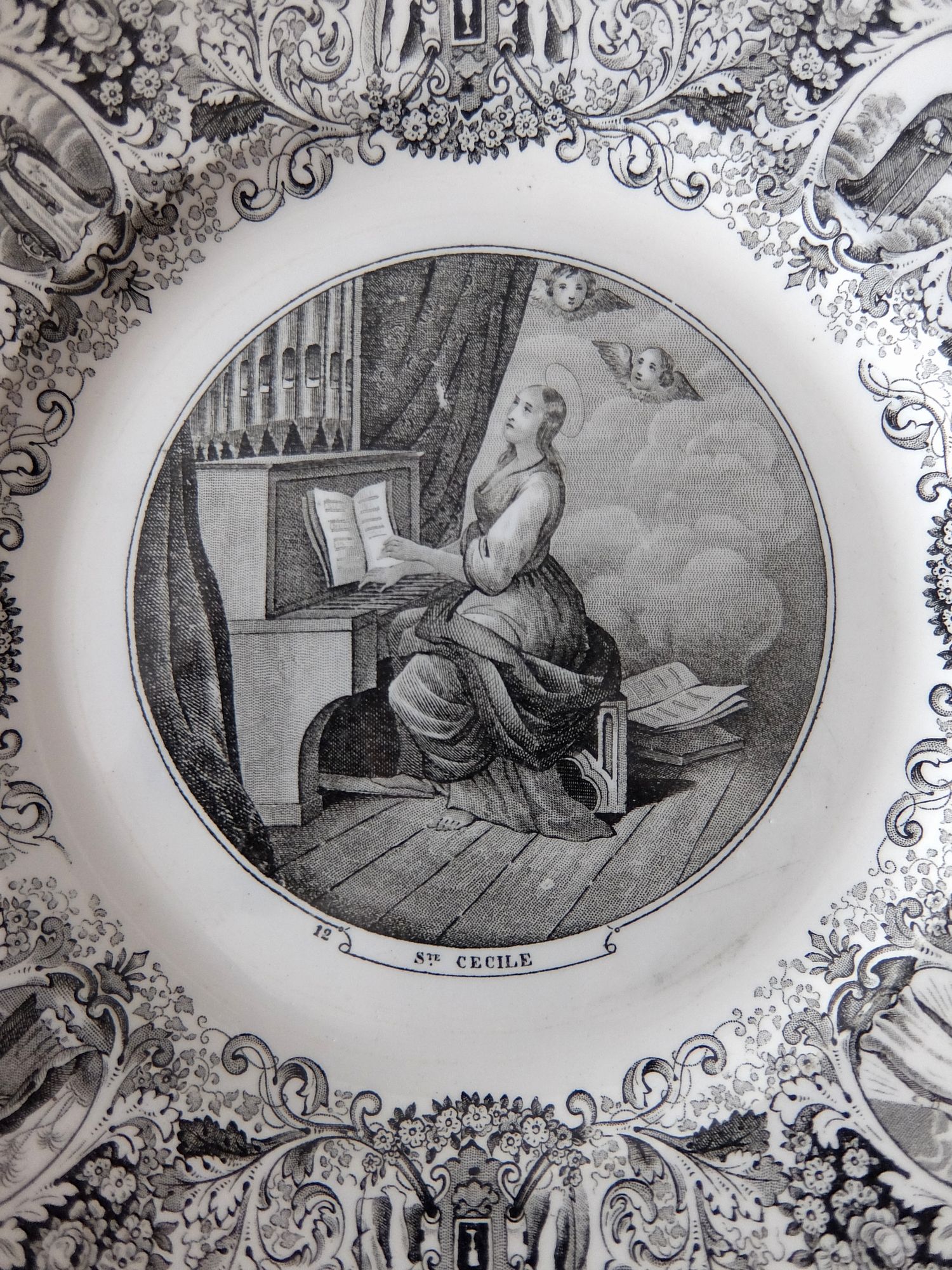 19世紀中期に作られた聖人が描かれたクレイユ・エ・モントローのGrisailleの平皿【No.4:聖マタイ、No.7:聖ジャン、No.12:聖セシリア】