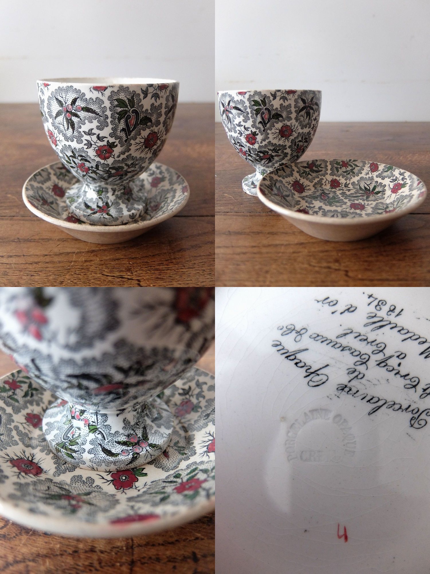 鳥と植物の絵柄が美しいクレイユのカップ&ソーサー(ホットチョコレート用)とシュガーボウルのセット