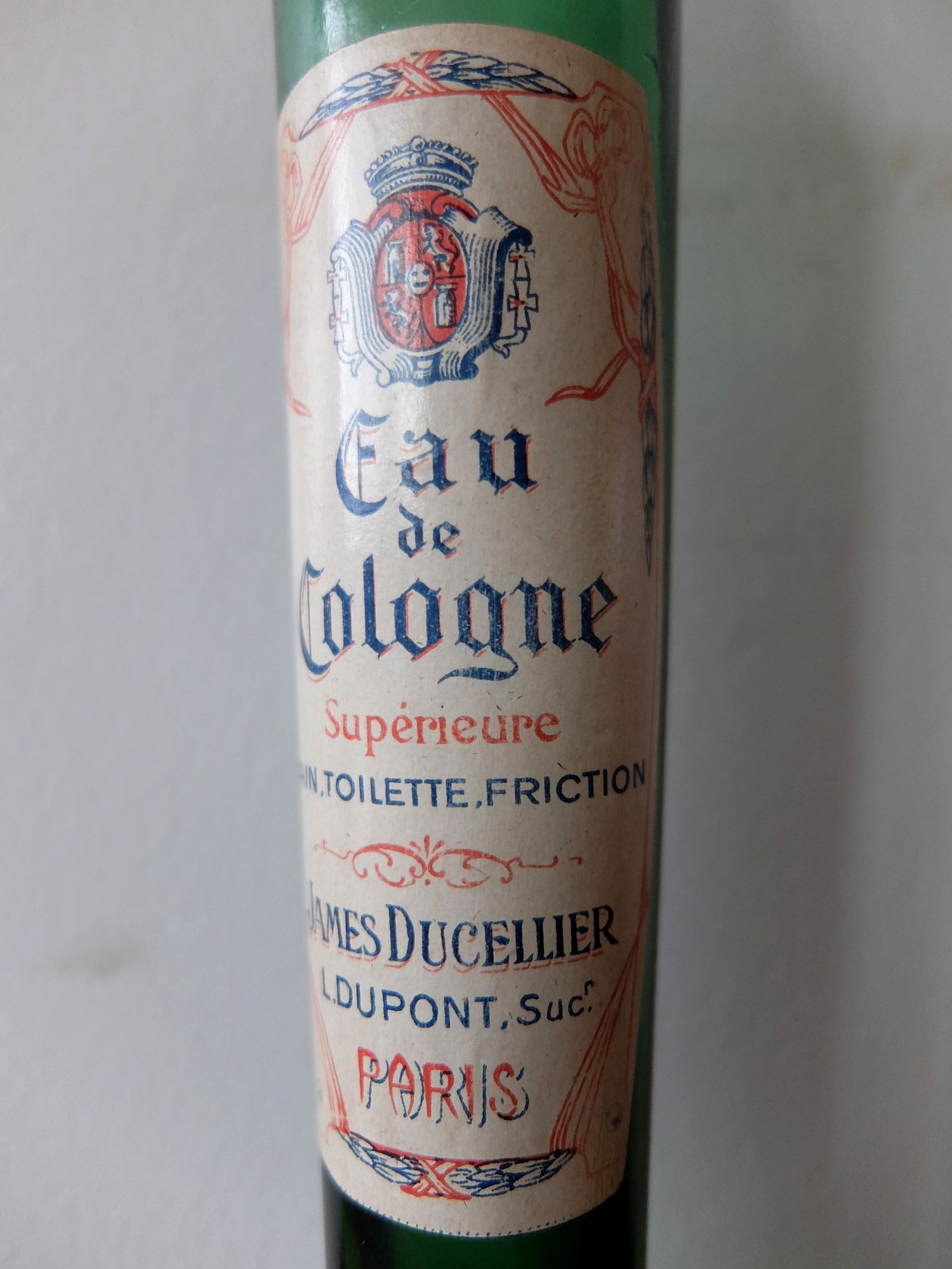 雰囲気のあるラベルが魅力的な細長い香水瓶