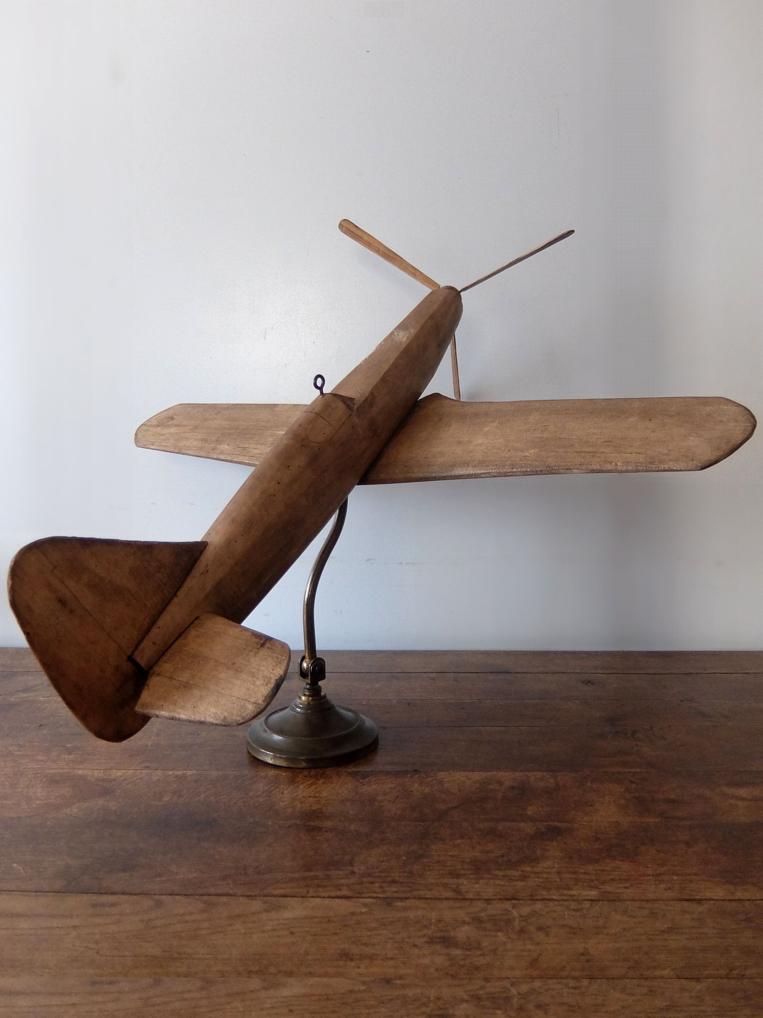 朽ちた風合いが美しいプロペラ機の木製模型