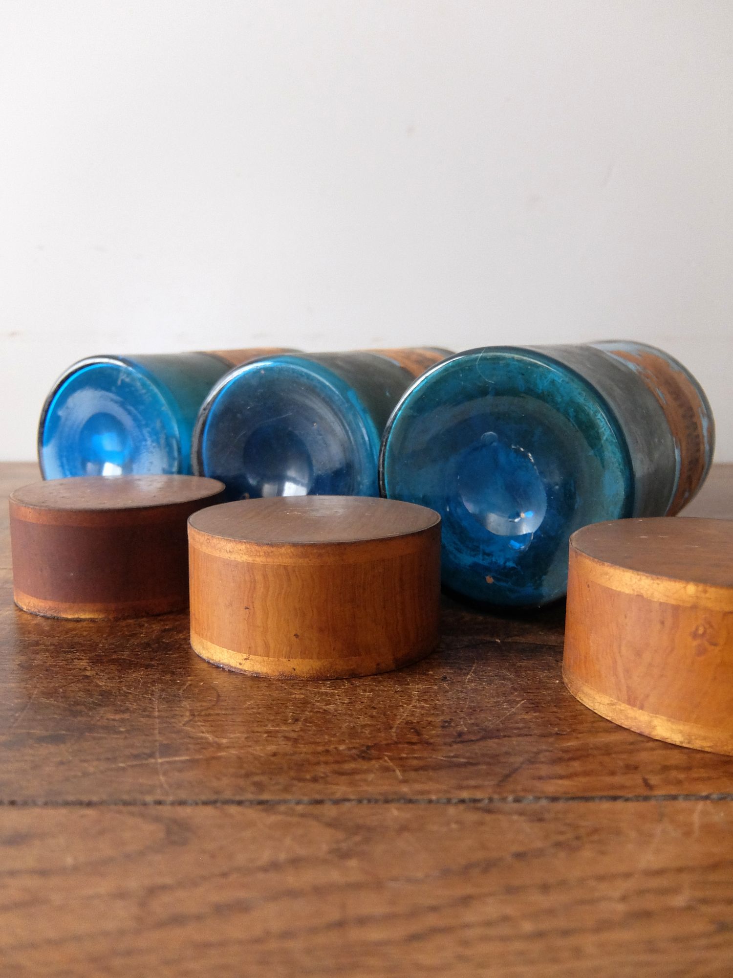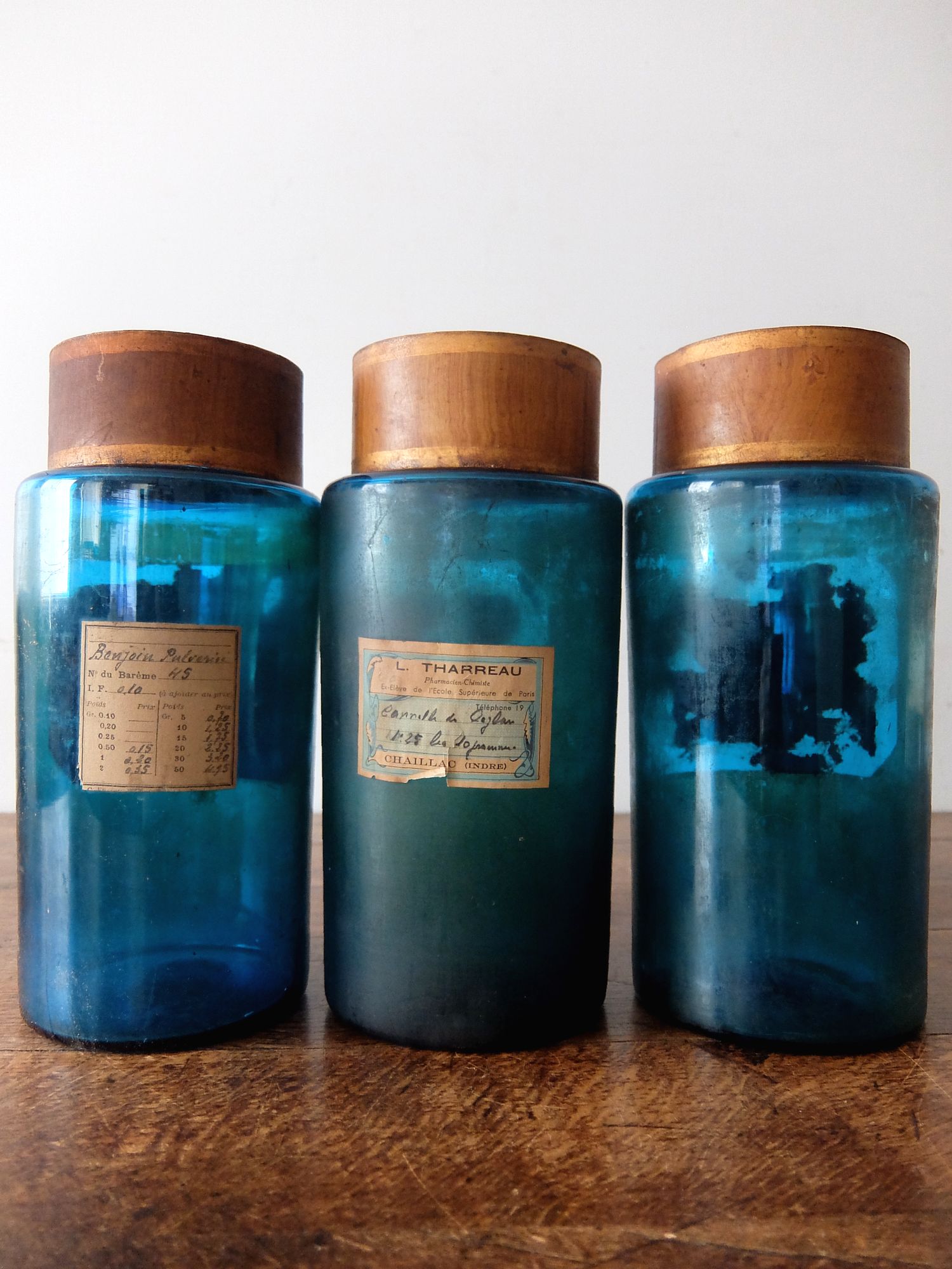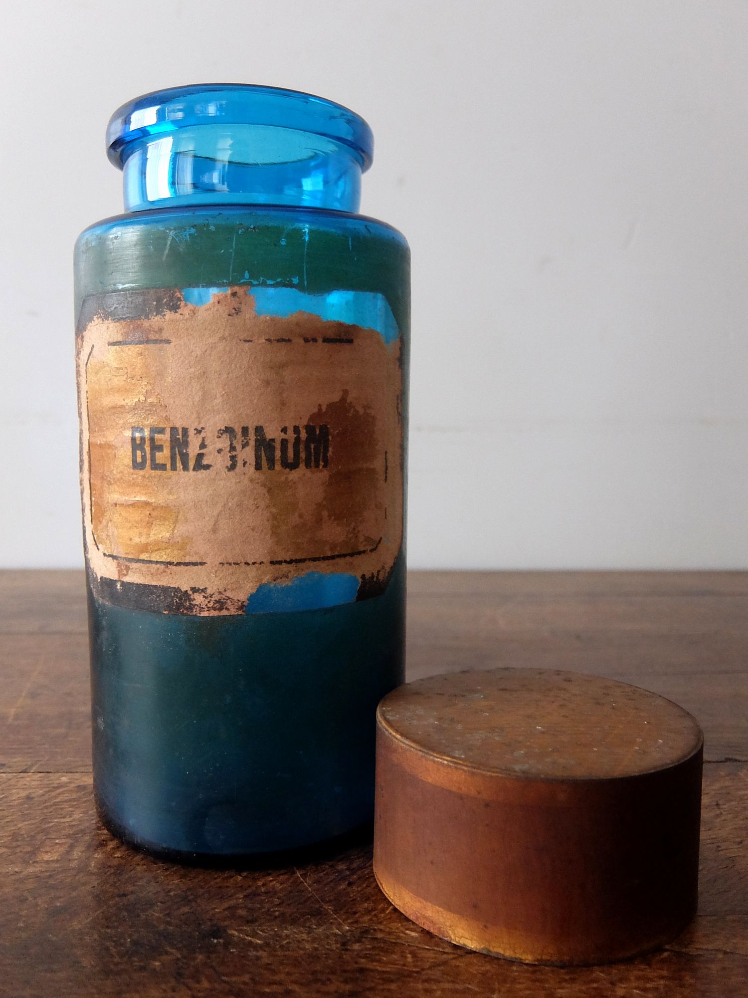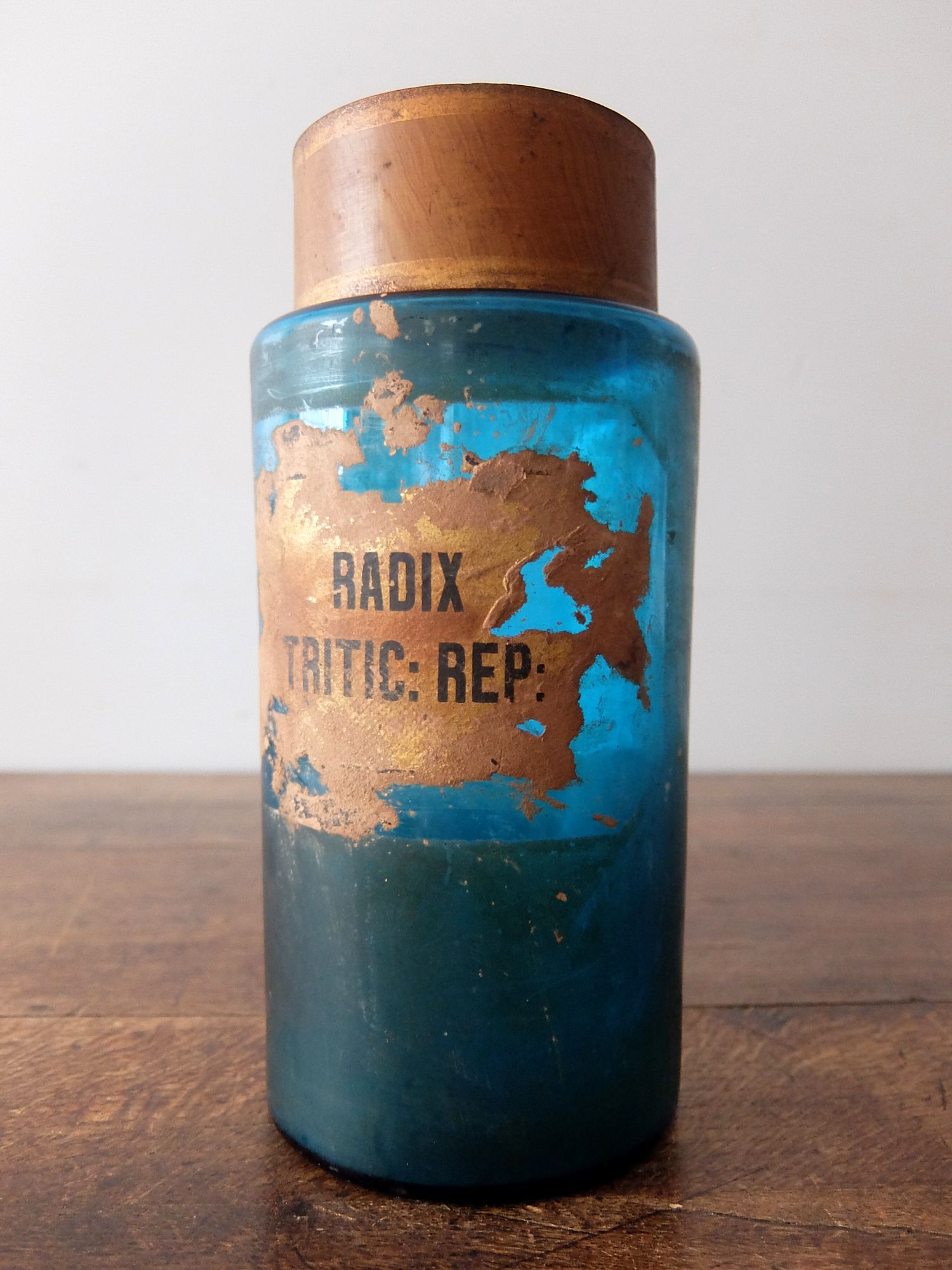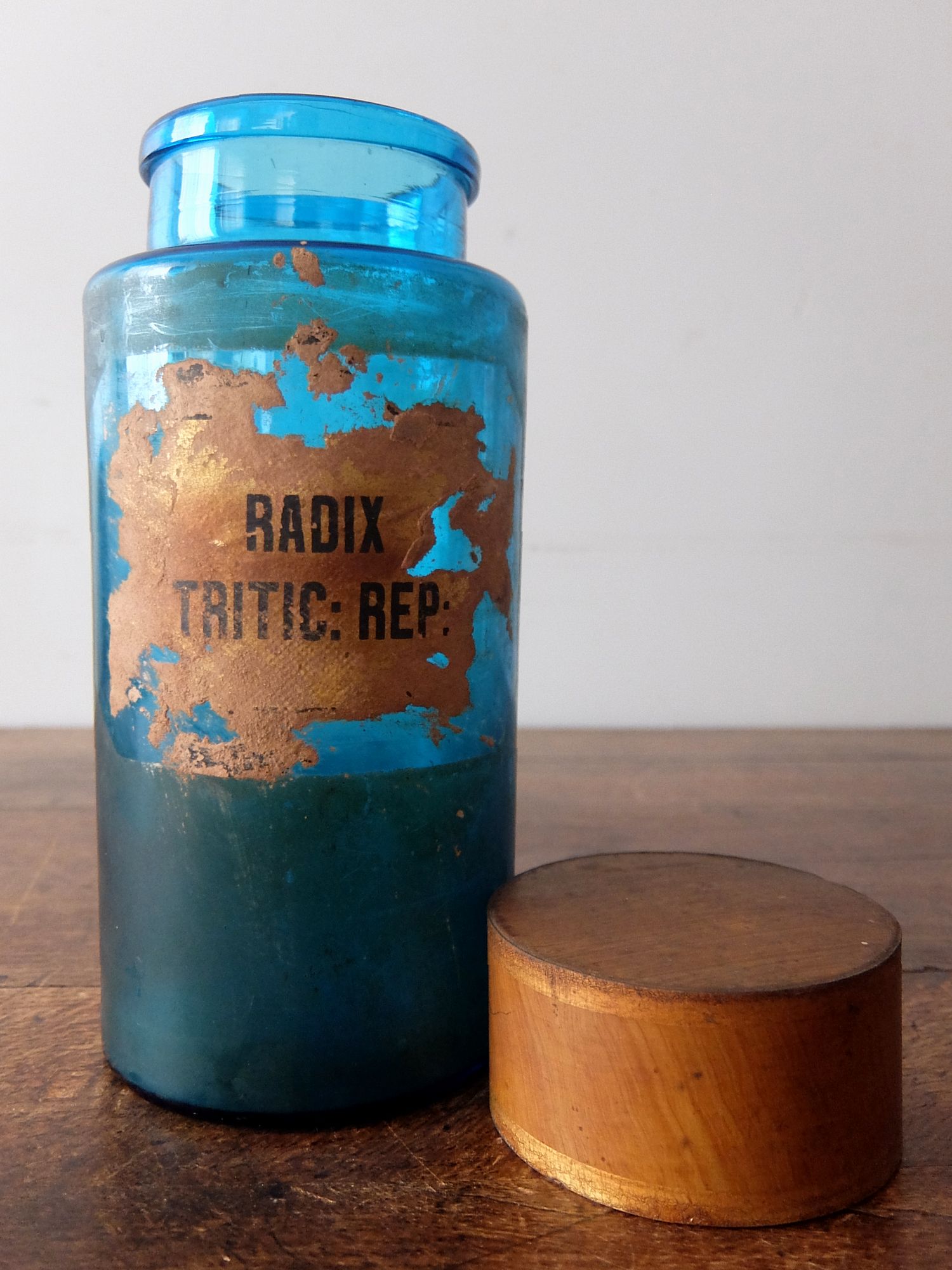朽ちたラベルが印象的な淡いブルーの薬瓶