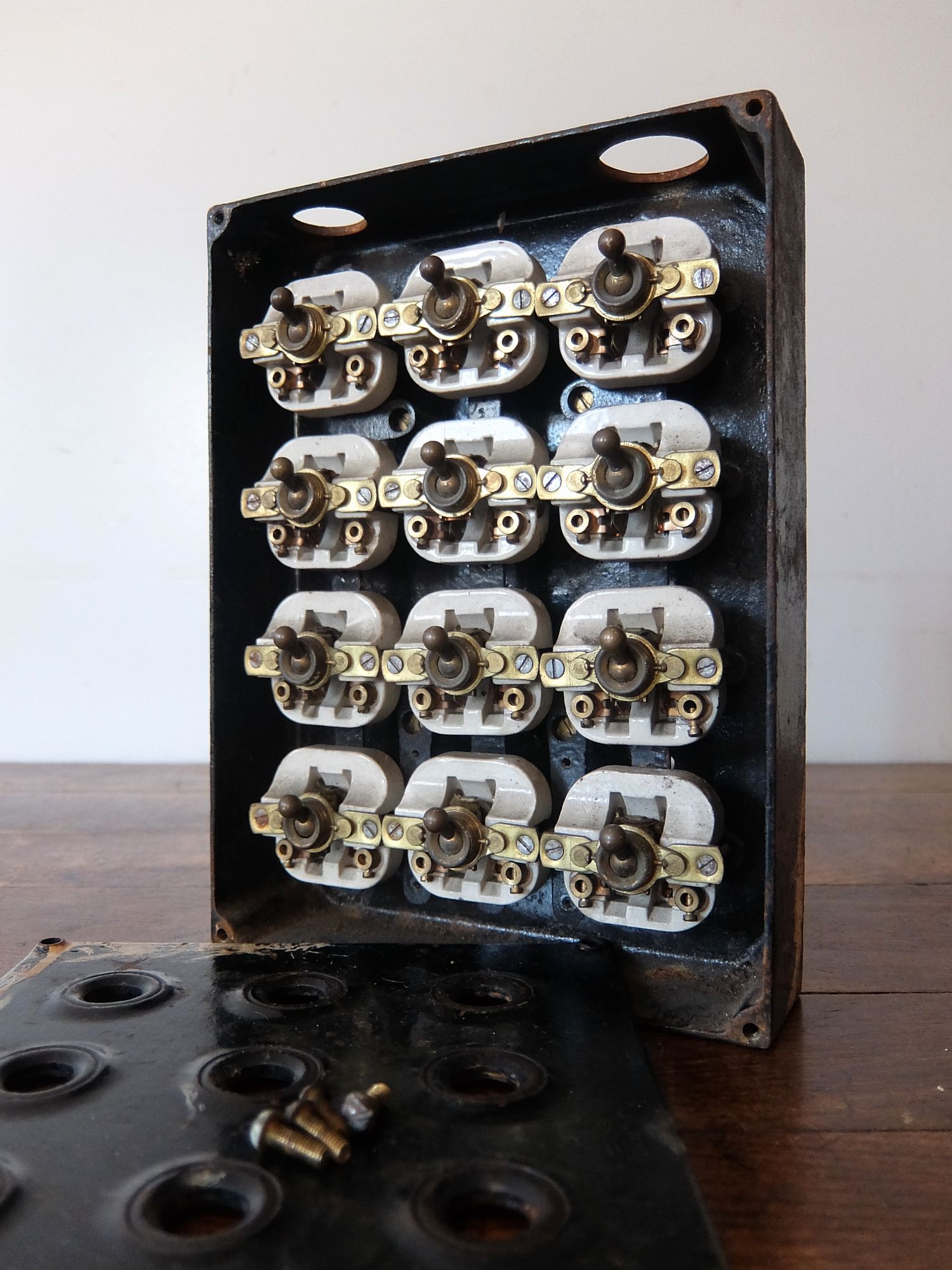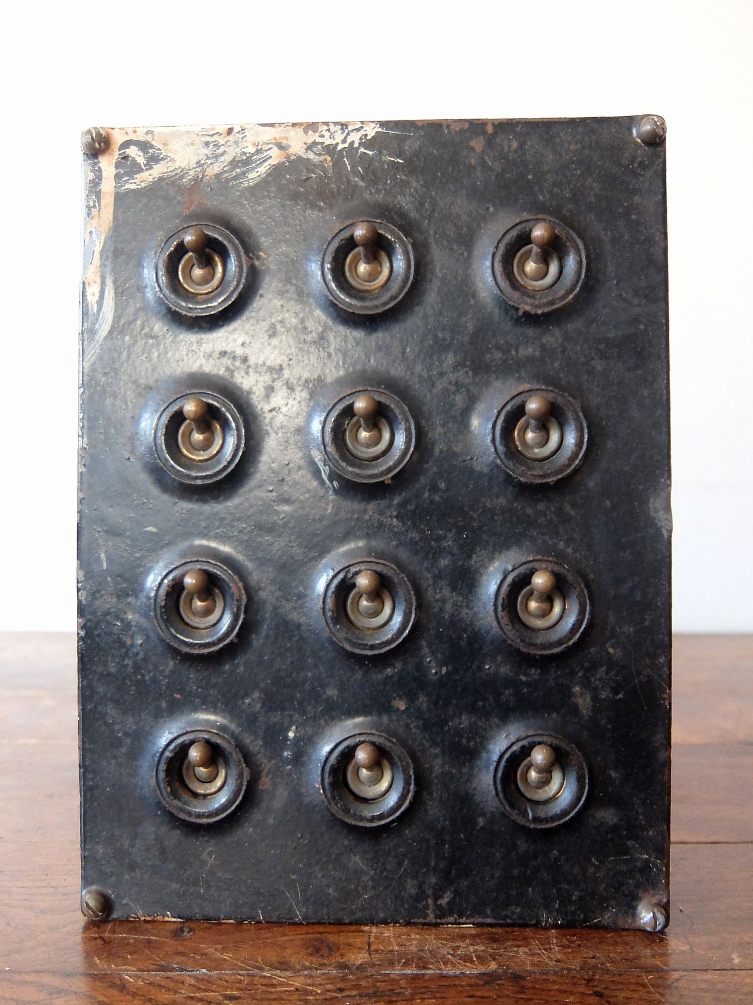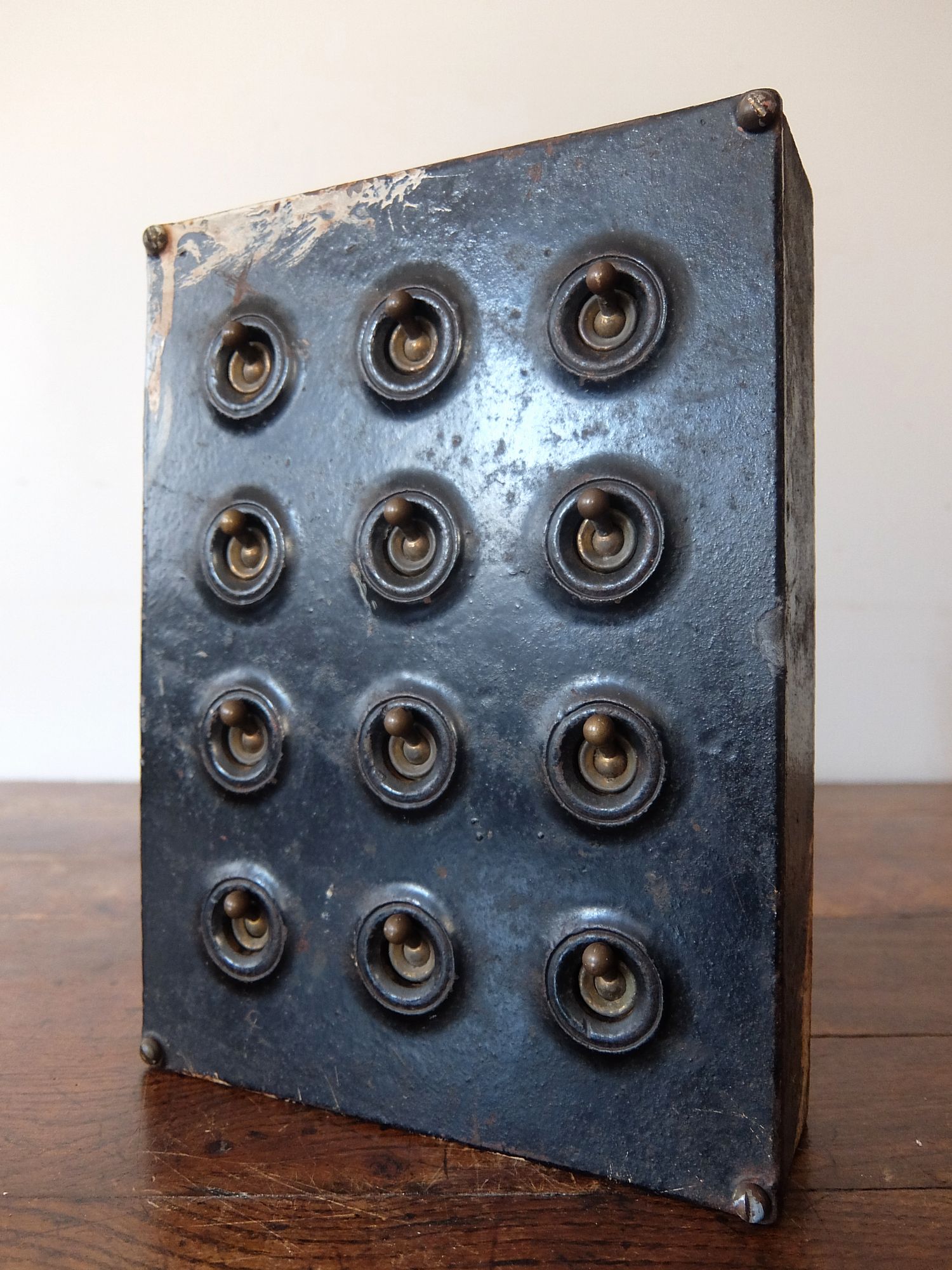 鉄のケースに収まった工業系の12連スイッチ