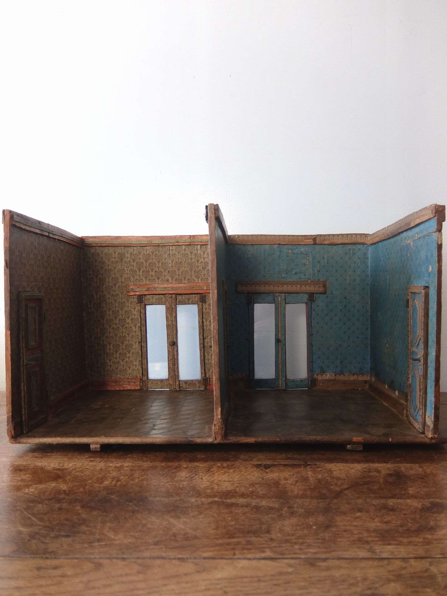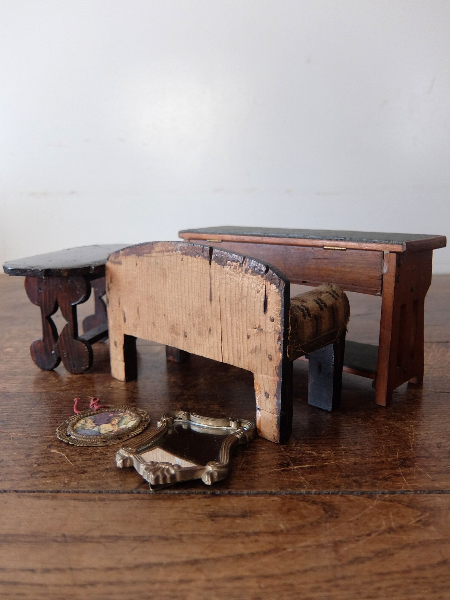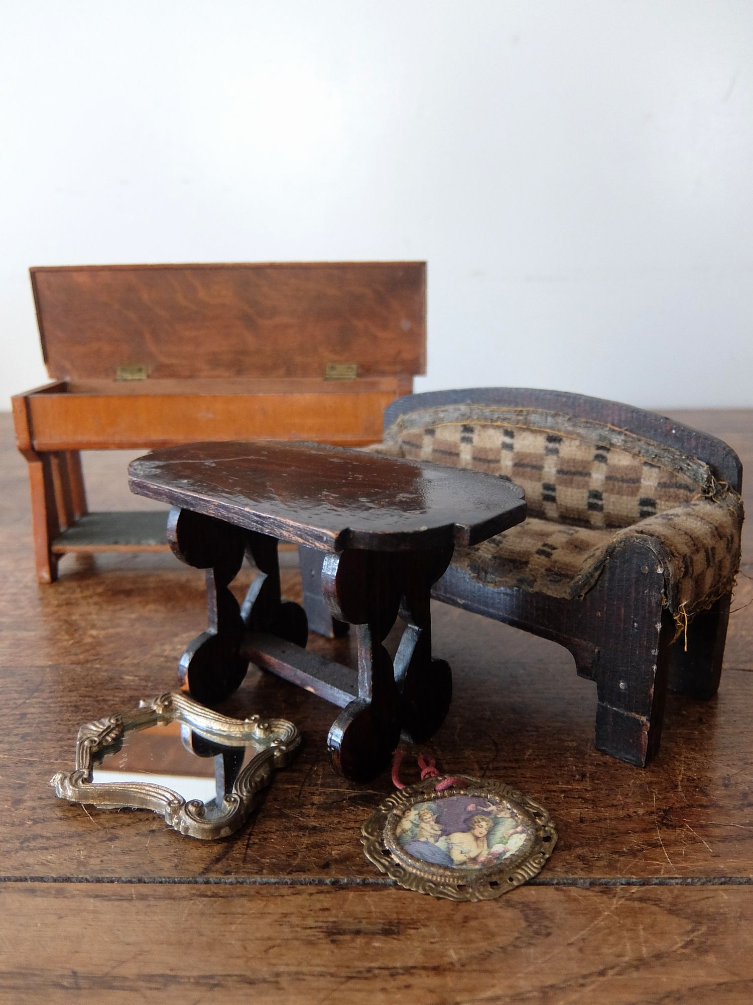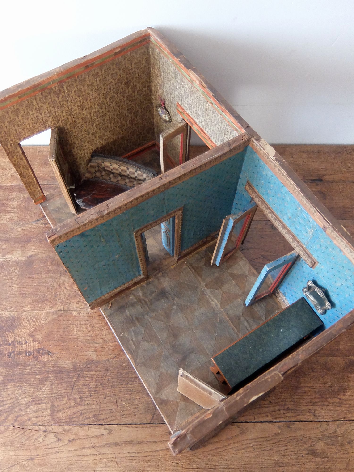 朽ちた塗装と壁紙の雰囲気が美しいドールハウス(テーブル・カウチ・作業台・絵画・鏡付き)