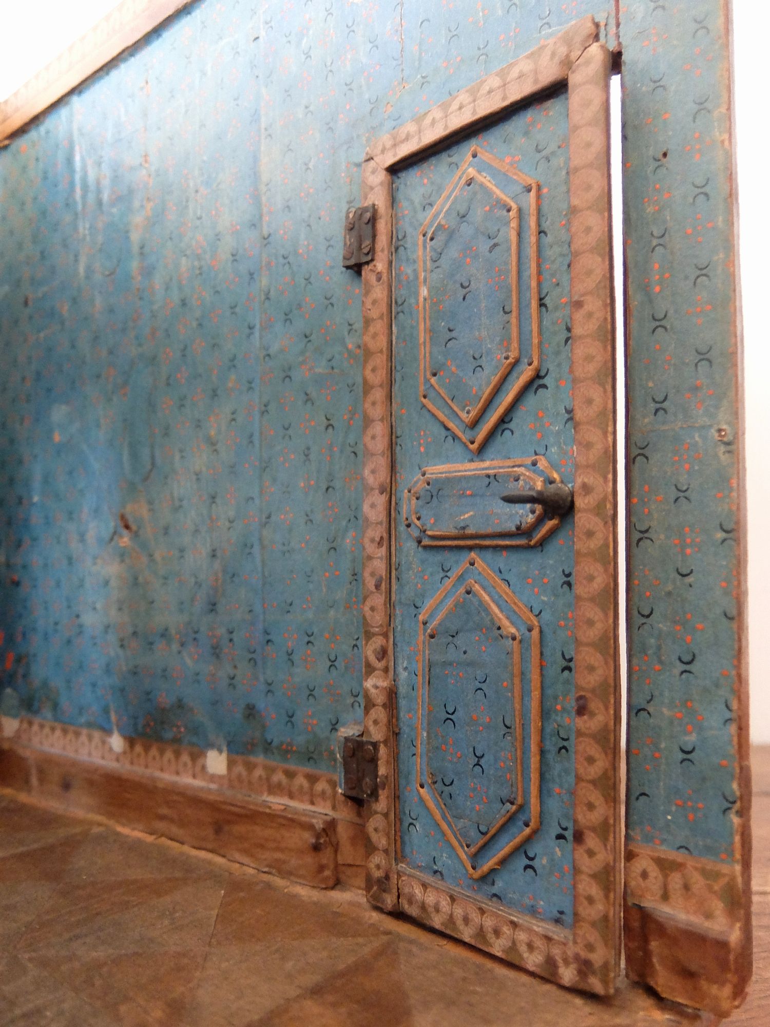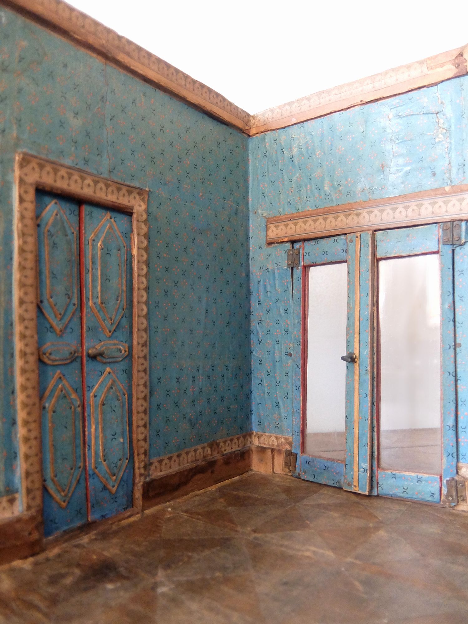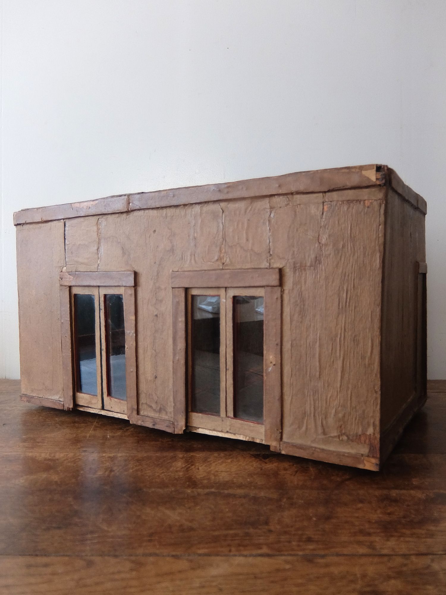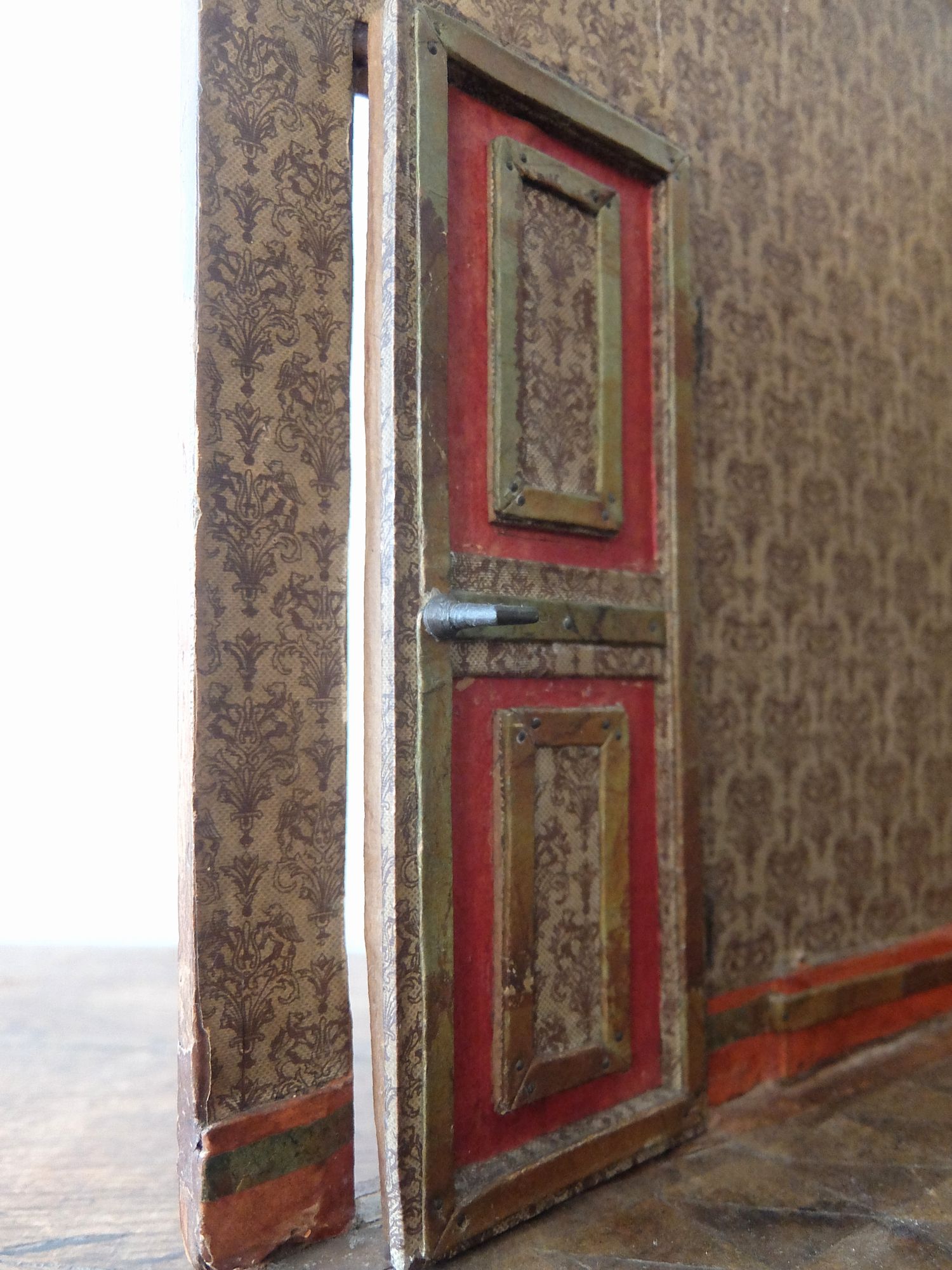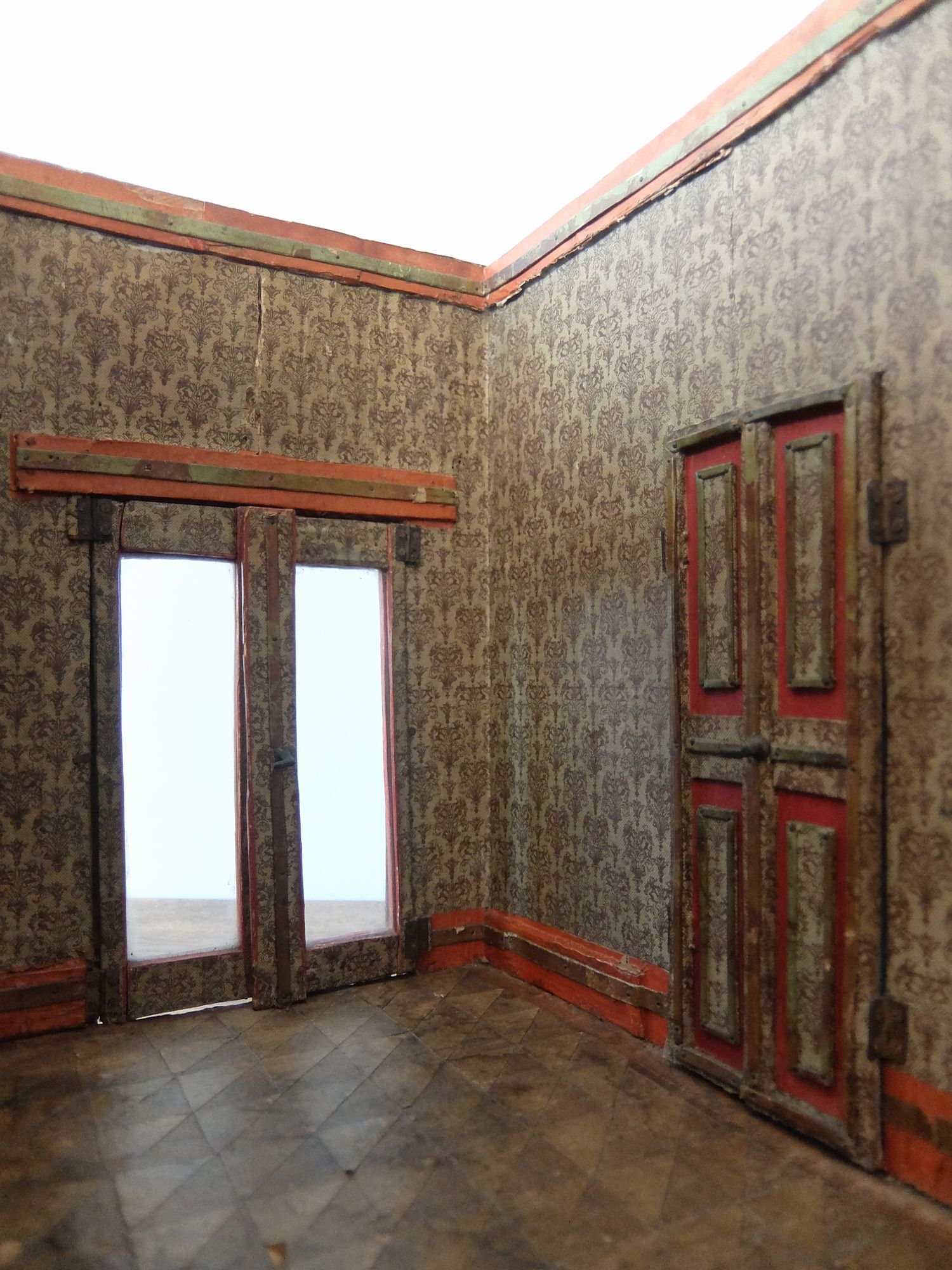 朽ちた塗装と壁紙の雰囲気が美しいドールハウス(テーブル・カウチ・作業台・絵画・鏡付き)