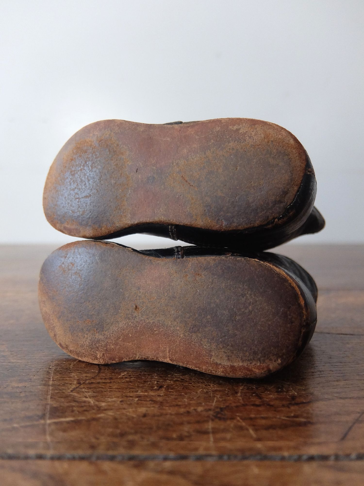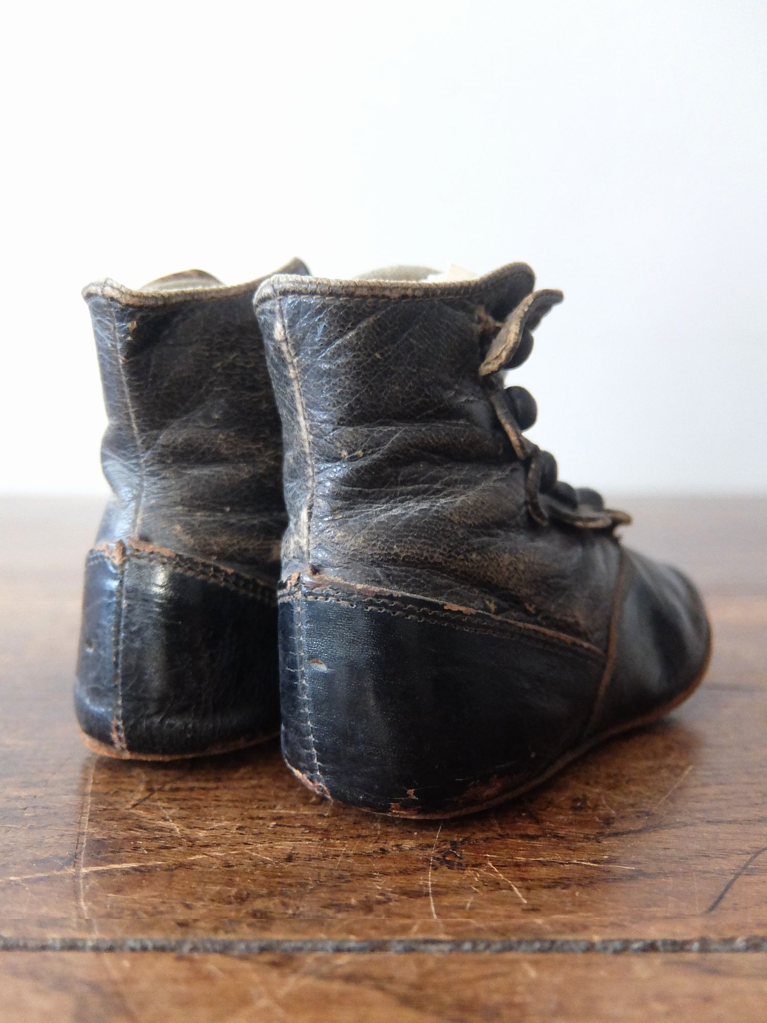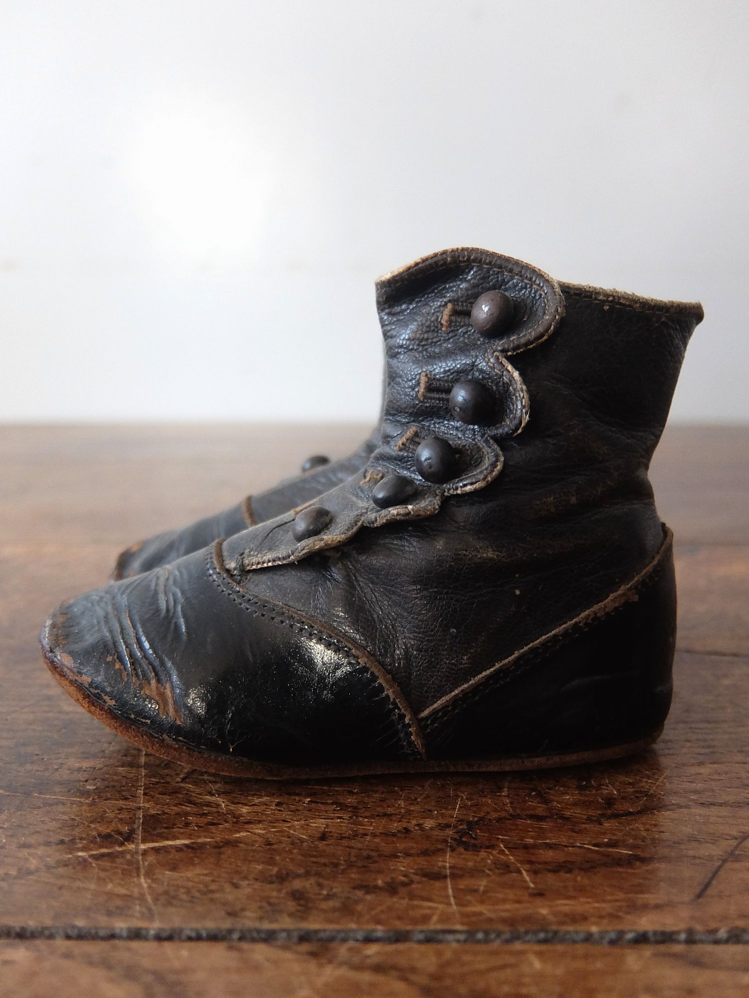 使い込まれた革の雰囲気が魅力的な子供用/人形用のヴィクトリアンベビーシューズ