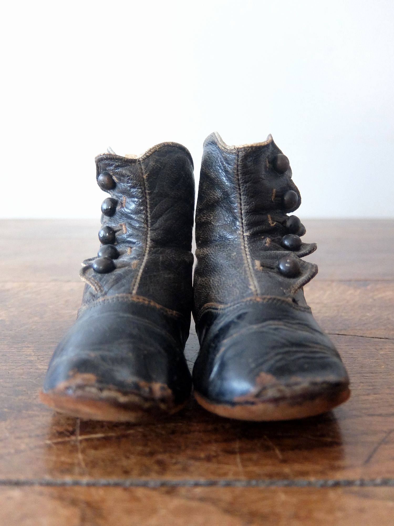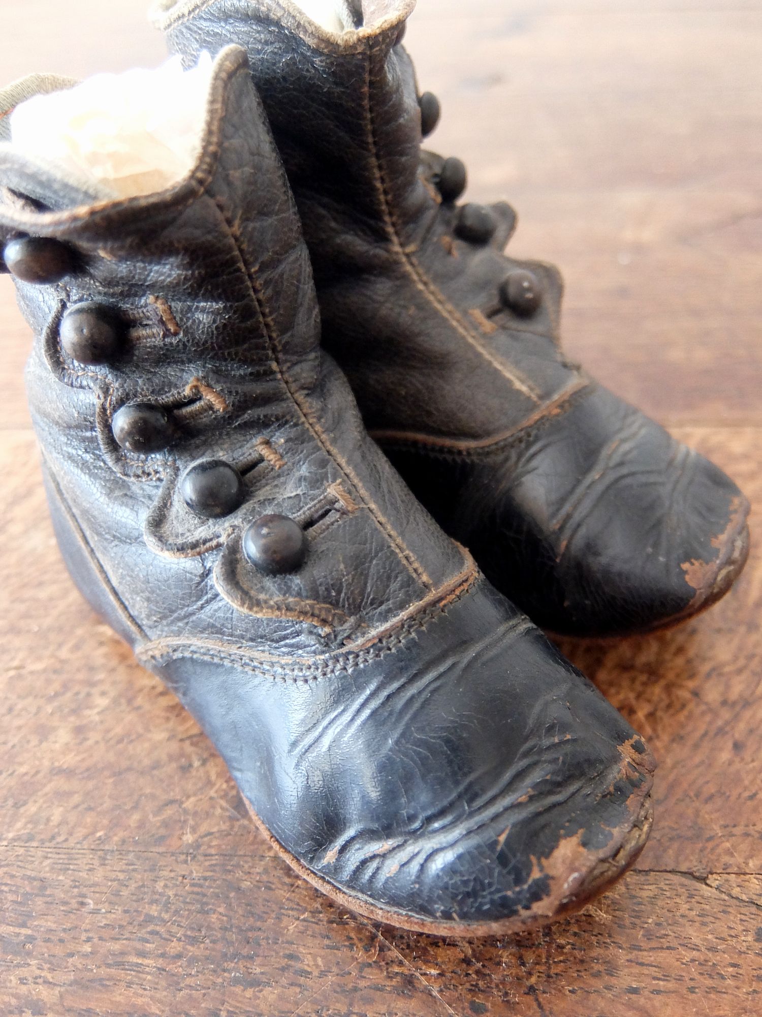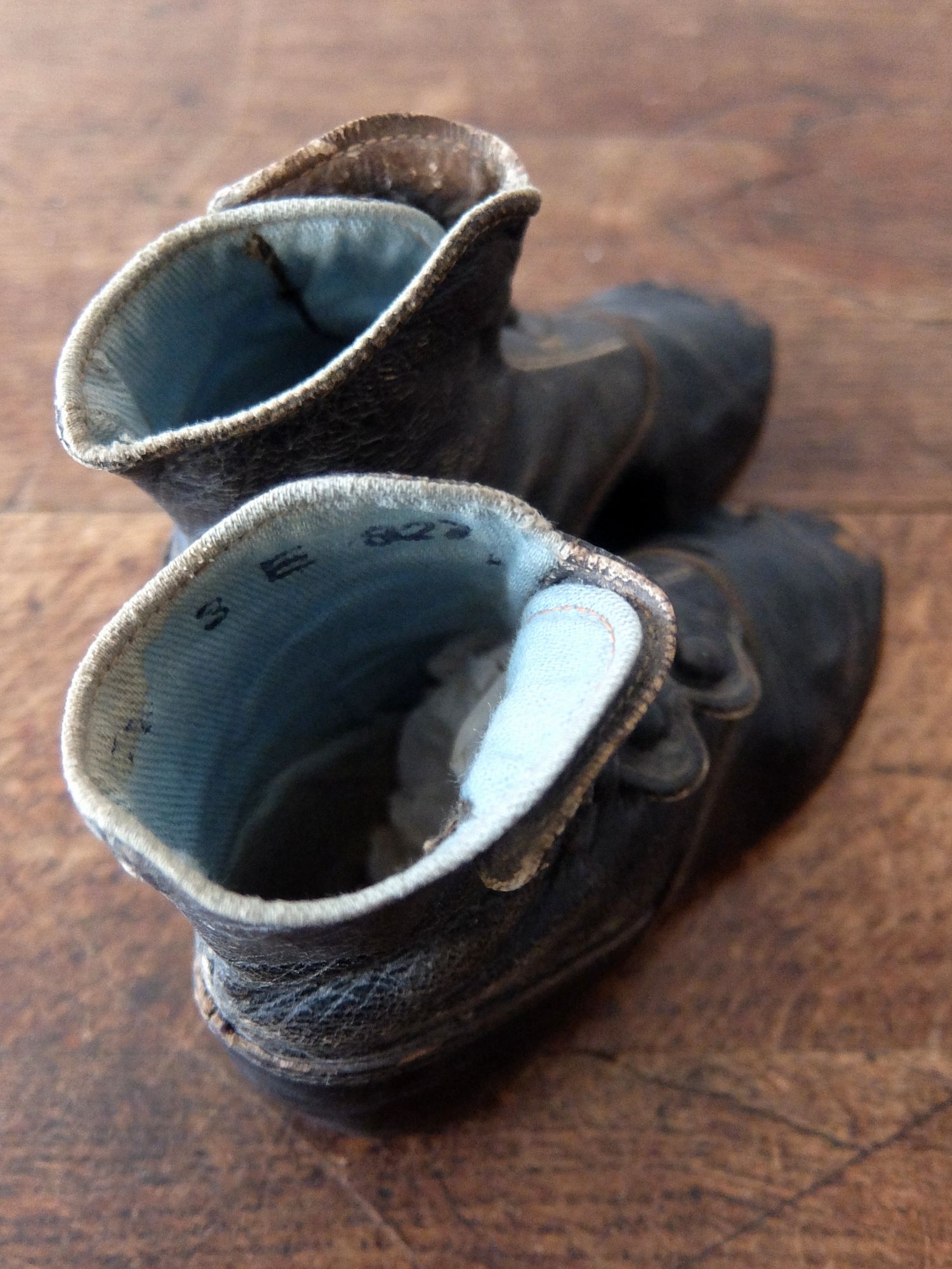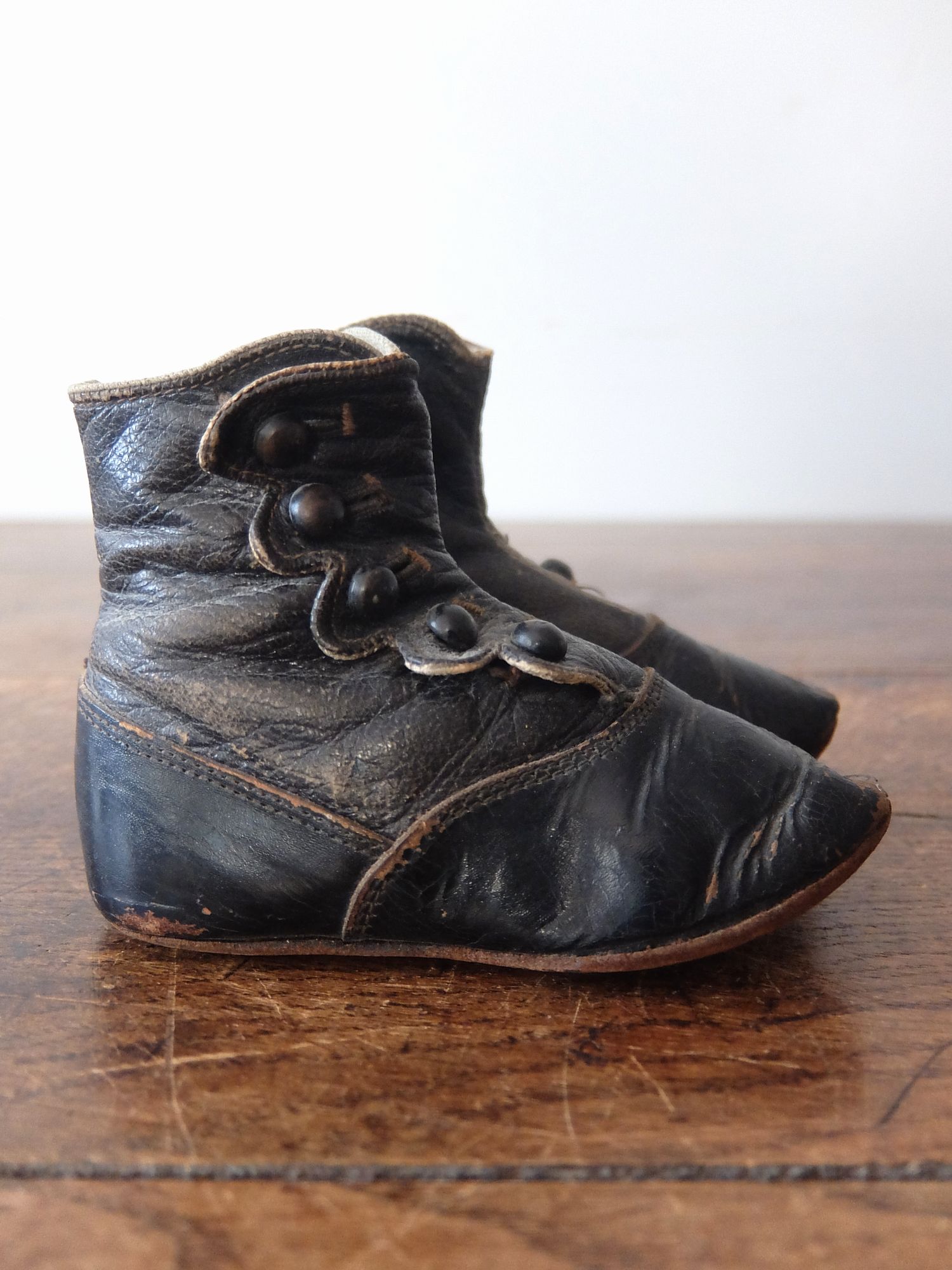 使い込まれた革の雰囲気が魅力的な子供用/人形用のヴィクトリアンベビーシューズ