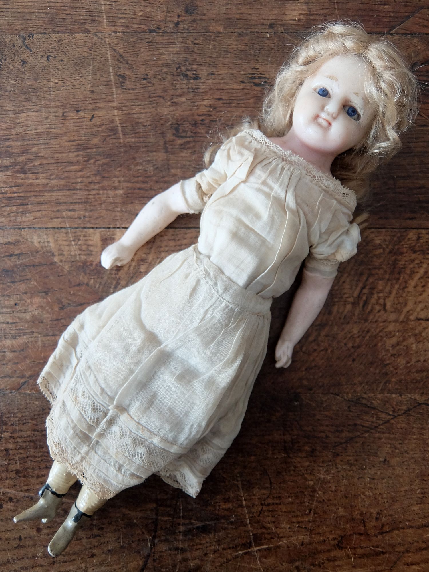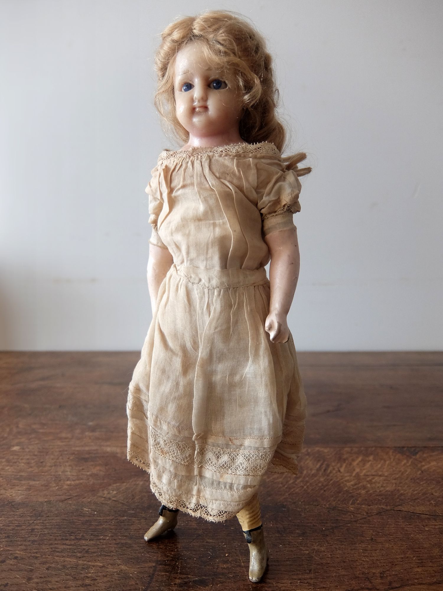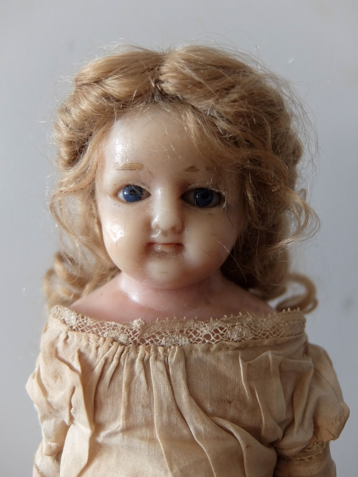 ブルーの瞳が美しい可愛らしい衣装の人形(頭部:ワックス製、手足:パテ製、肢体:藁・木くず製) ※左目元、首裏側に補修跡有