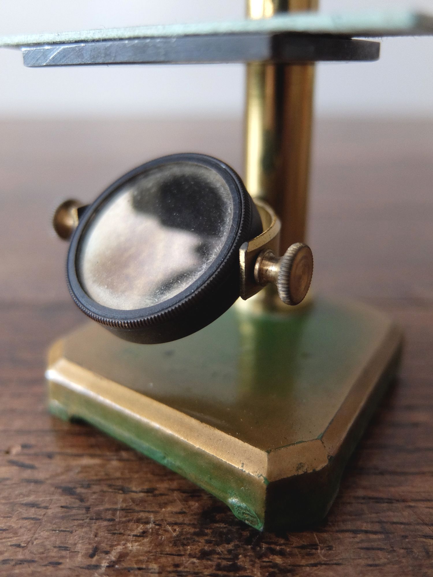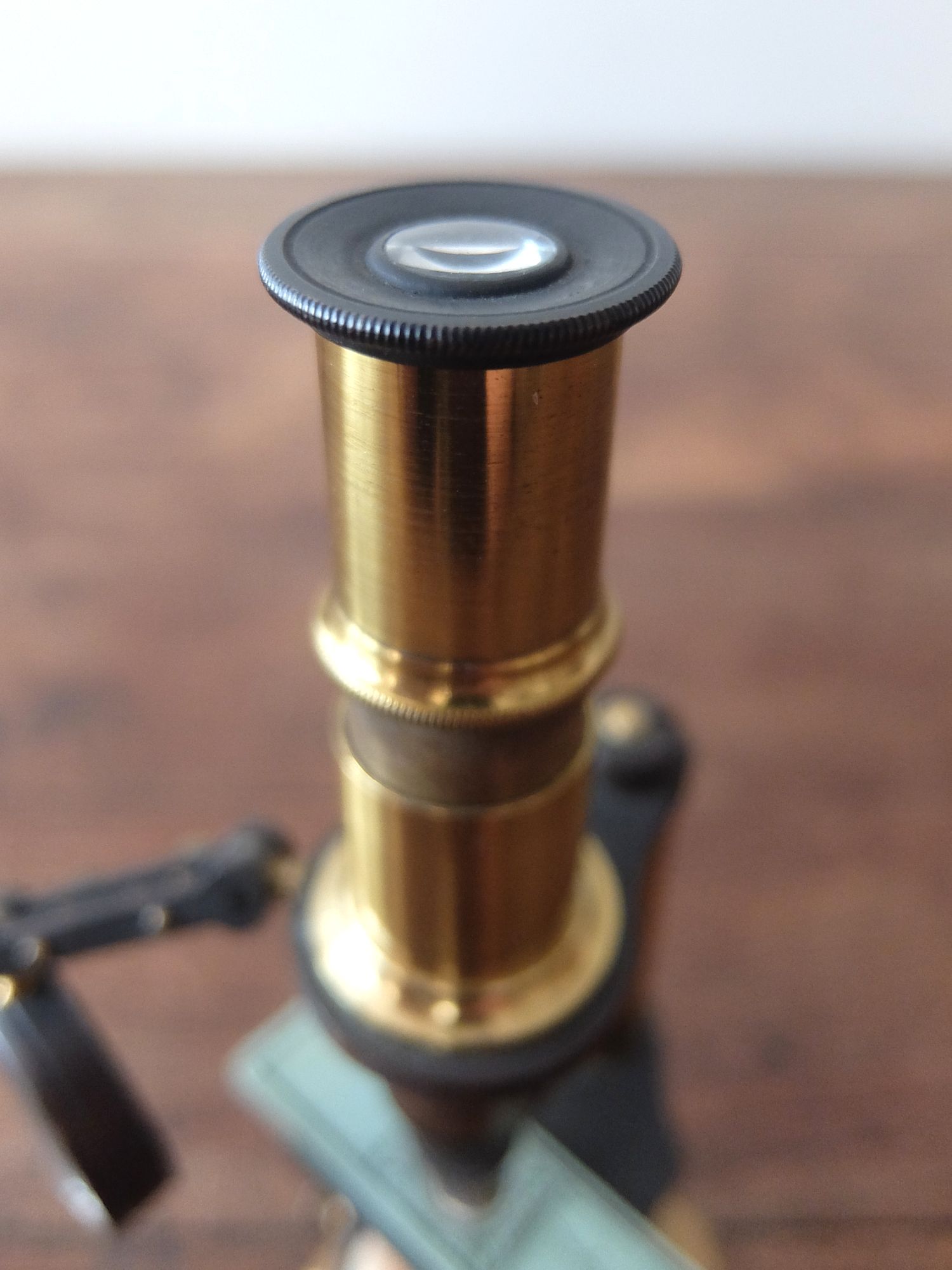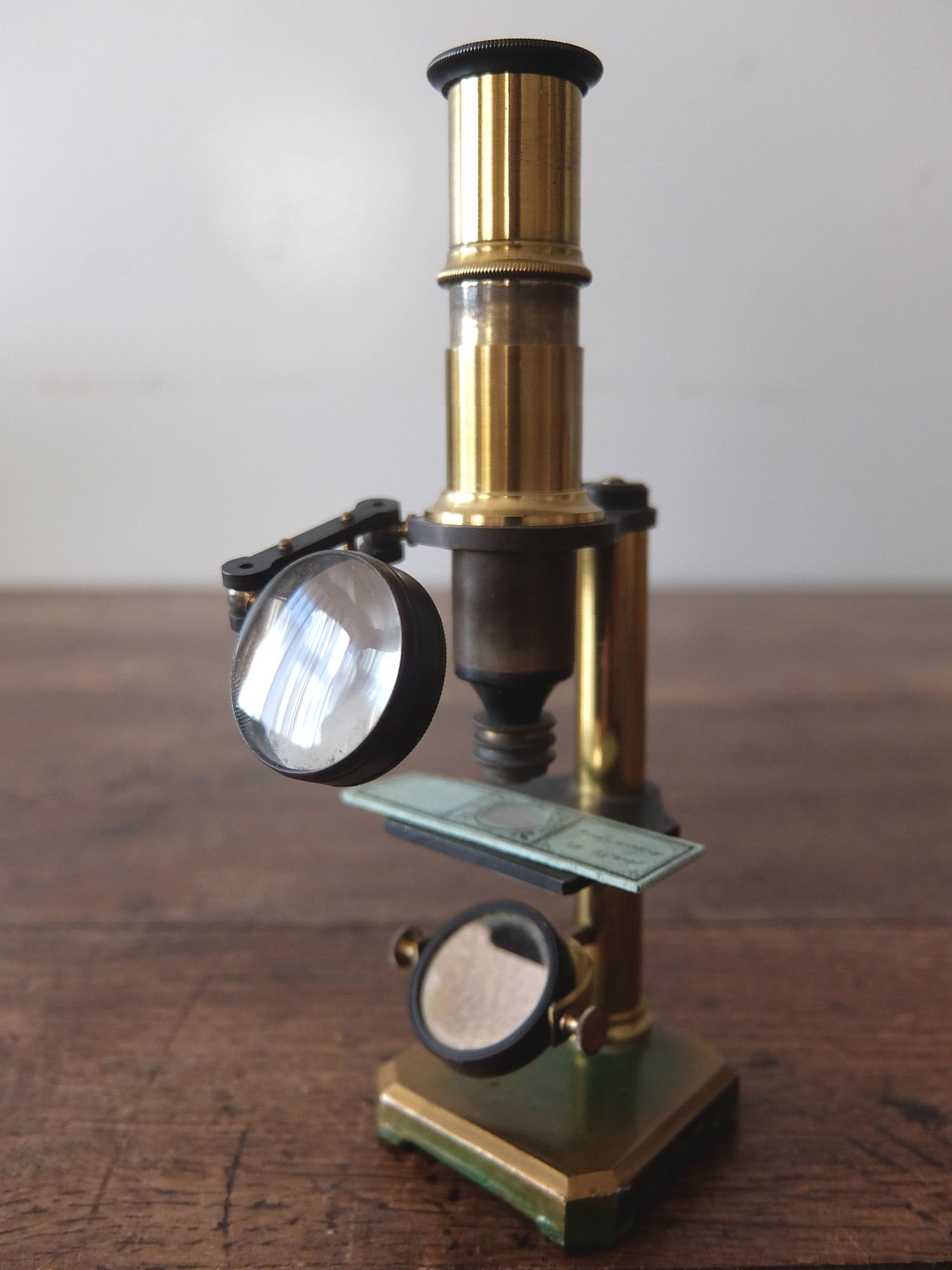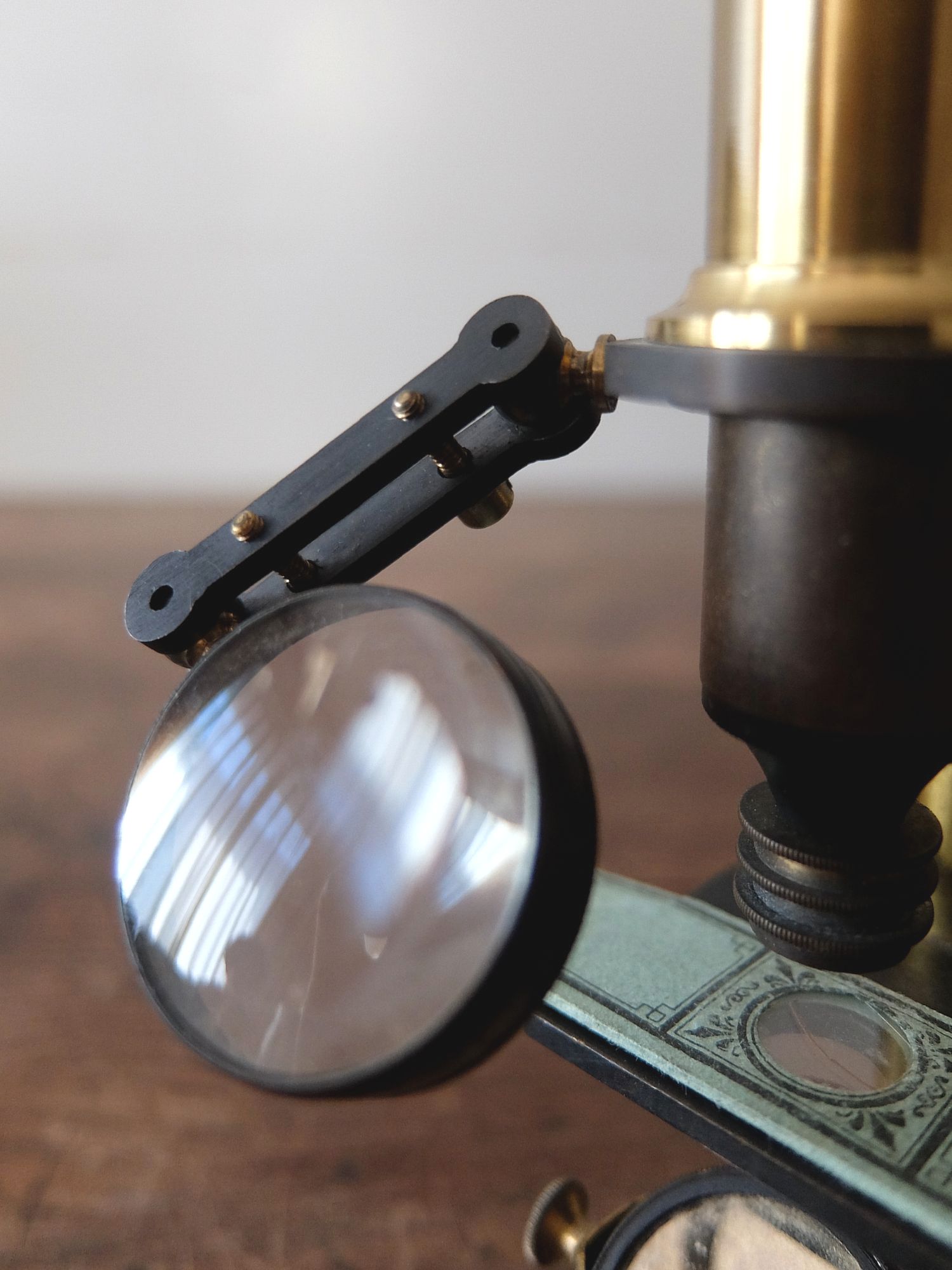 木製のケースに収められた携帯用の真鍮製顕微鏡(プレパラート付)