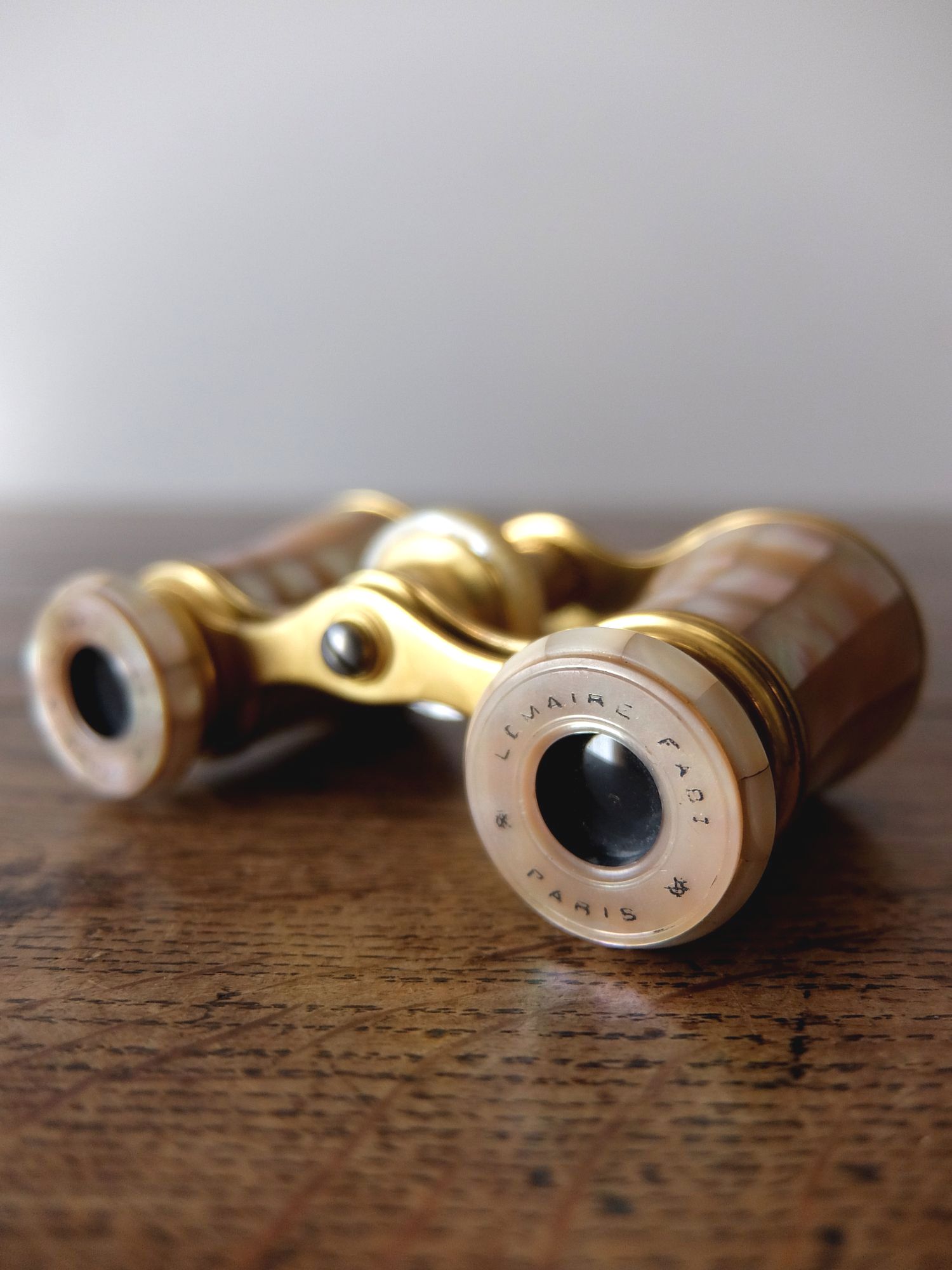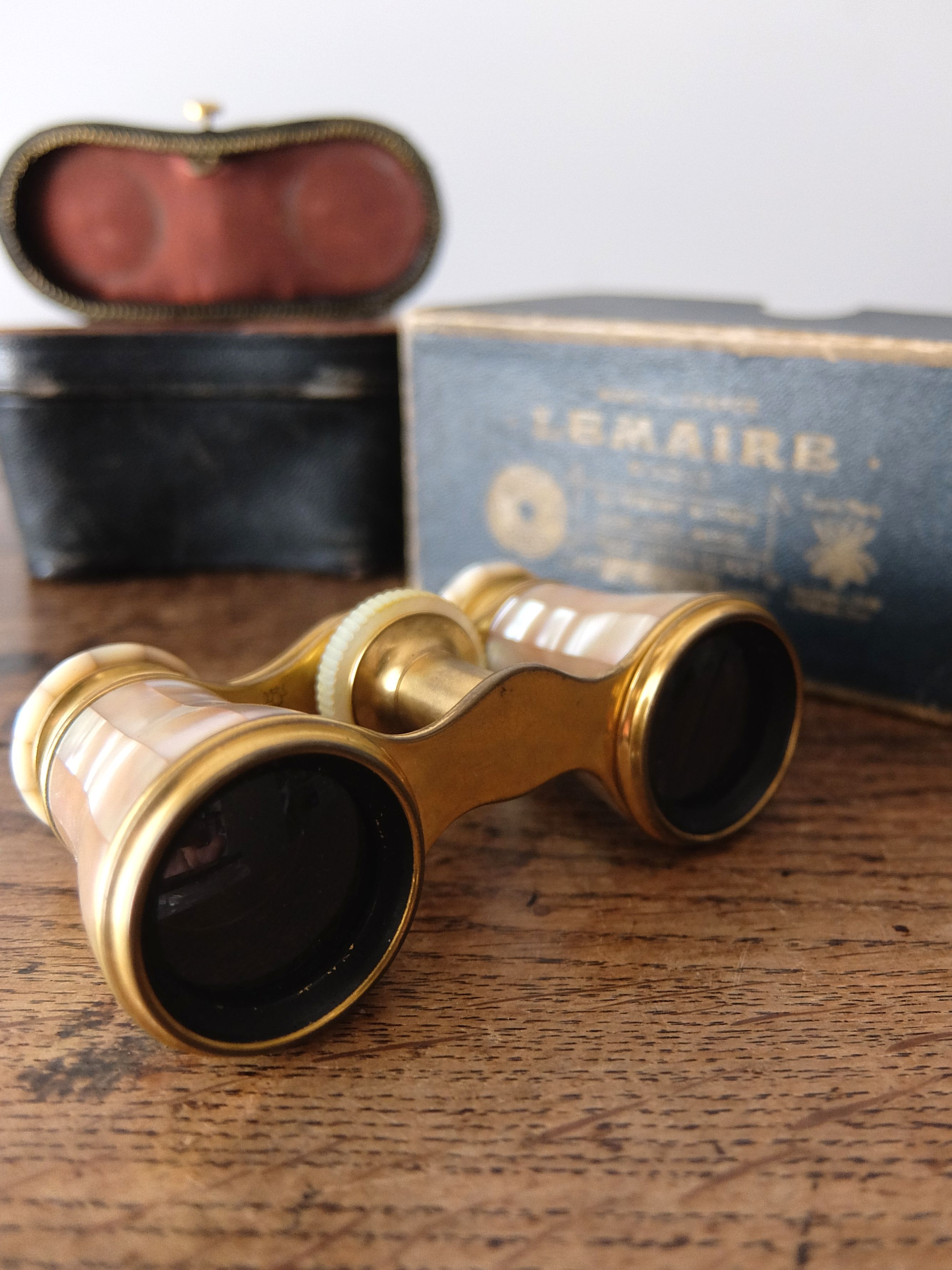 白蝶貝で装飾された【Lemaire Fabt】社の真鍮製オペラグラス(革製ケース・箱付き)