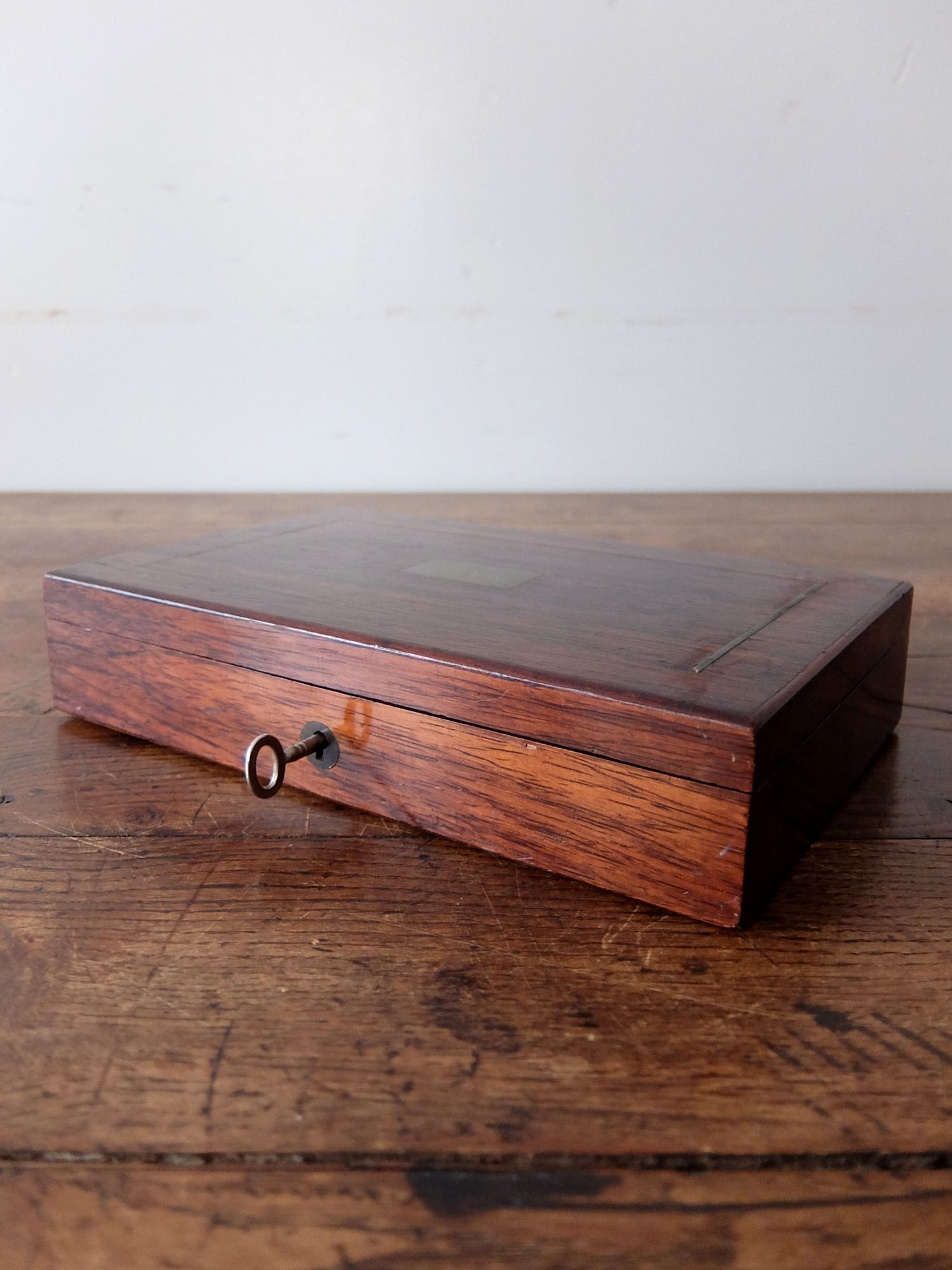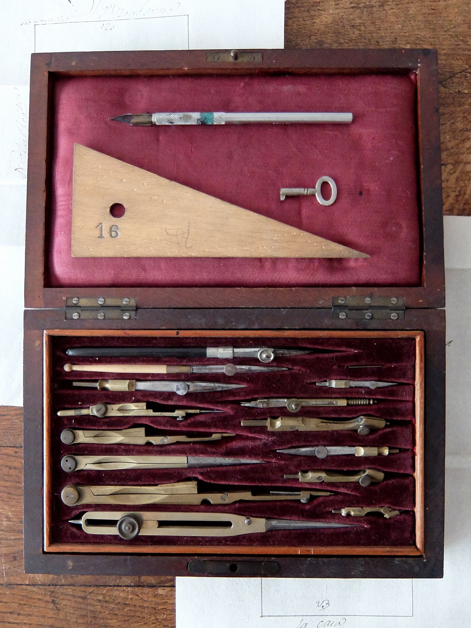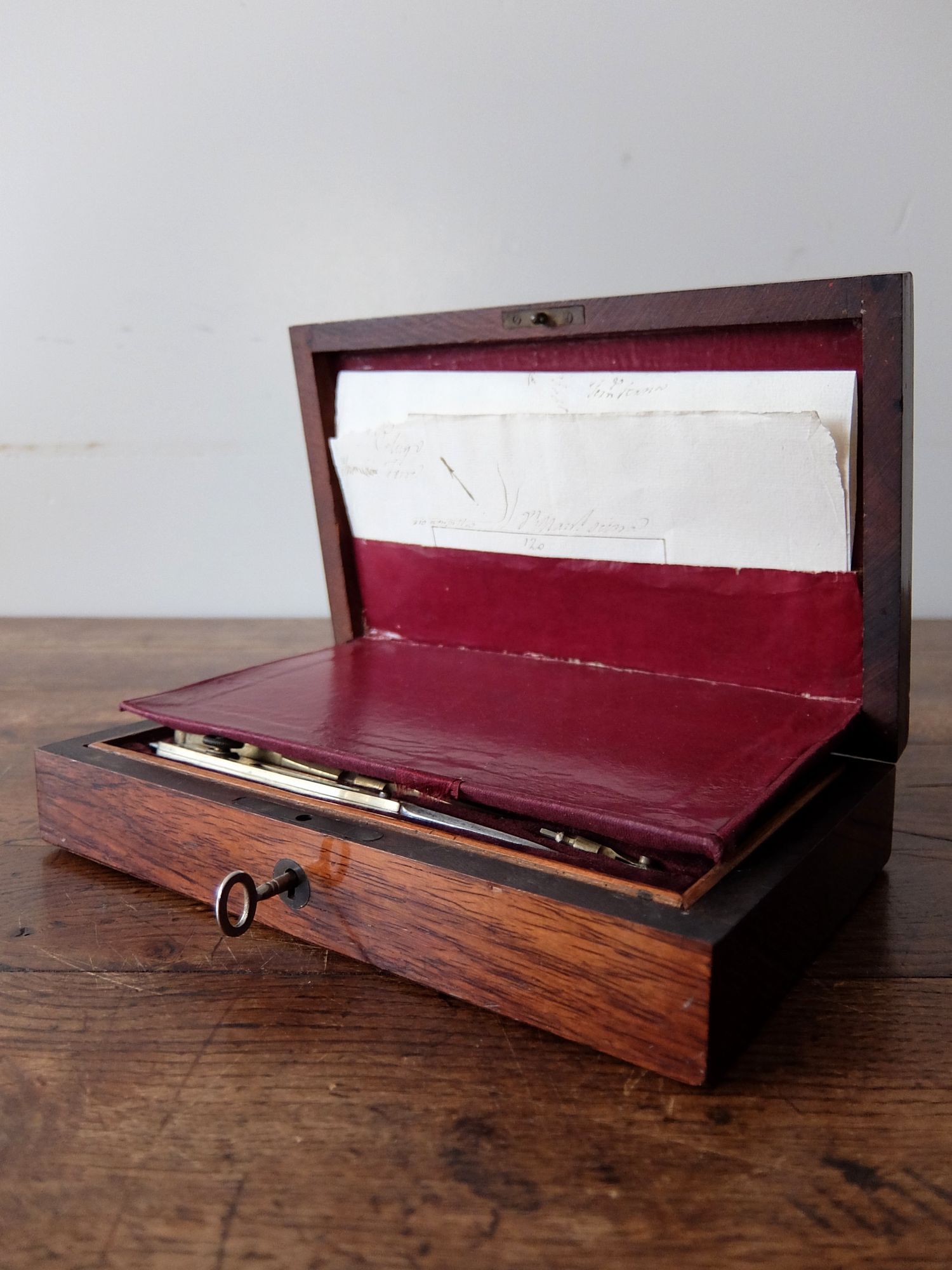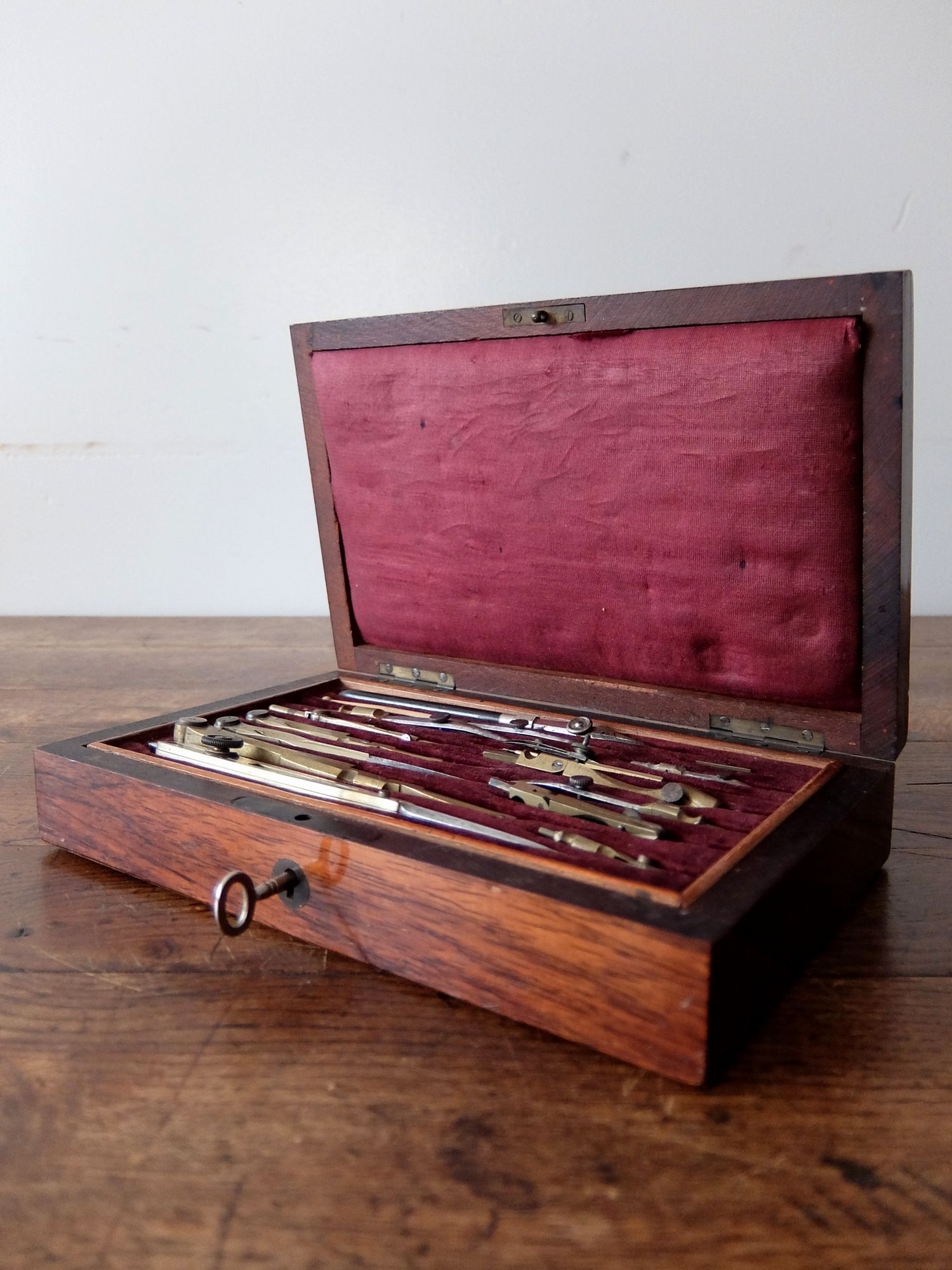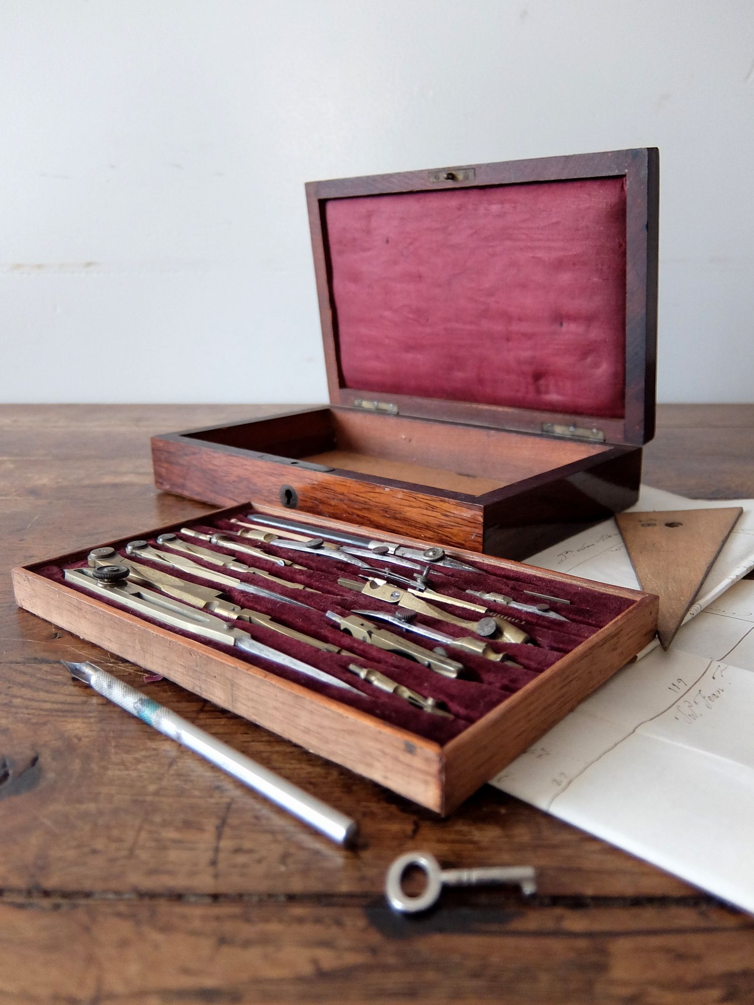 木製のケースに収まった古い製図セット (鍵付き・古紙2枚付き)