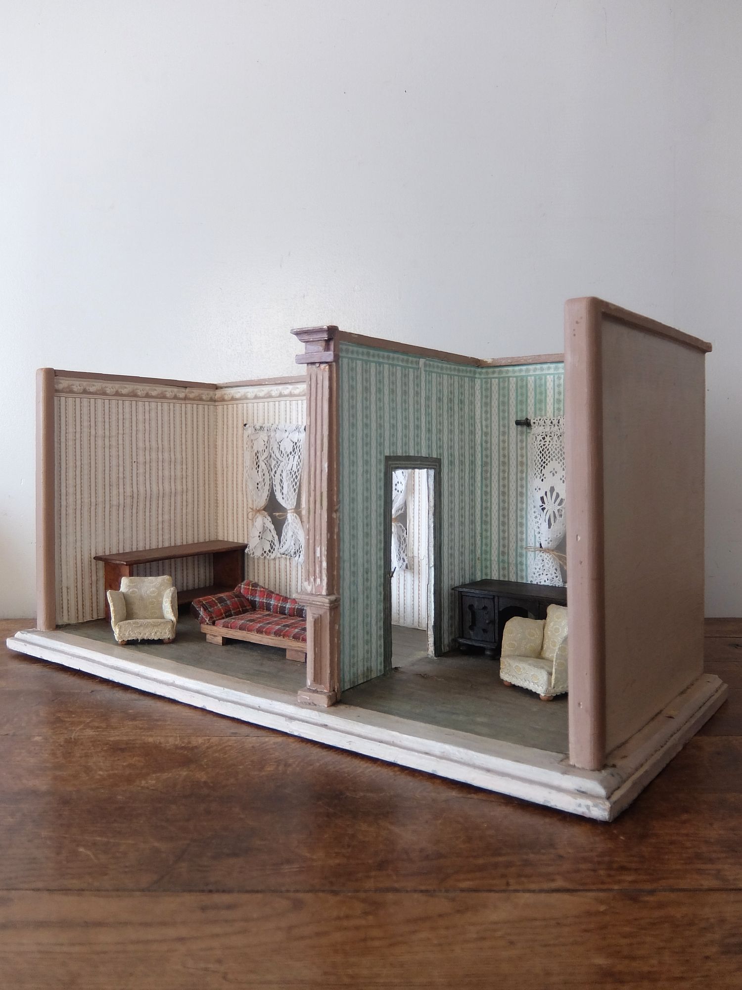 朽ちた塗装と壁紙の雰囲気が美しいドールハウス(テーブル・チェアー2脚・サイドボード・コーヒーテーブル・ソファ2脚付き)