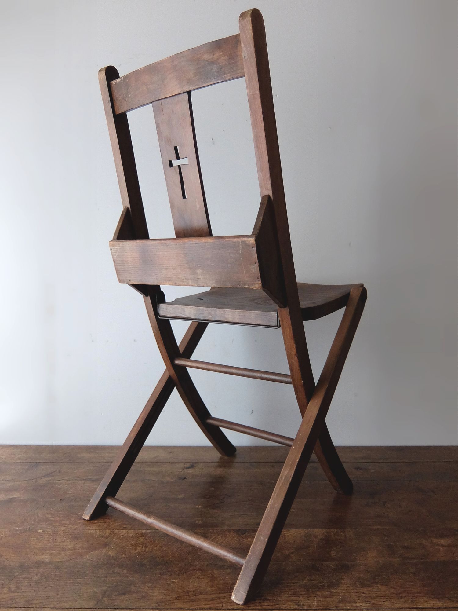 背もたれの十字架の意匠が印象的な折り畳み式のチャーチチェアー