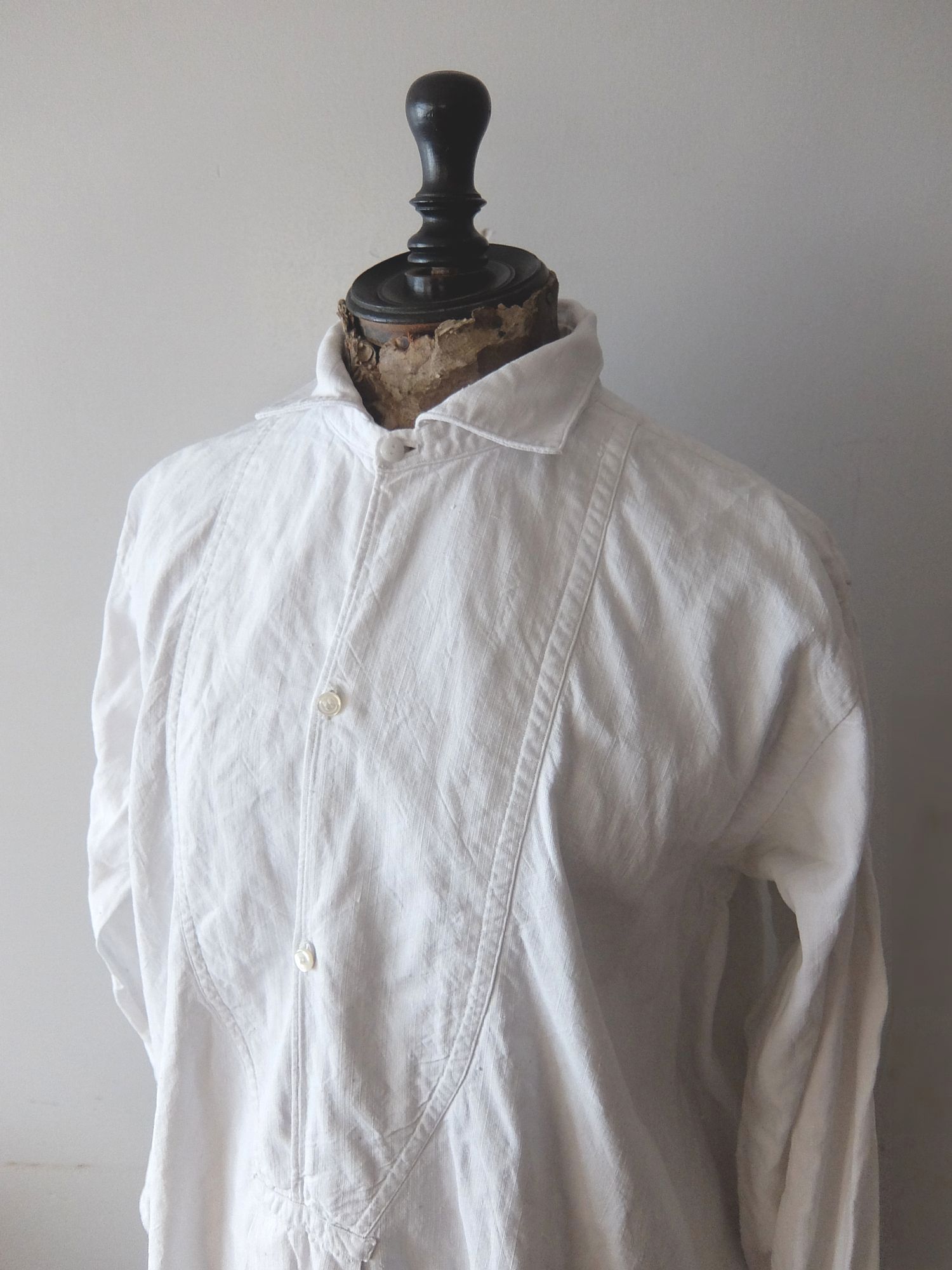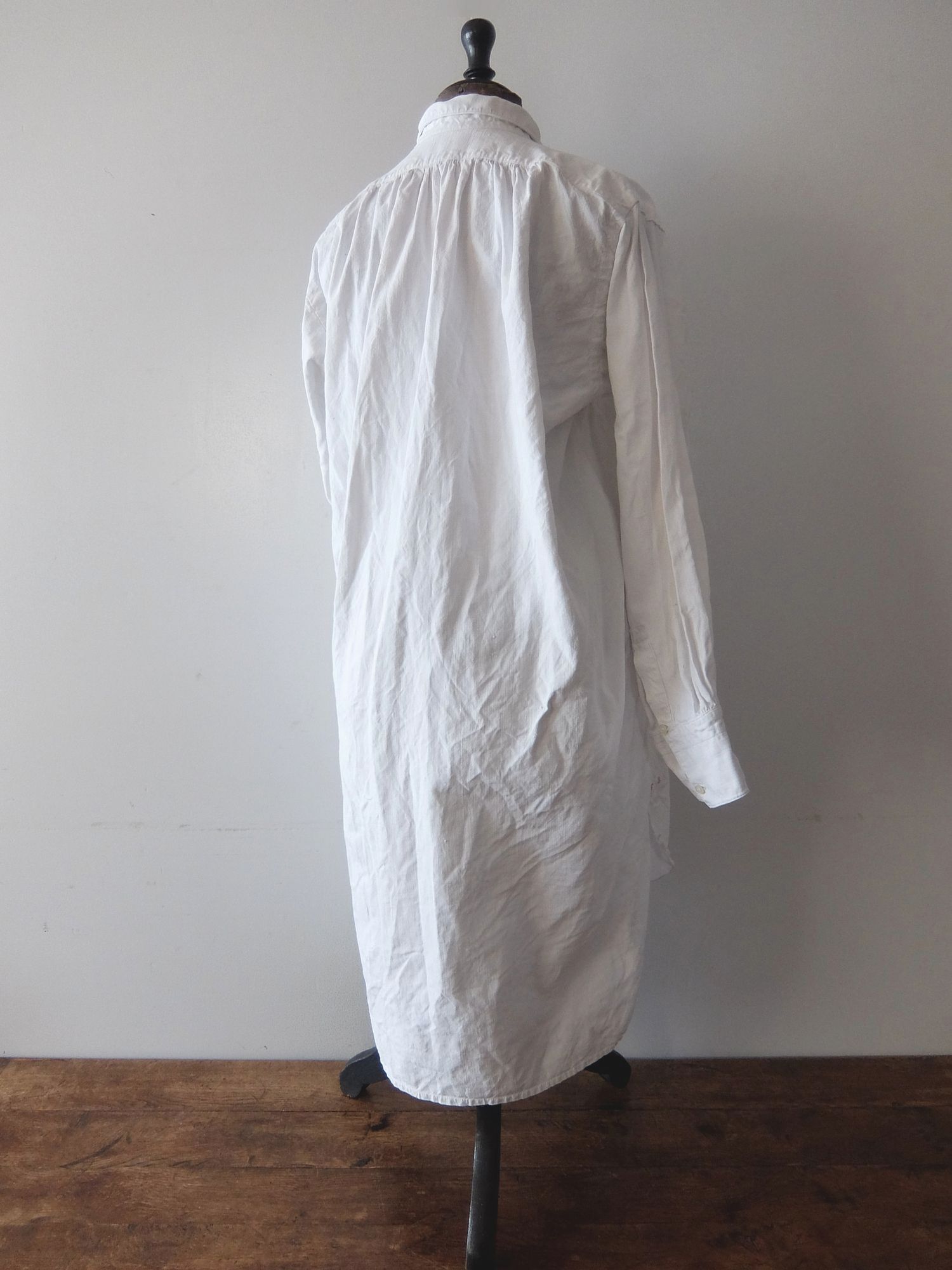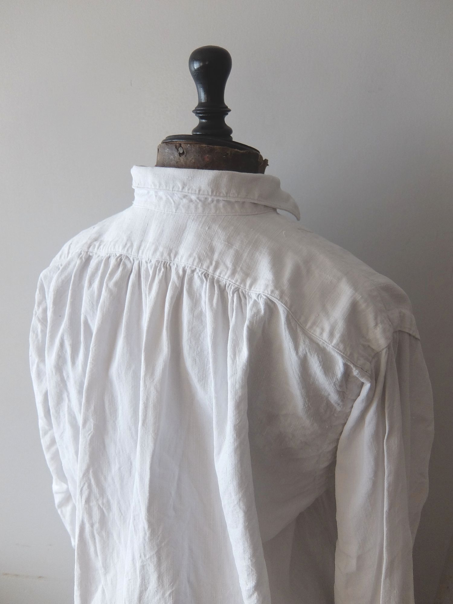 襟の後ろと袖のハンドギャザーの縫製が美しいフレンチリネンのスモッグシャツ/ナイティドレス