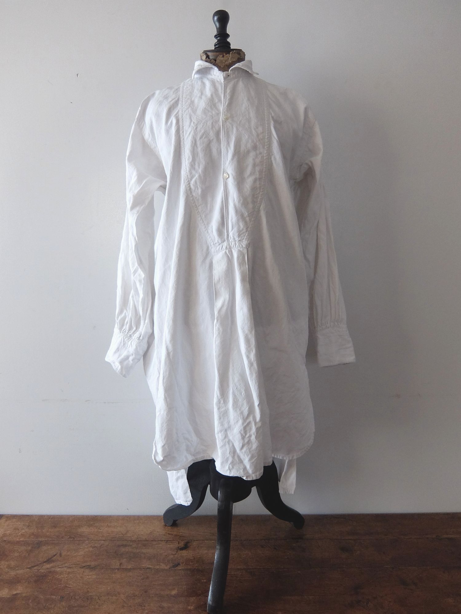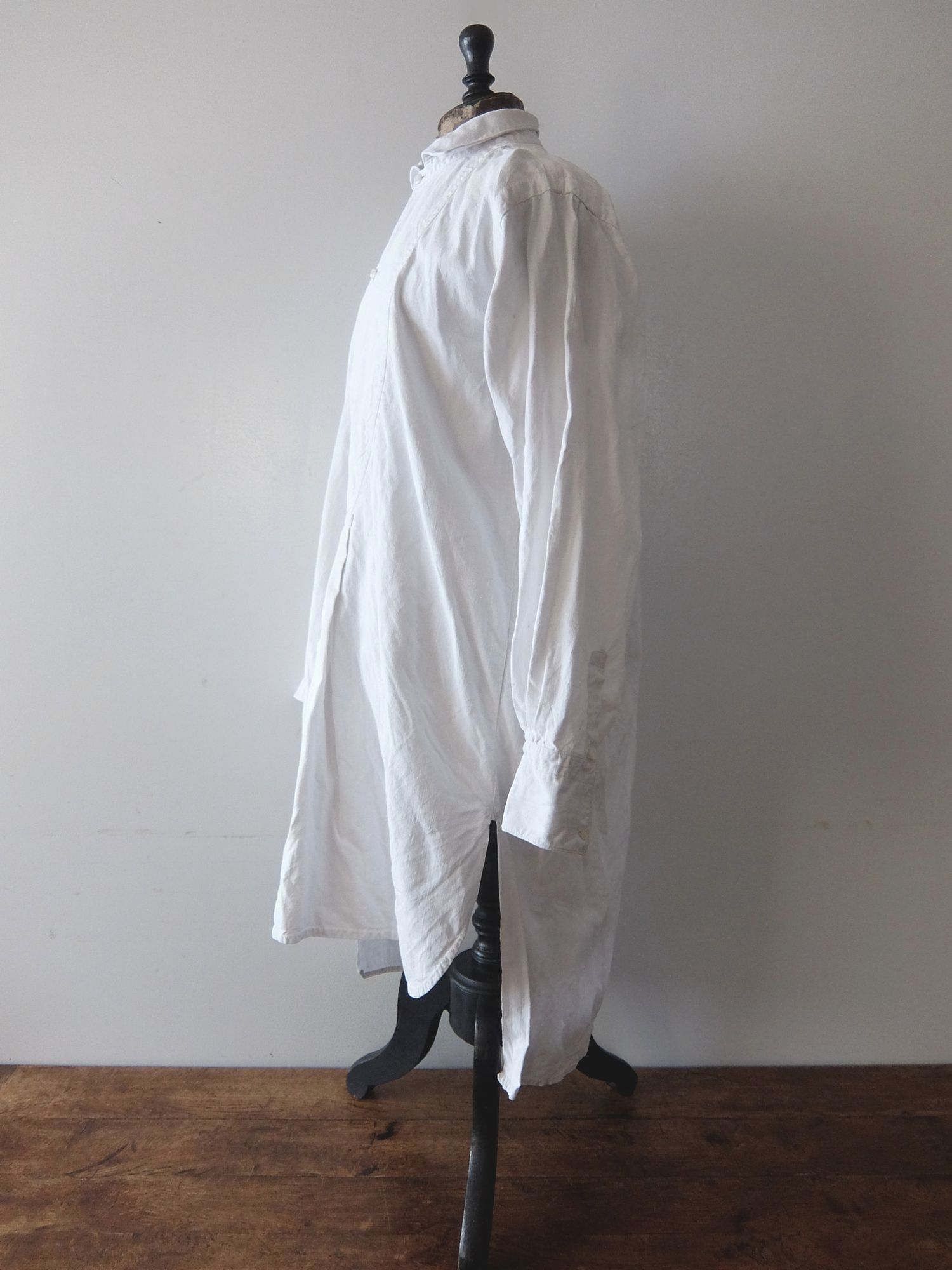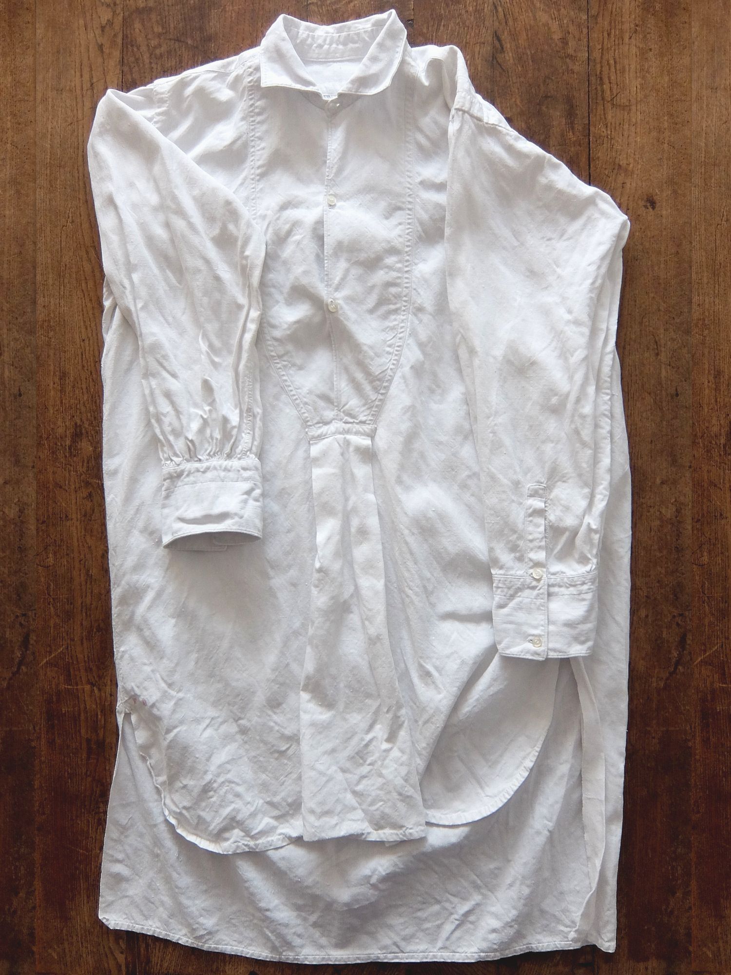 襟の後ろと袖のハンドギャザーの縫製が美しいフレンチリネンのスモッグシャツ/ナイティドレス