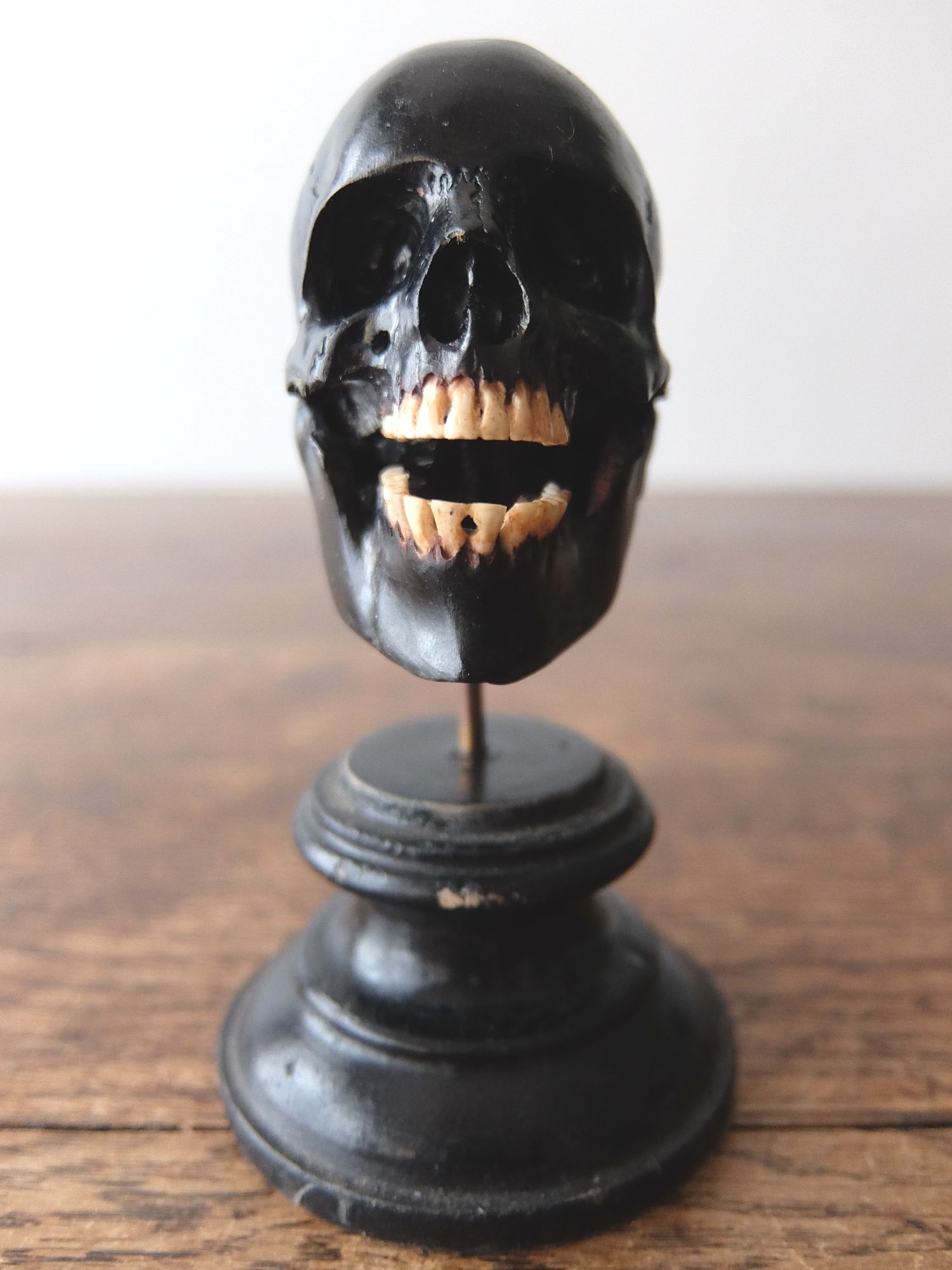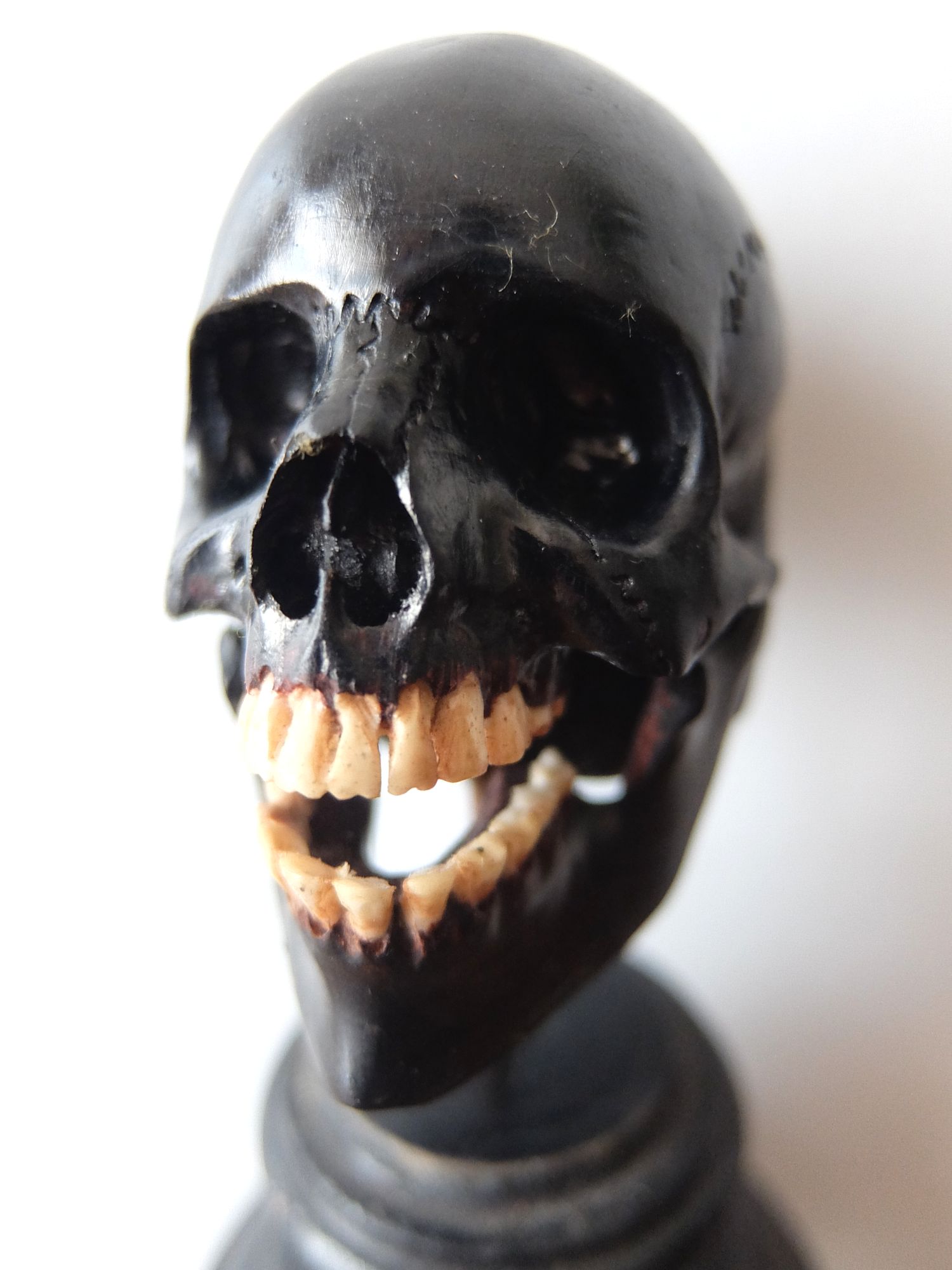 黒檀を削り出して製作された頭蓋骨のオブジェ (歯部:動物の骨・角を使用)