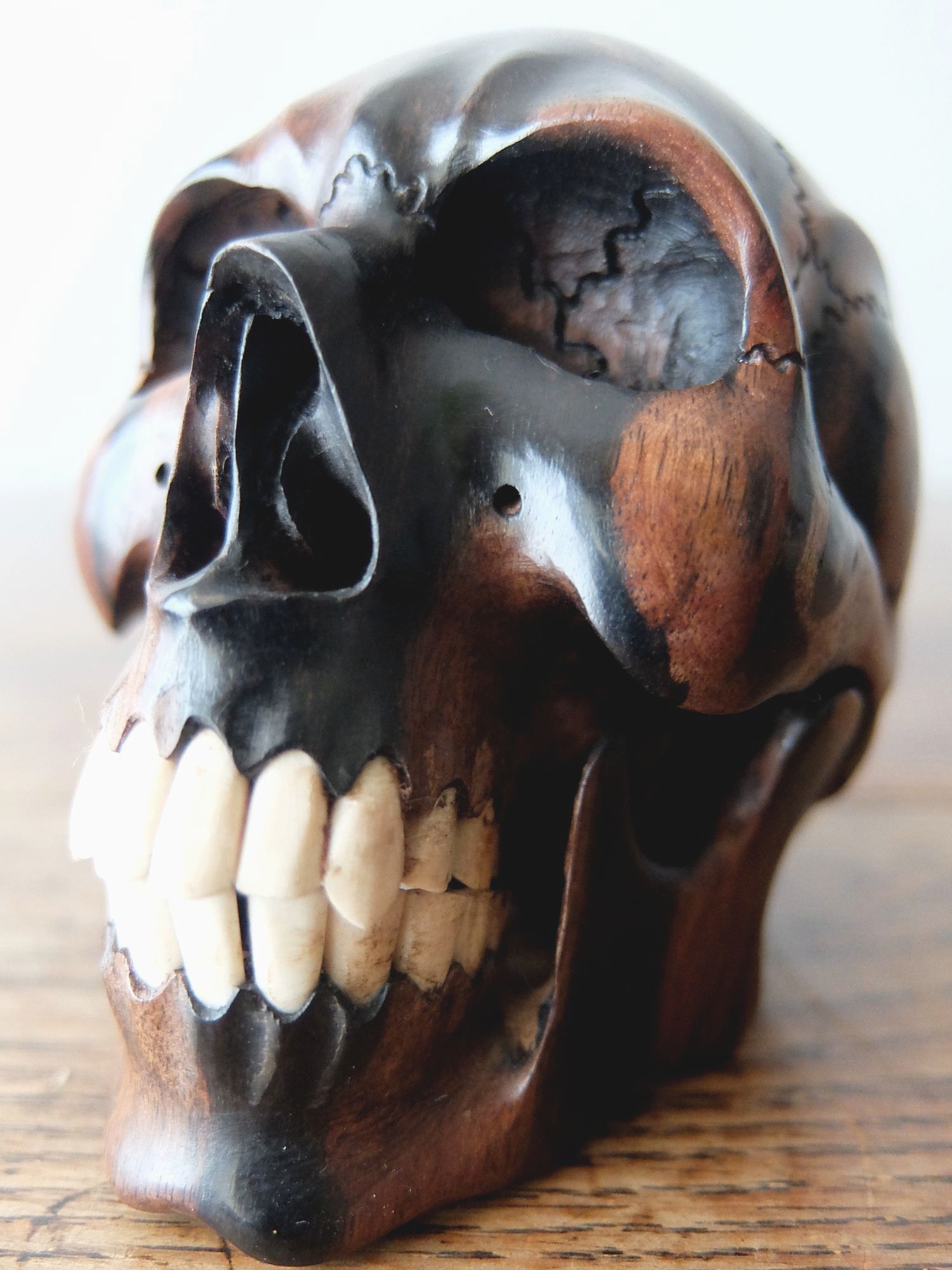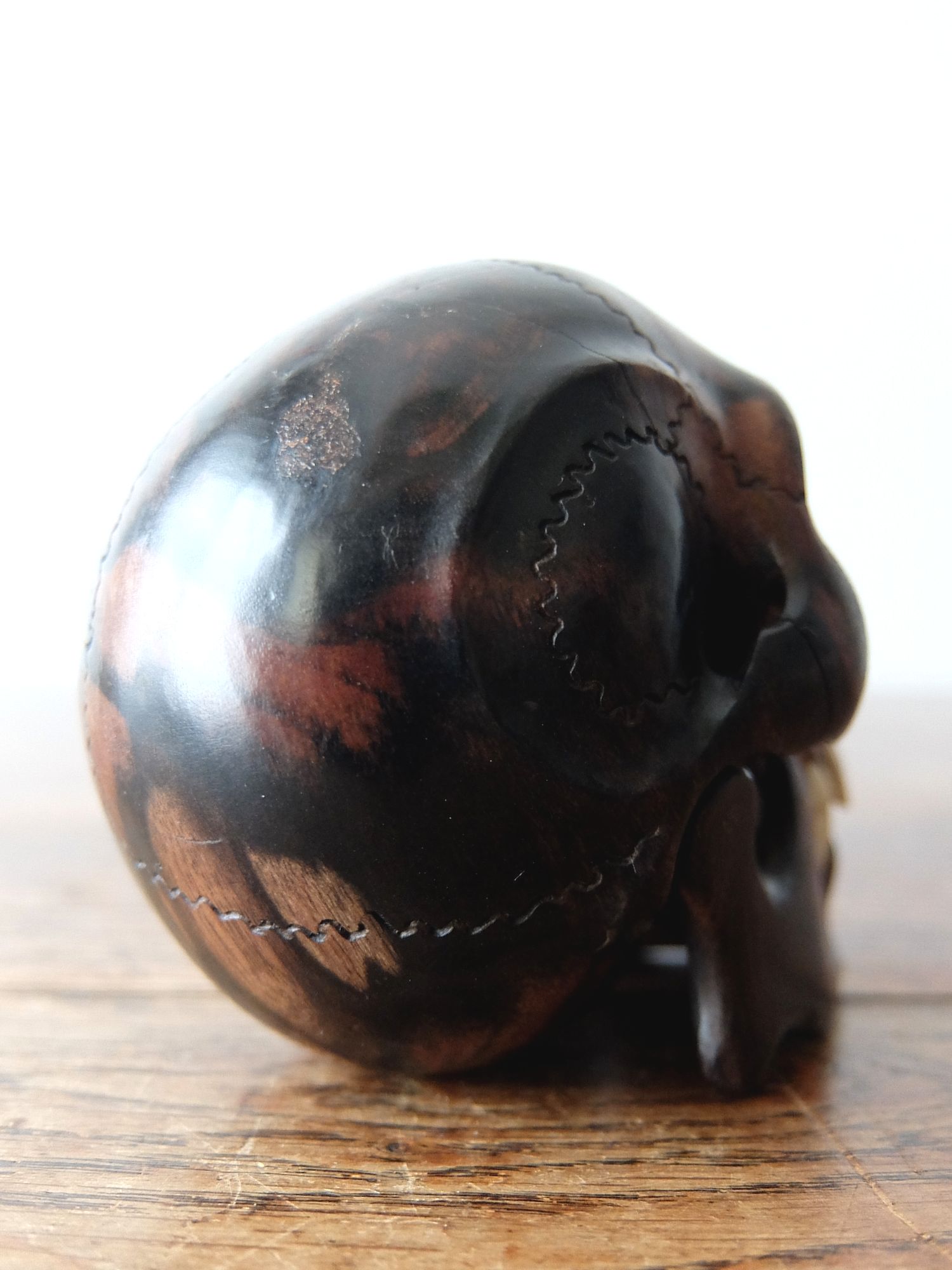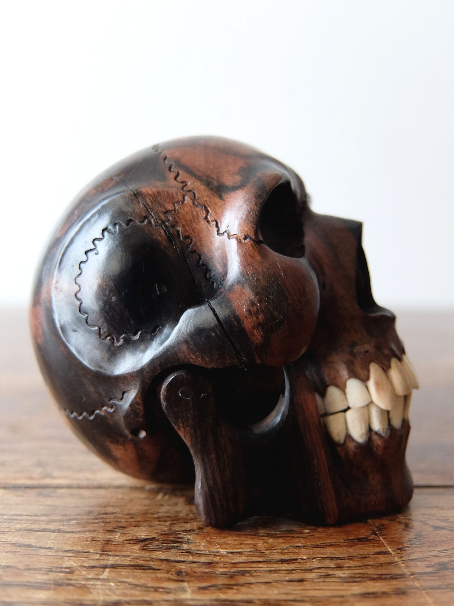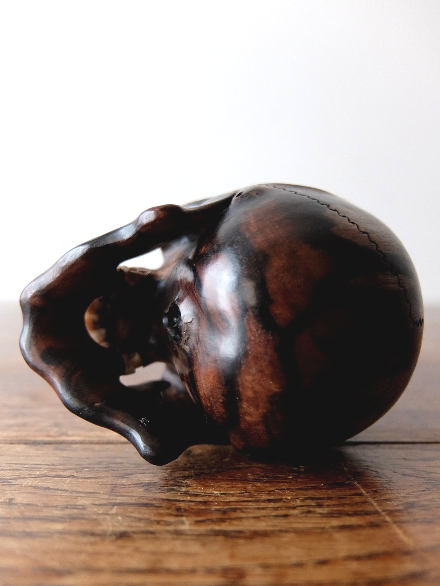 顎関節が可動する黒檀を削り出して製作された頭蓋骨のオブジェ (歯部:動物の骨・角を使用)