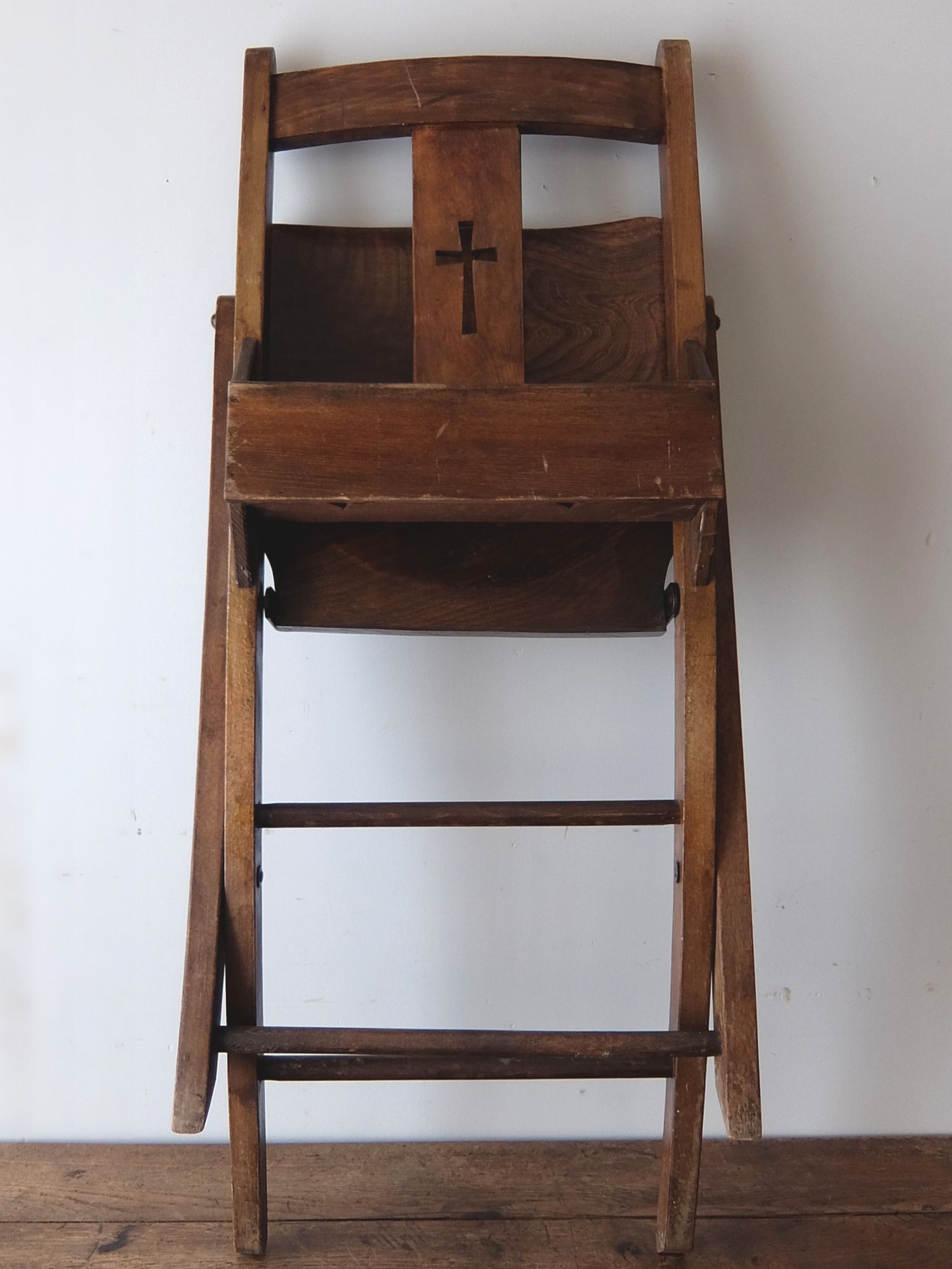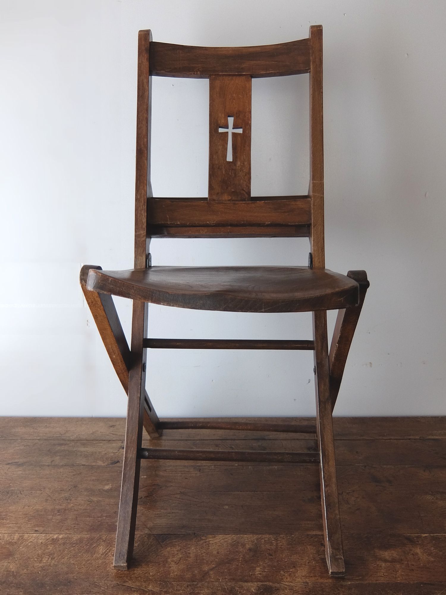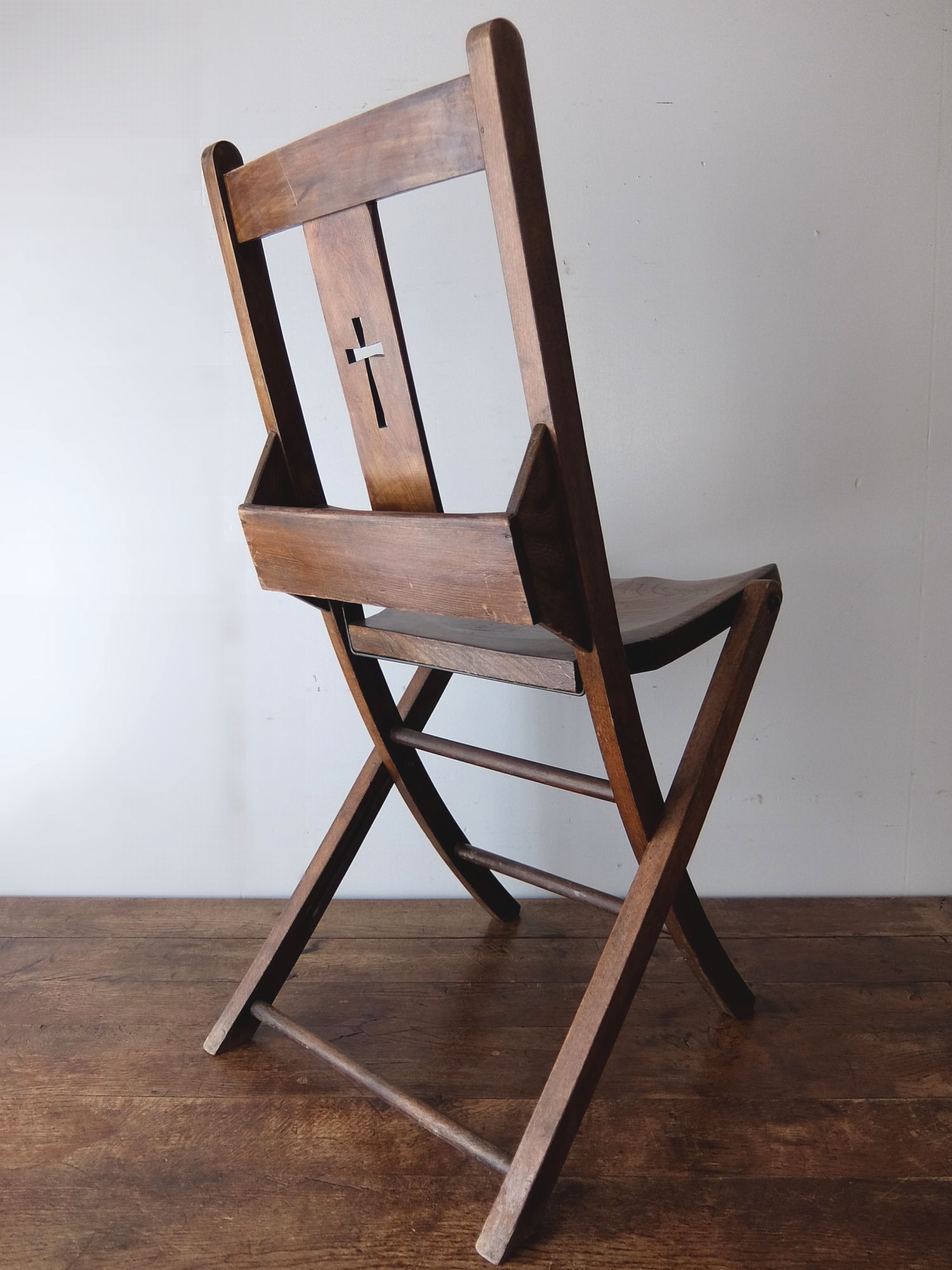 背もたれの十字架の意匠が印象的な折り畳み式のチャーチチェアー