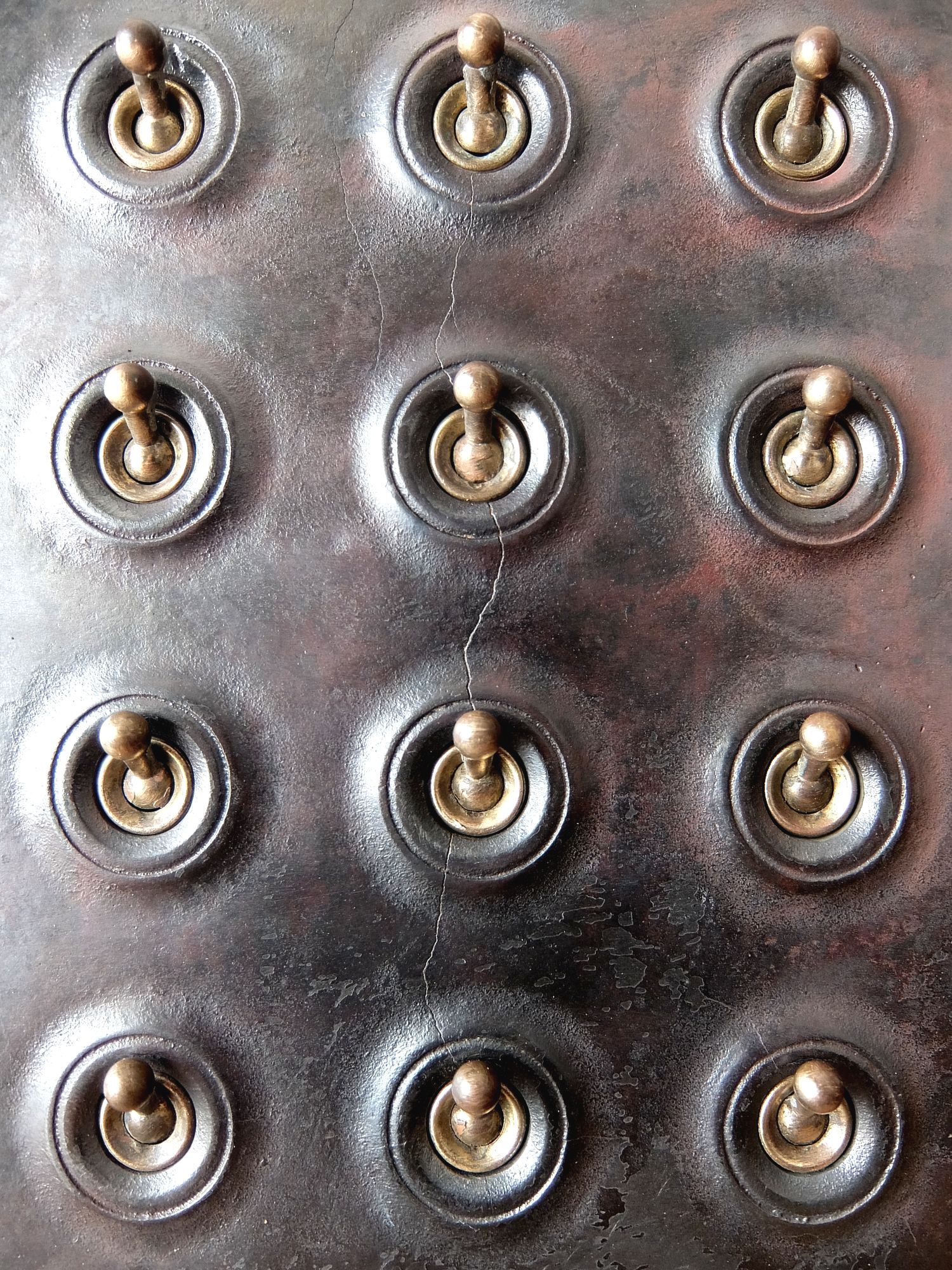 ロンドンの古いアパートメントに設置されていた真鍮と陶器でできた3連のドアベル用ボタン (動作未確認:ディスプレイ用)