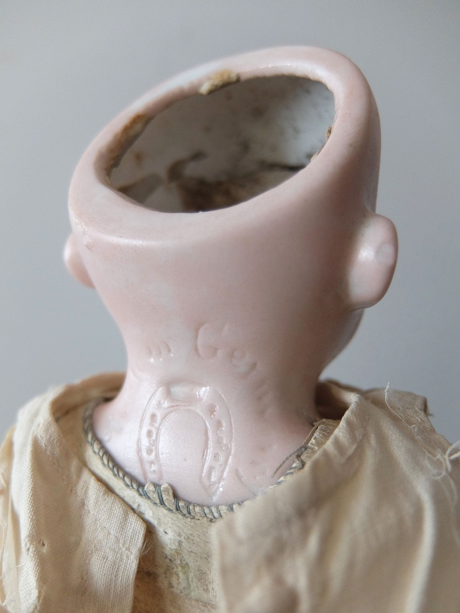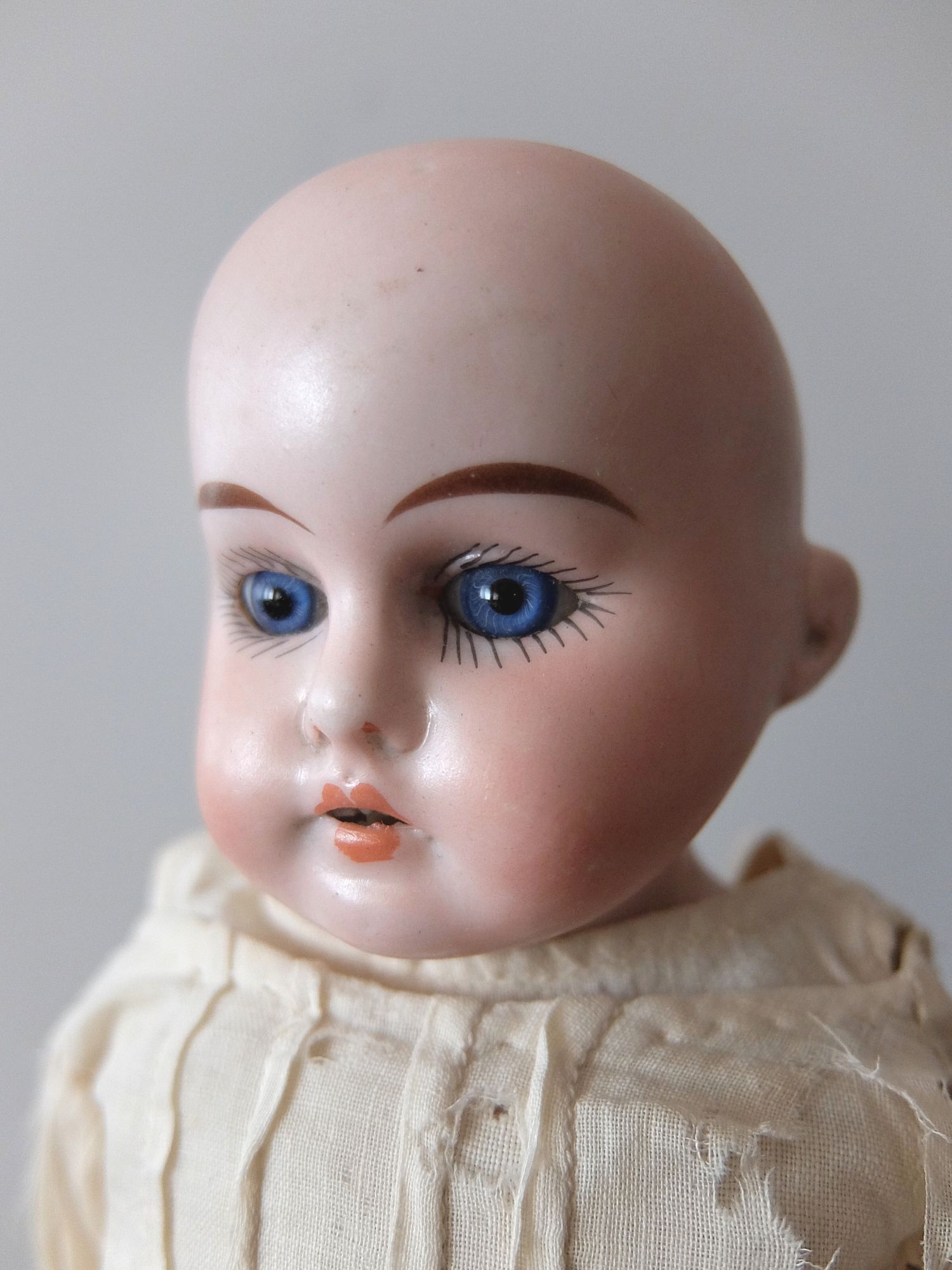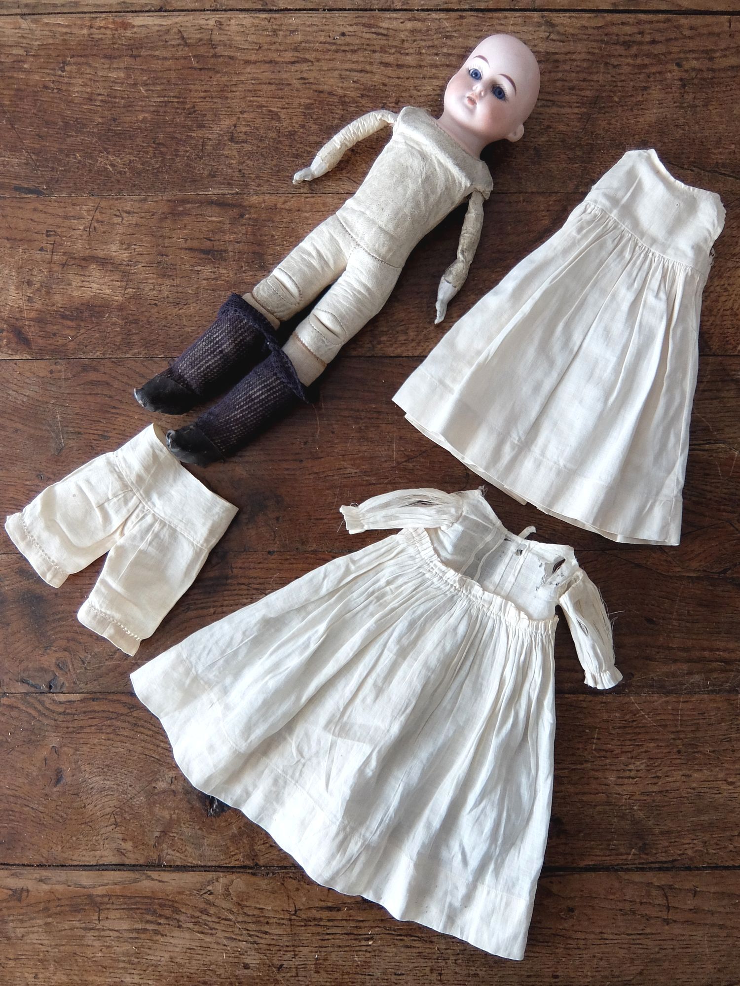 頭部と両腕は陶器、身体は本革でできたブルーの目の人形(ワンピース2点・パンタレット1点付)