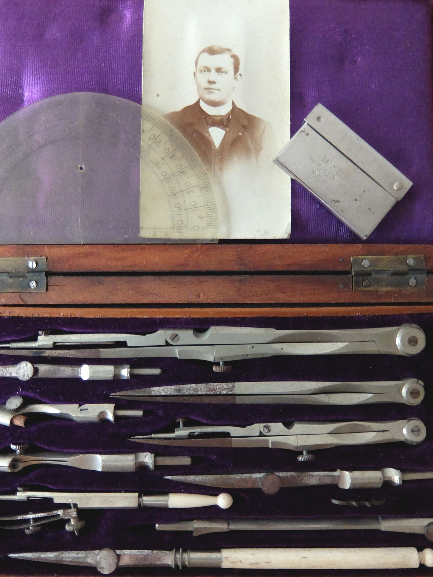 木製のケースに収まった古い製図セット (鍵付き・古紙2枚付き)