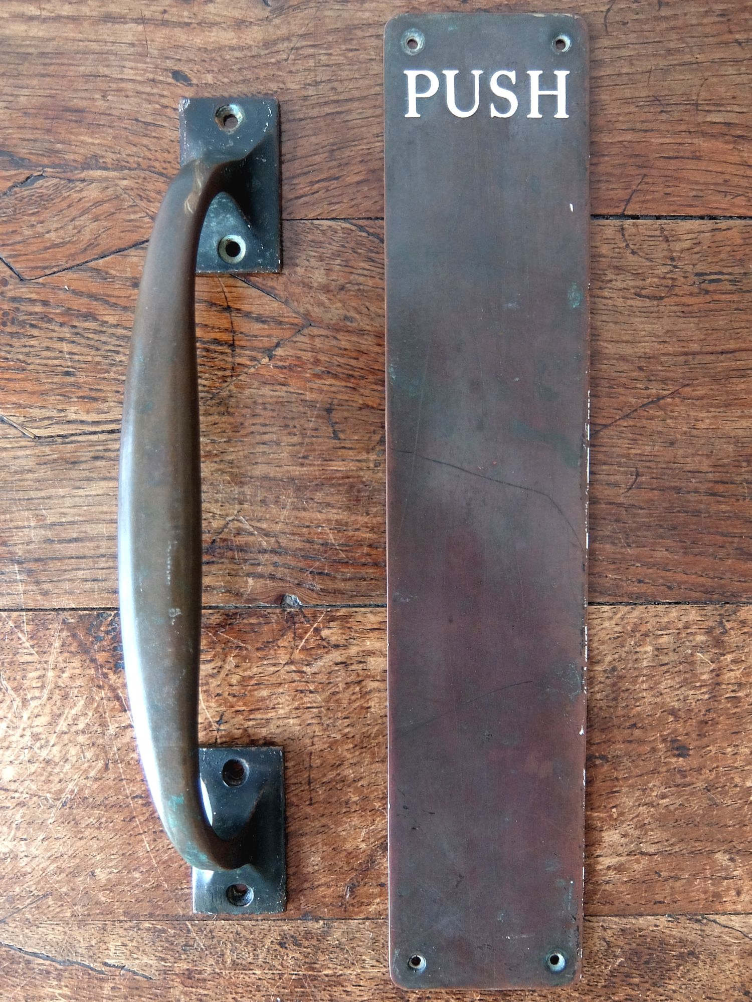 ”PUSH”と”PULL”の文字が刻まれた真鍮製のドアハンドルのセット