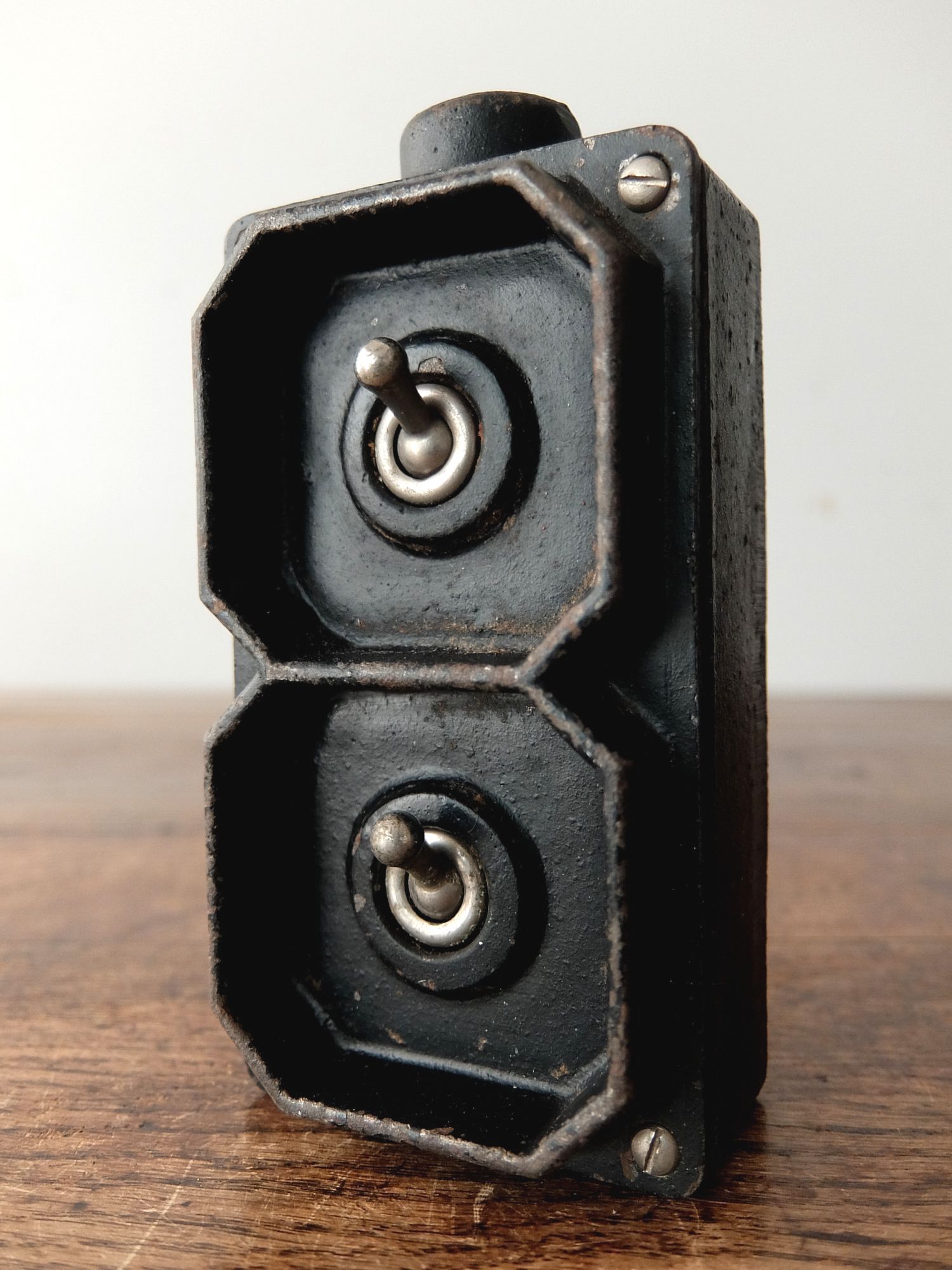 工場や倉庫で使用されていた鉄のケースに収まったロータリースイッチ