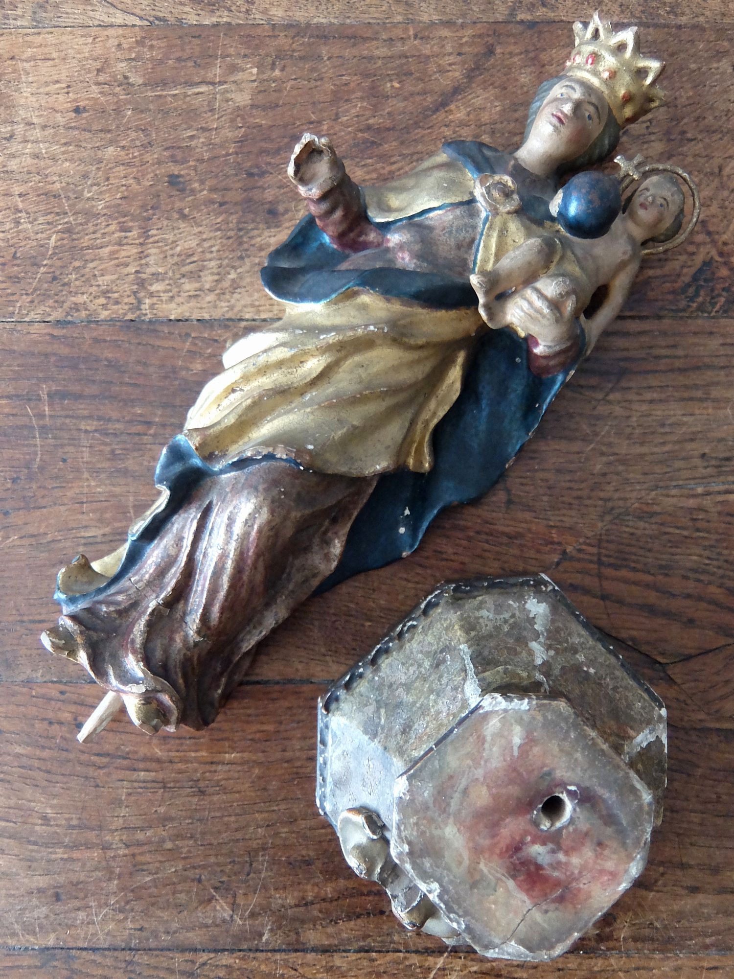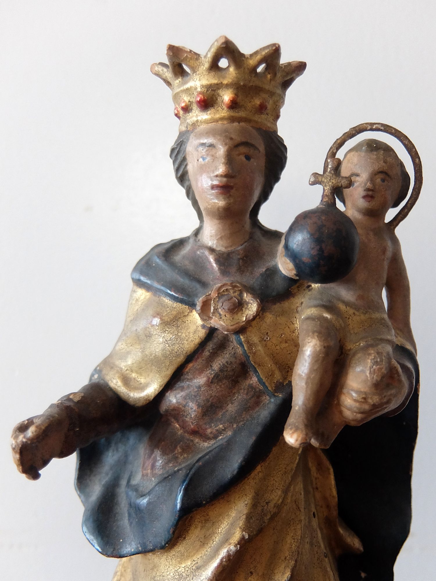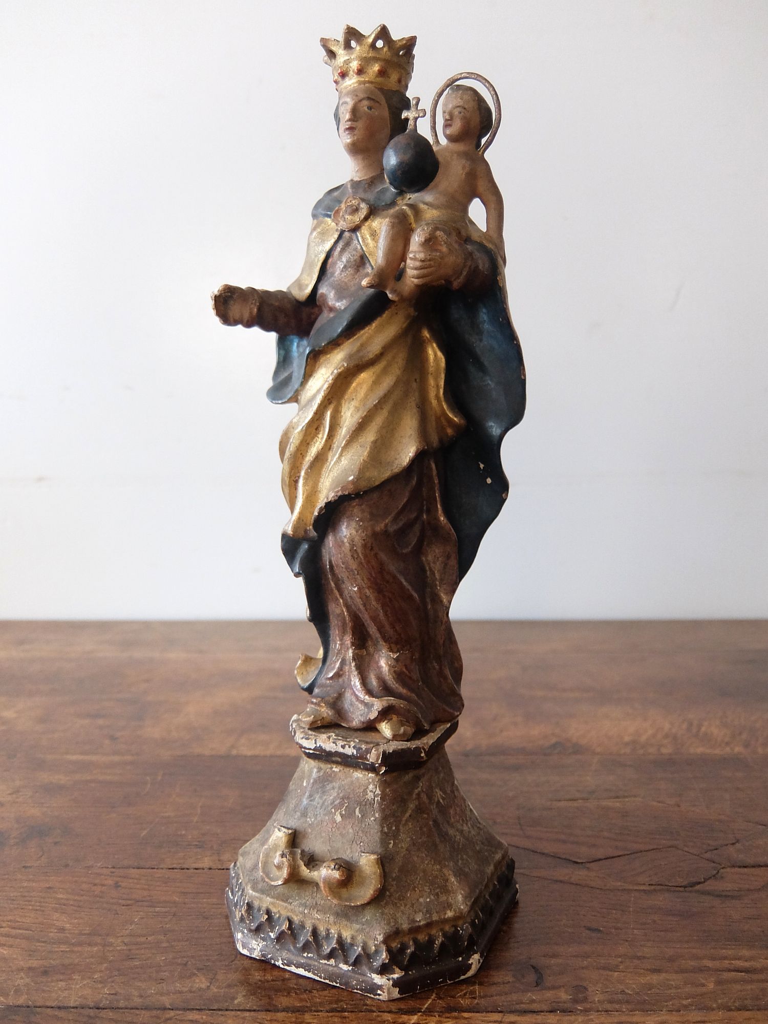 朽ちた塗装の雰囲気が美しい木製のジーザスを抱くマリア像