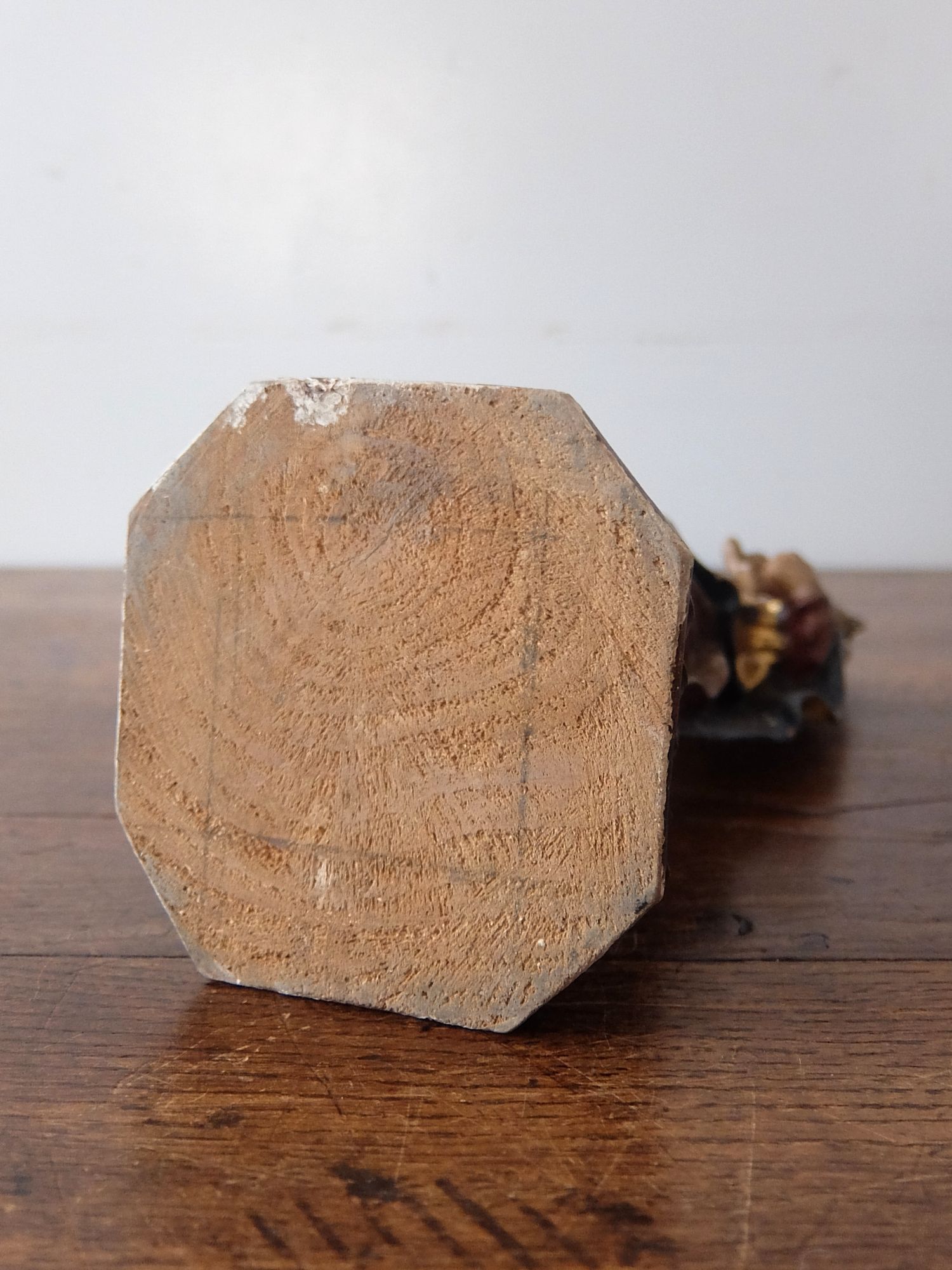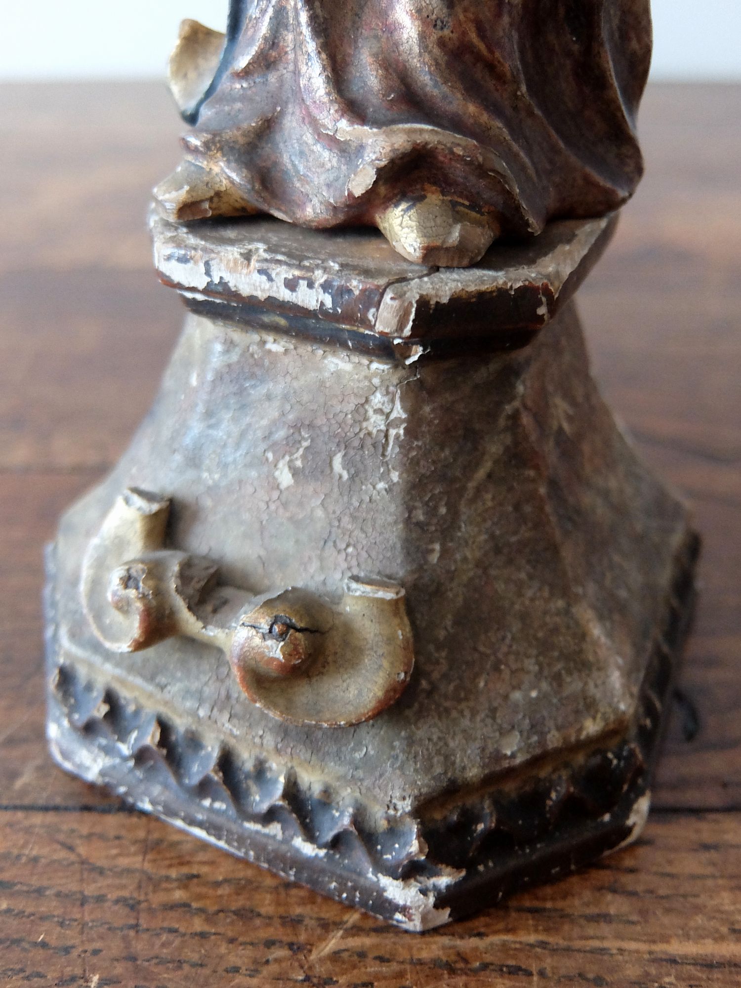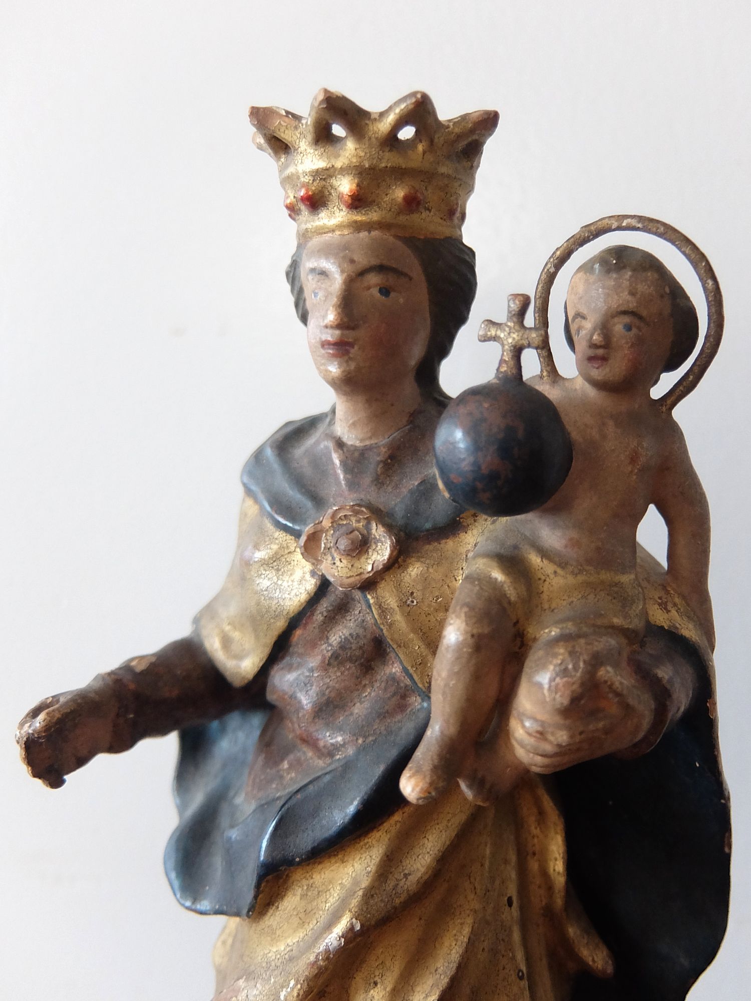 朽ちた塗装の雰囲気が美しい木製のジーザスを抱くマリア像