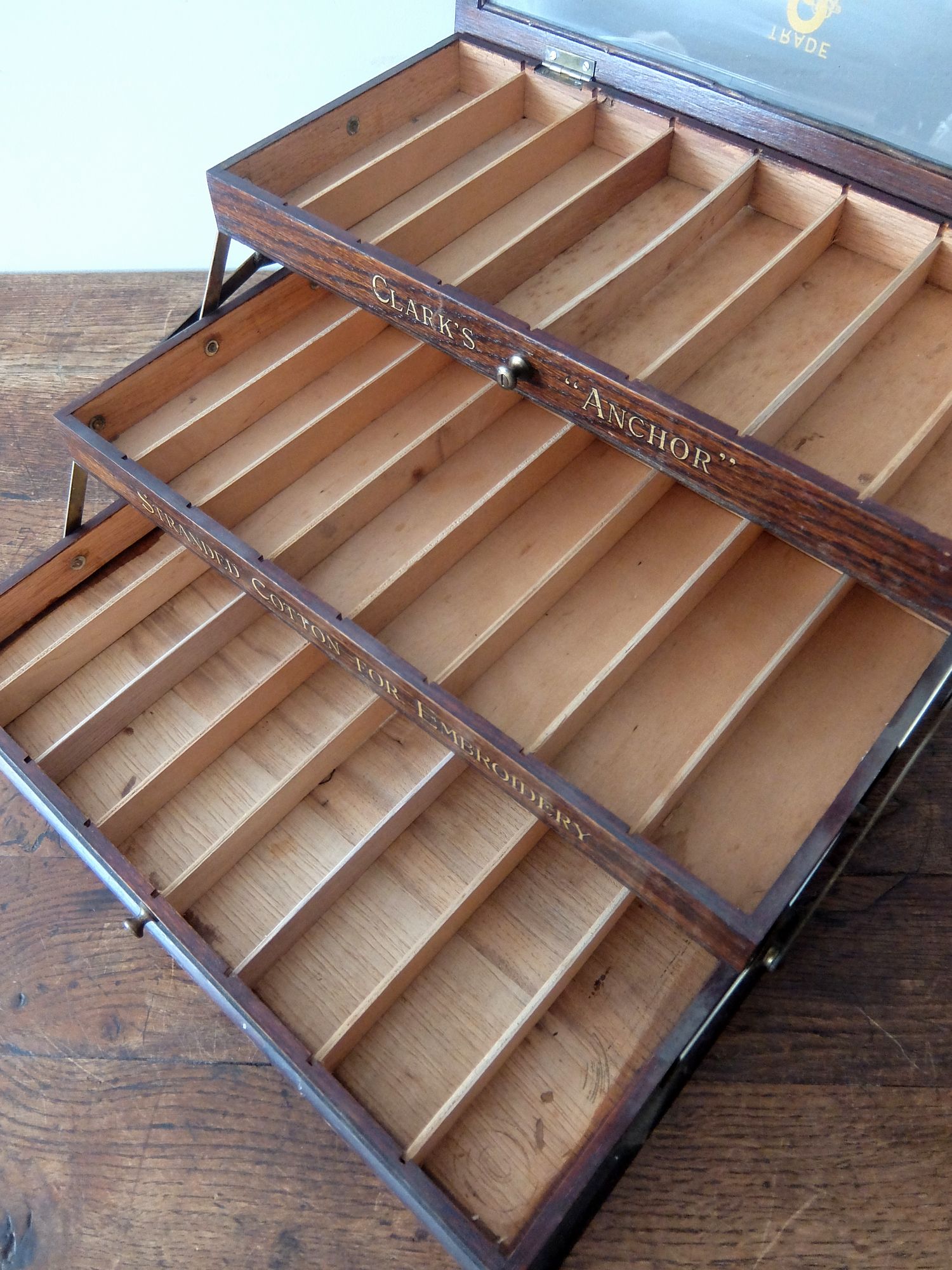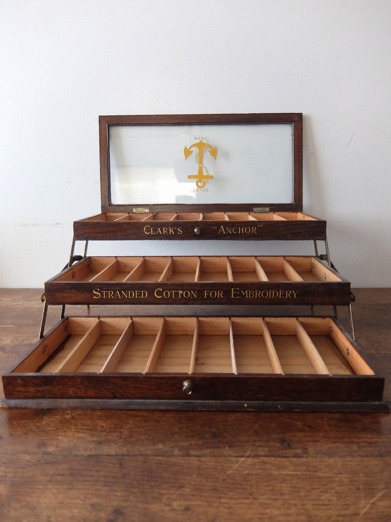 シザー金具により段違いにディスプレイ可能な【Clark's】社製の糸用展示ケース