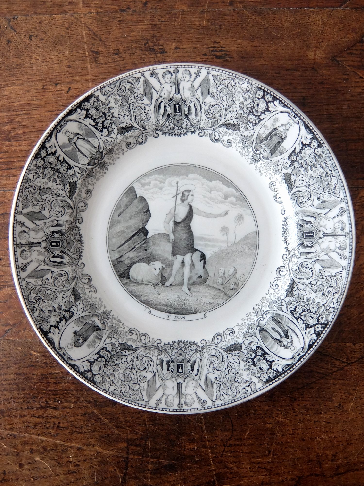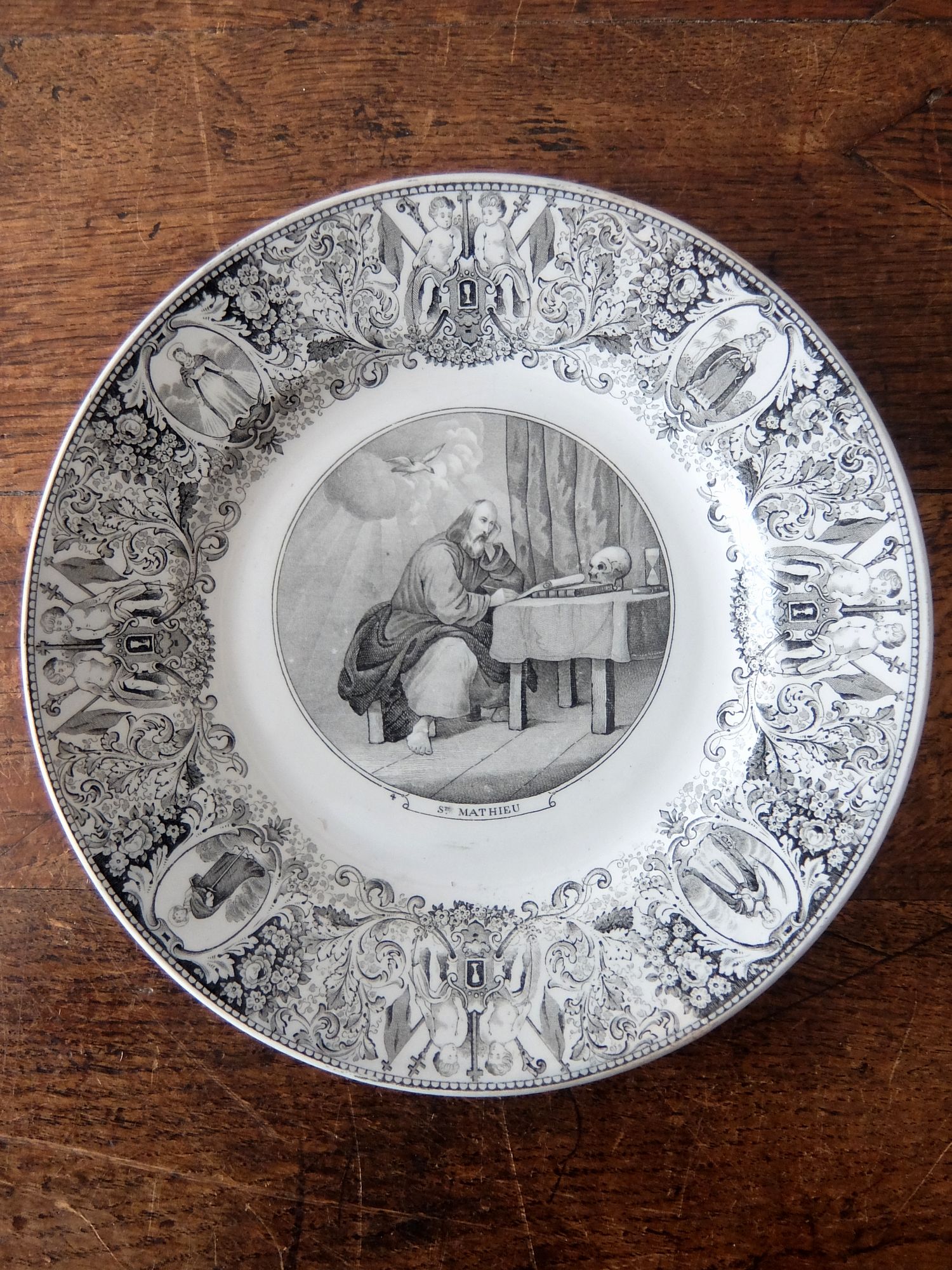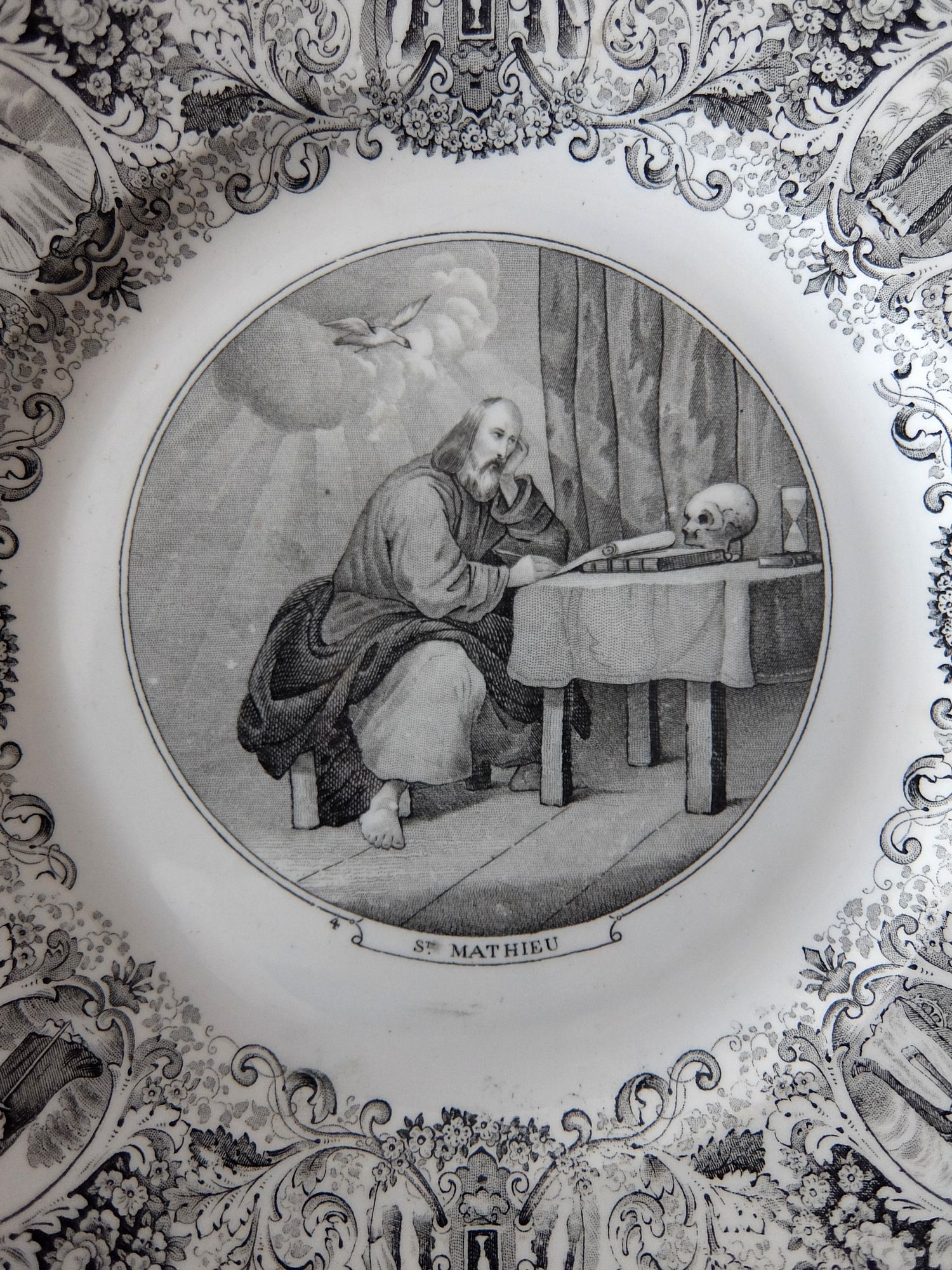 19世紀中期に作られた聖人が描かれたクレイユ・エ・モントローのGrisailleの平皿【No.4:聖マタイ、No.7:聖ジャン、No.12:聖セシリア】