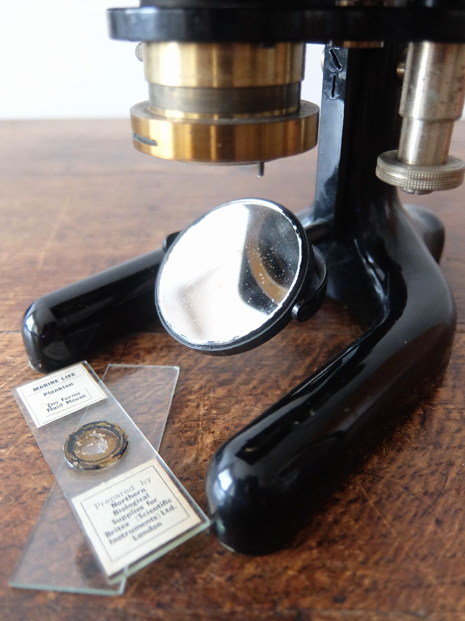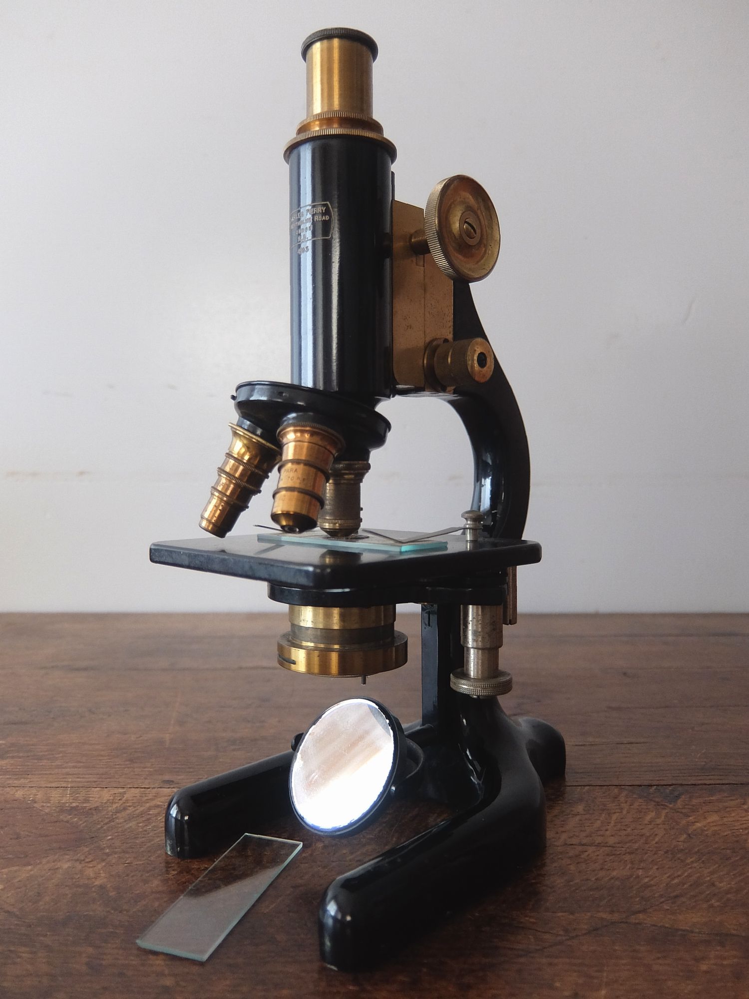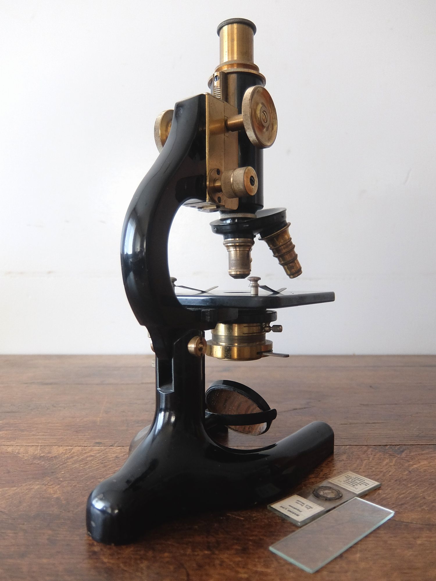 経年の雰囲気が美しい真鍮製顕微鏡(プレパラート1枚付)