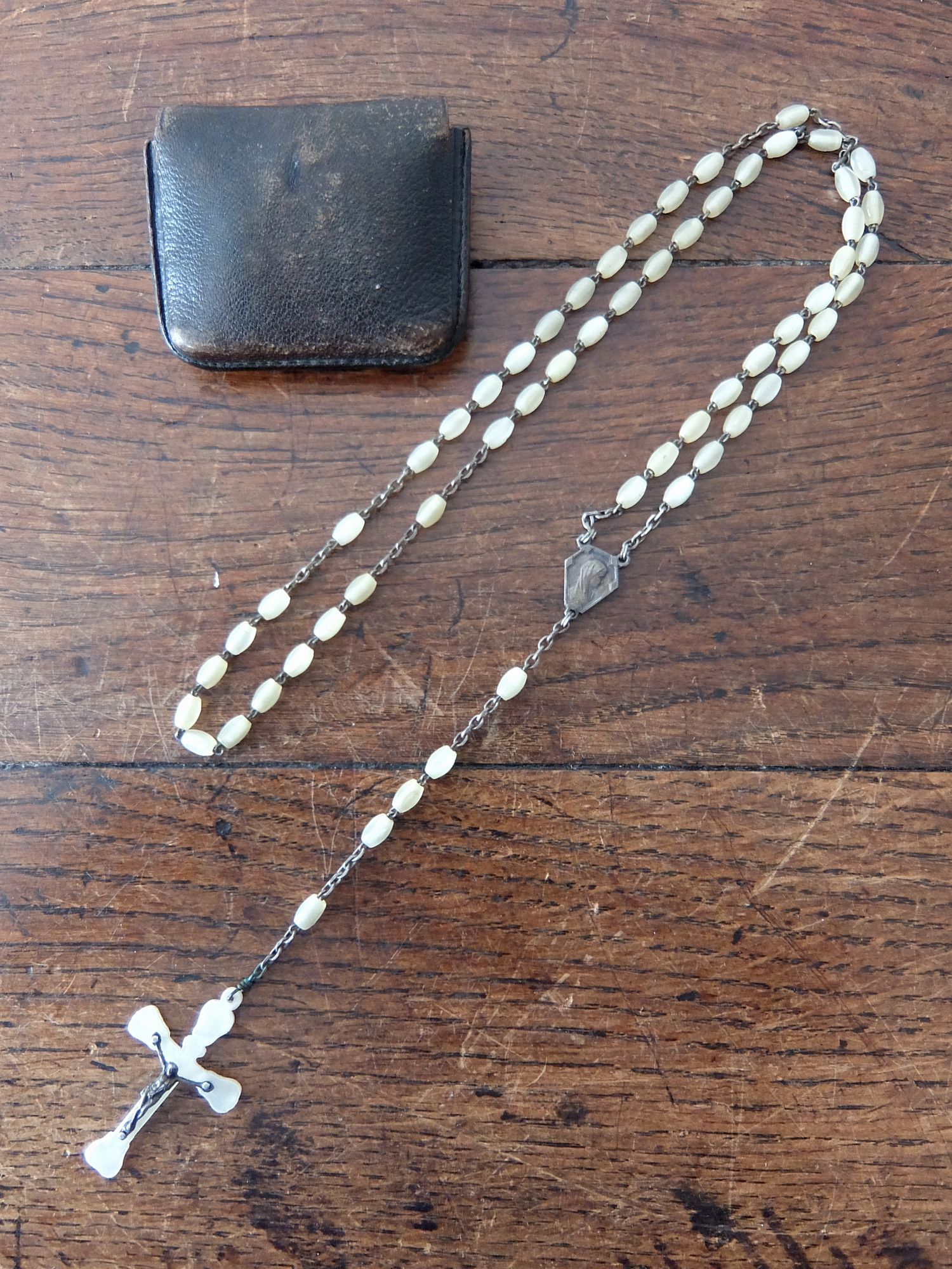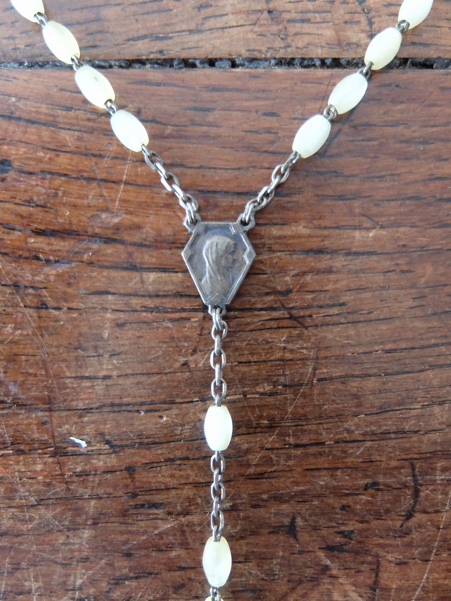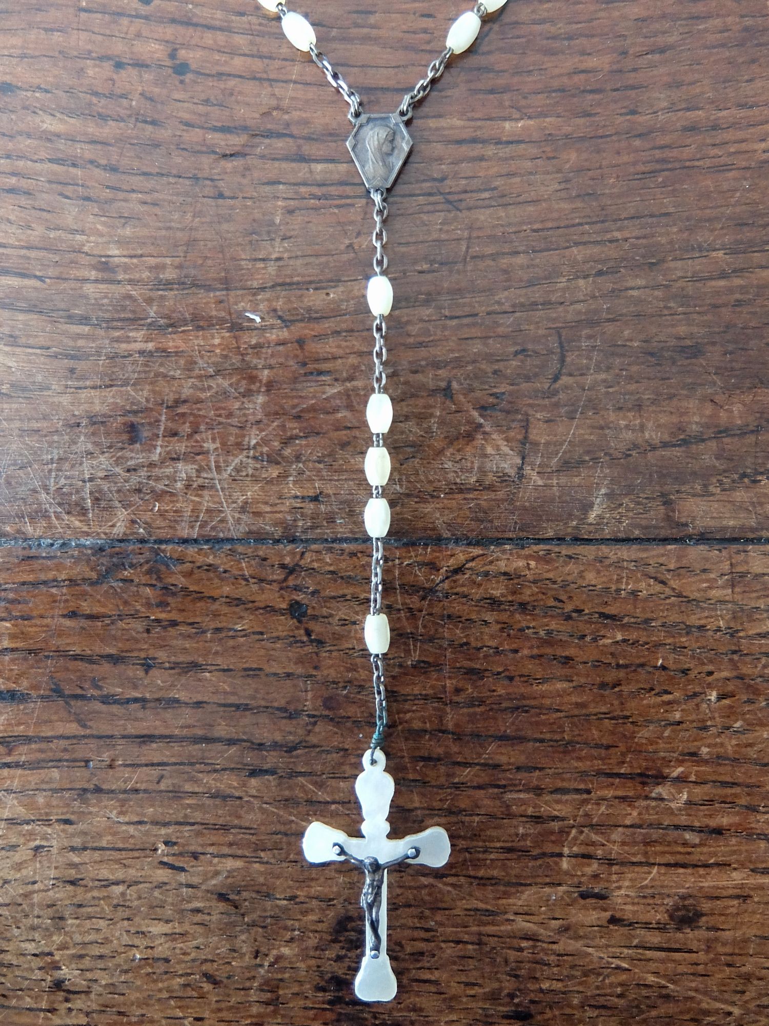 経年の雰囲気が美しい白蝶貝のビーズのロザリオ (チェーン長:520mm) ※ケース付き