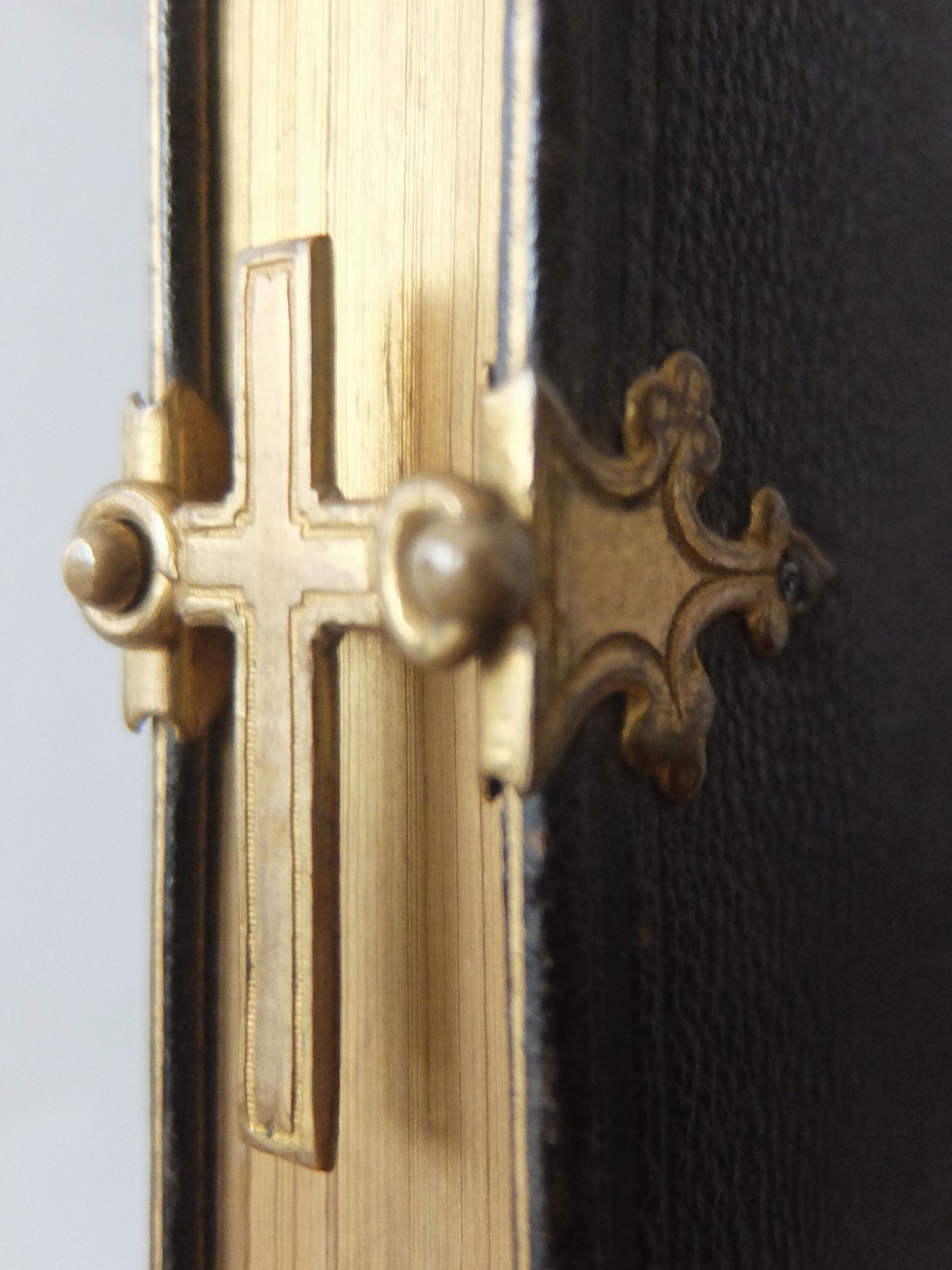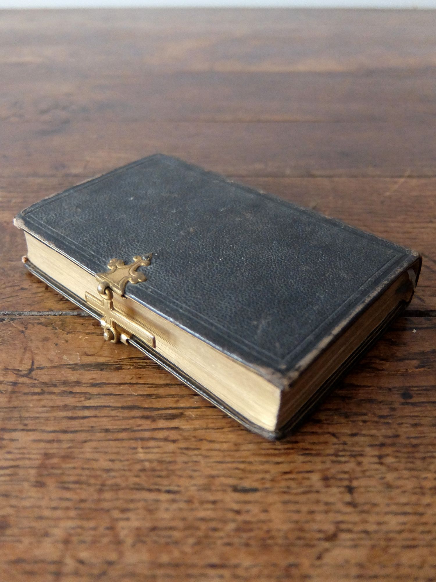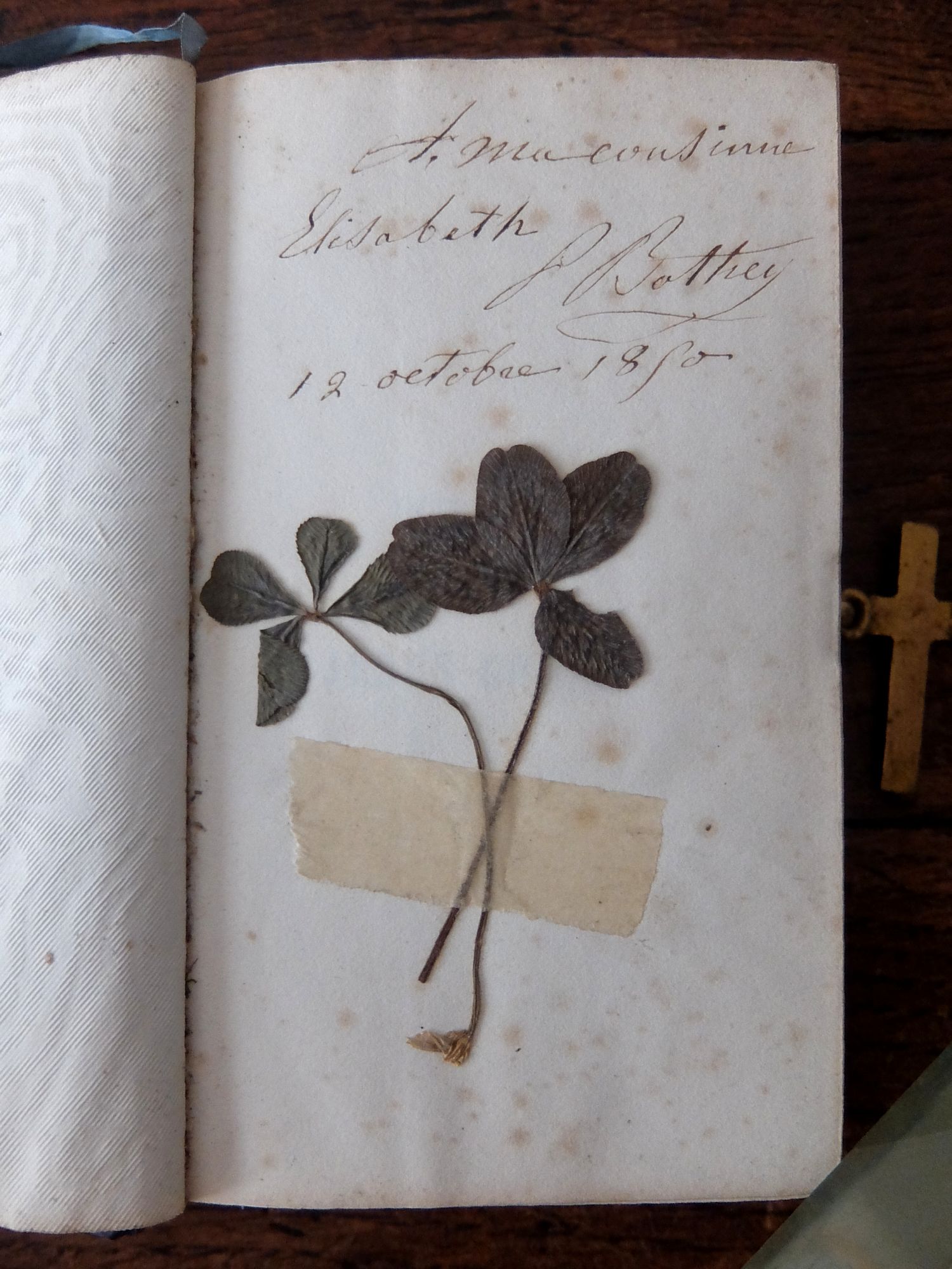 真鍮製の留め金の装飾が美しい四つ葉のクローバーが挟まった聖書