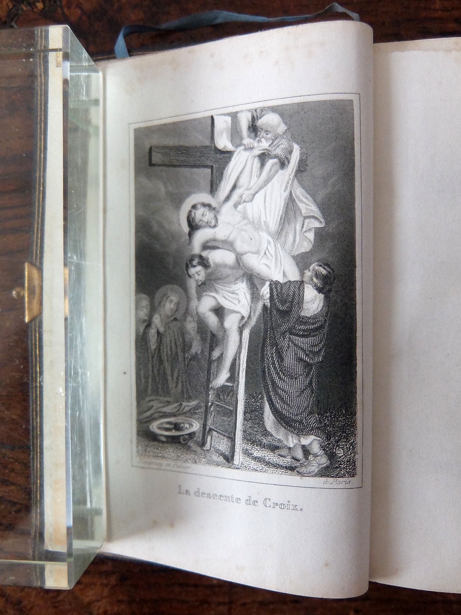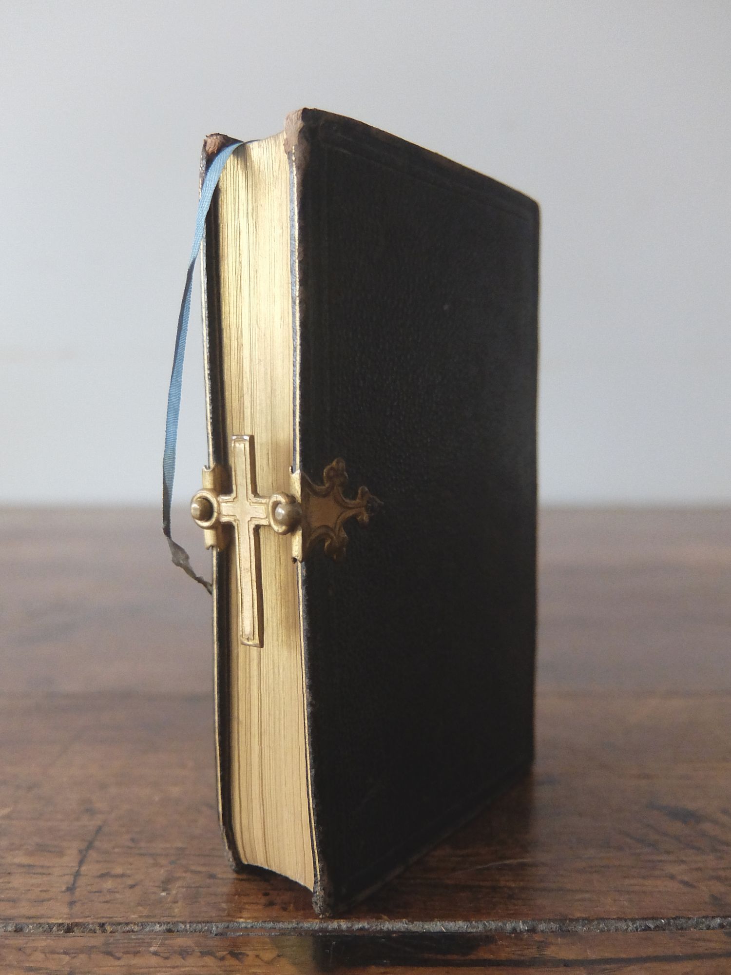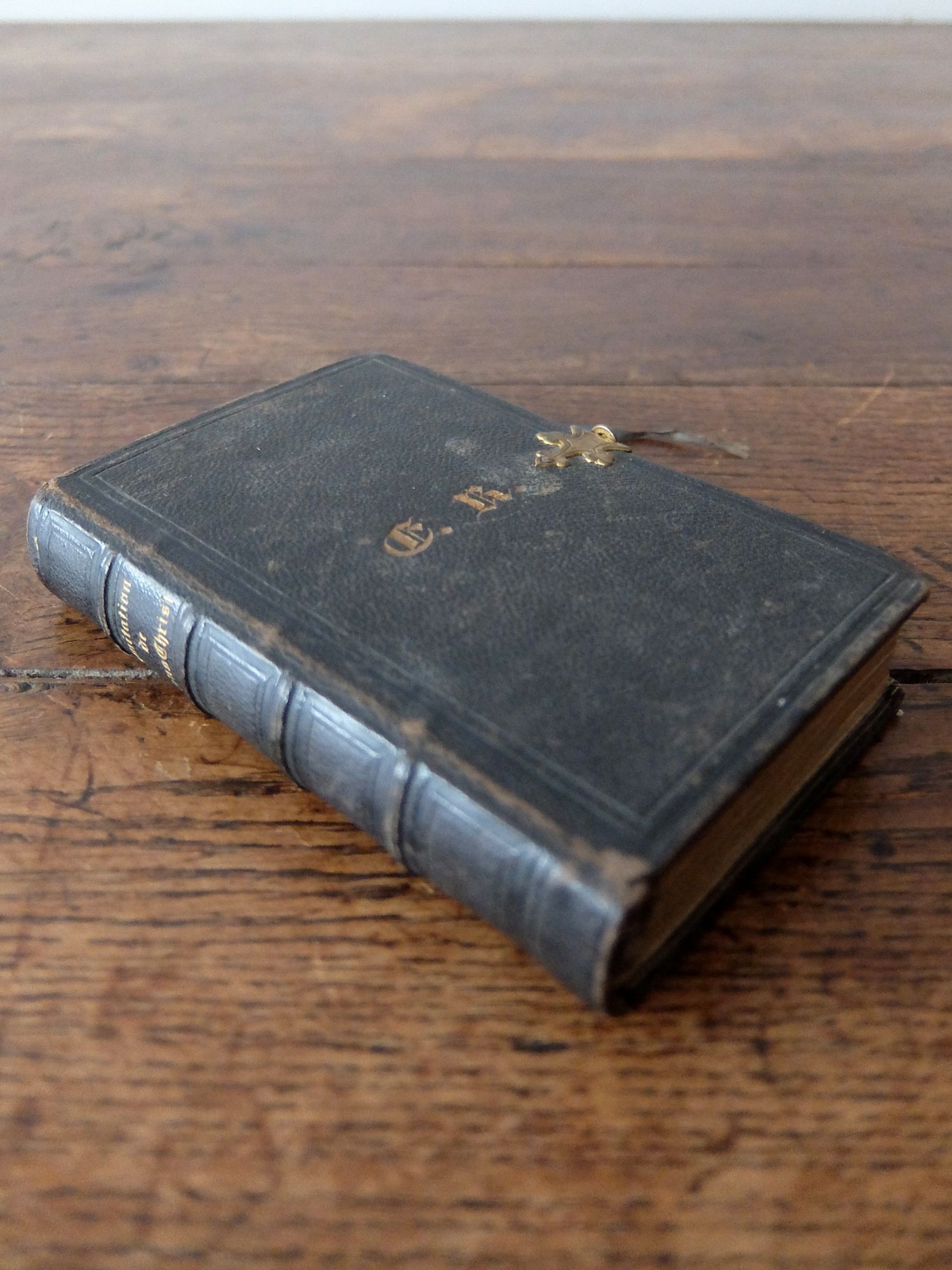 真鍮製の留め金の装飾が美しい四つ葉のクローバーが挟まった聖書