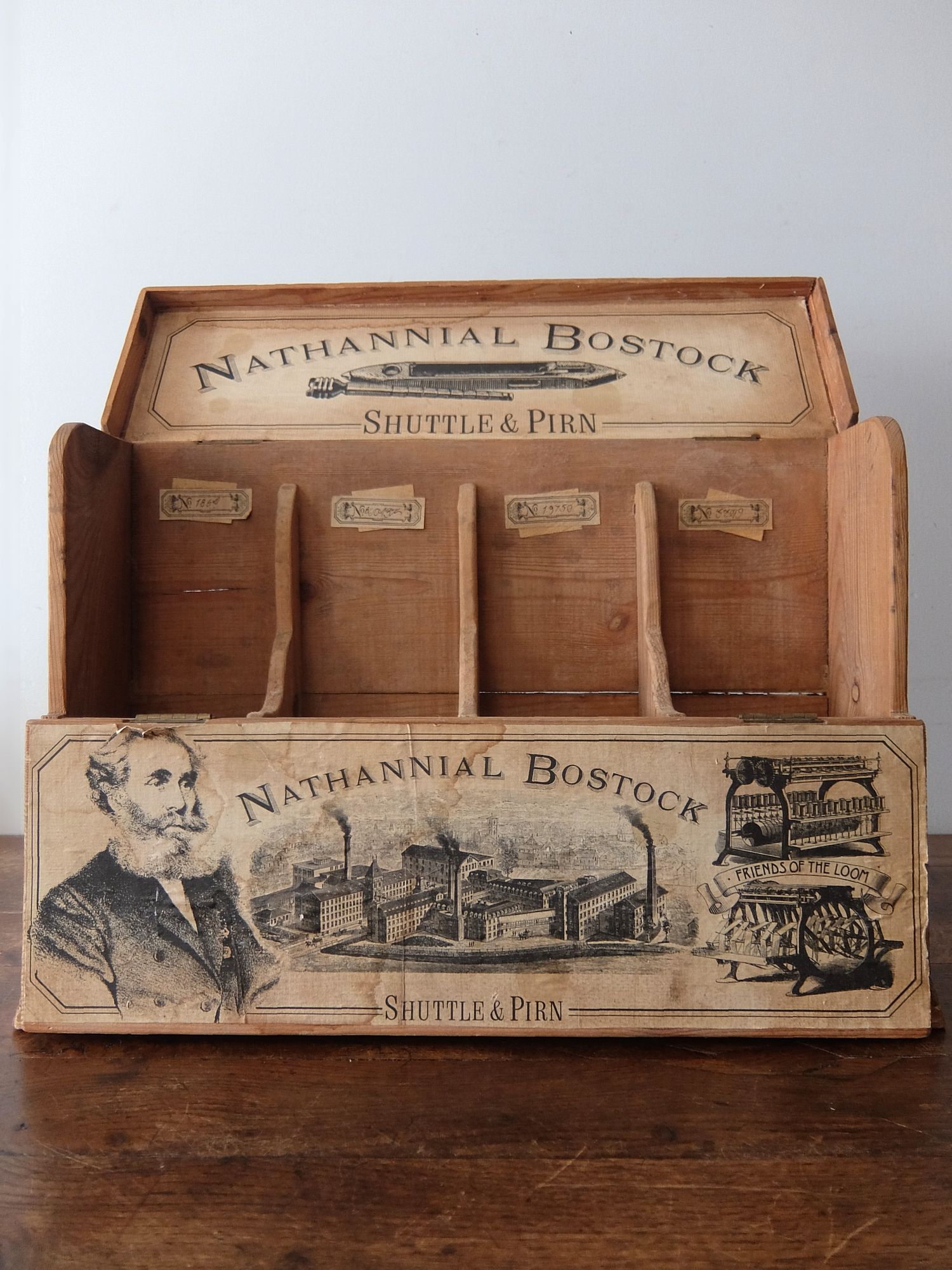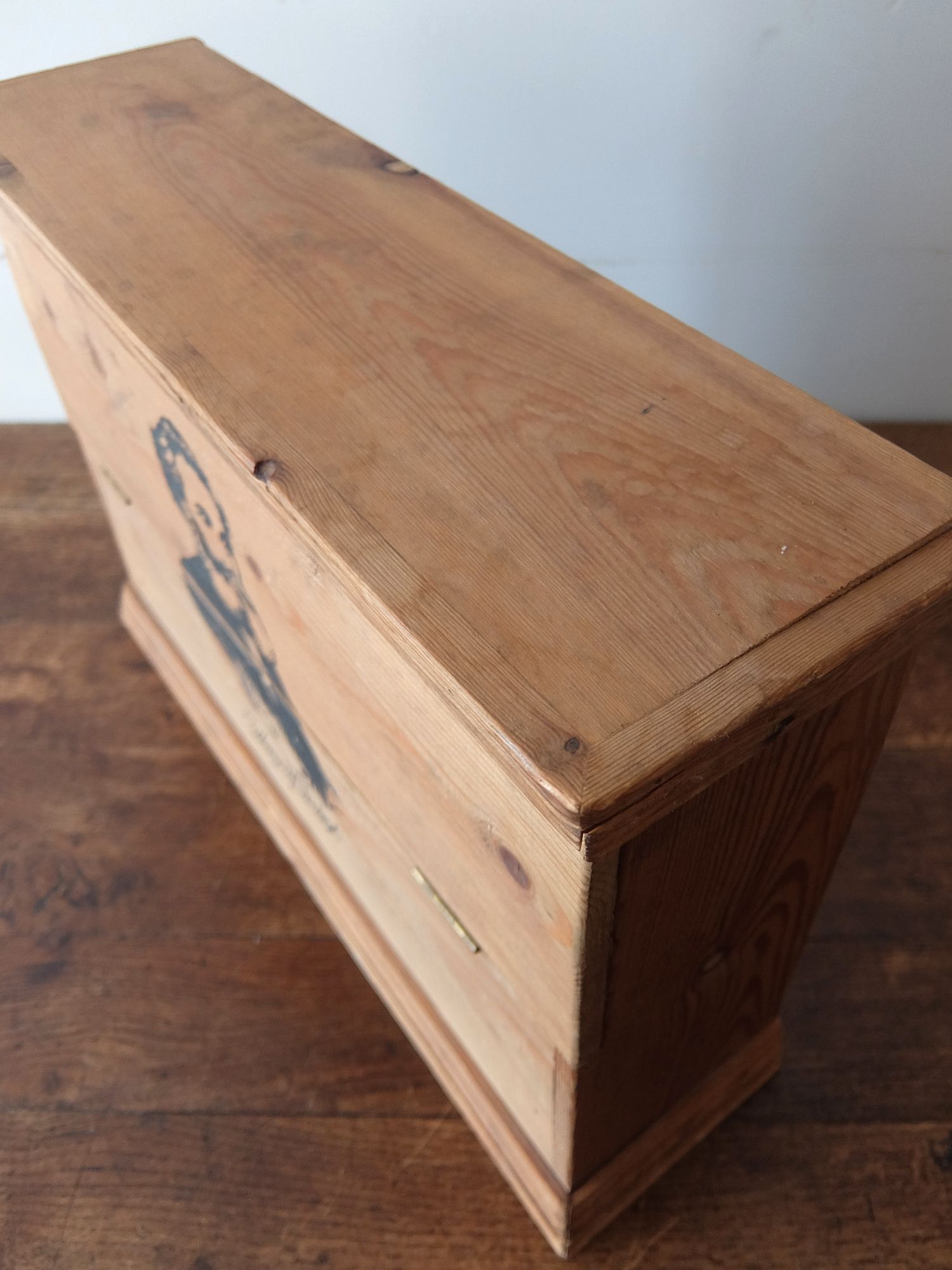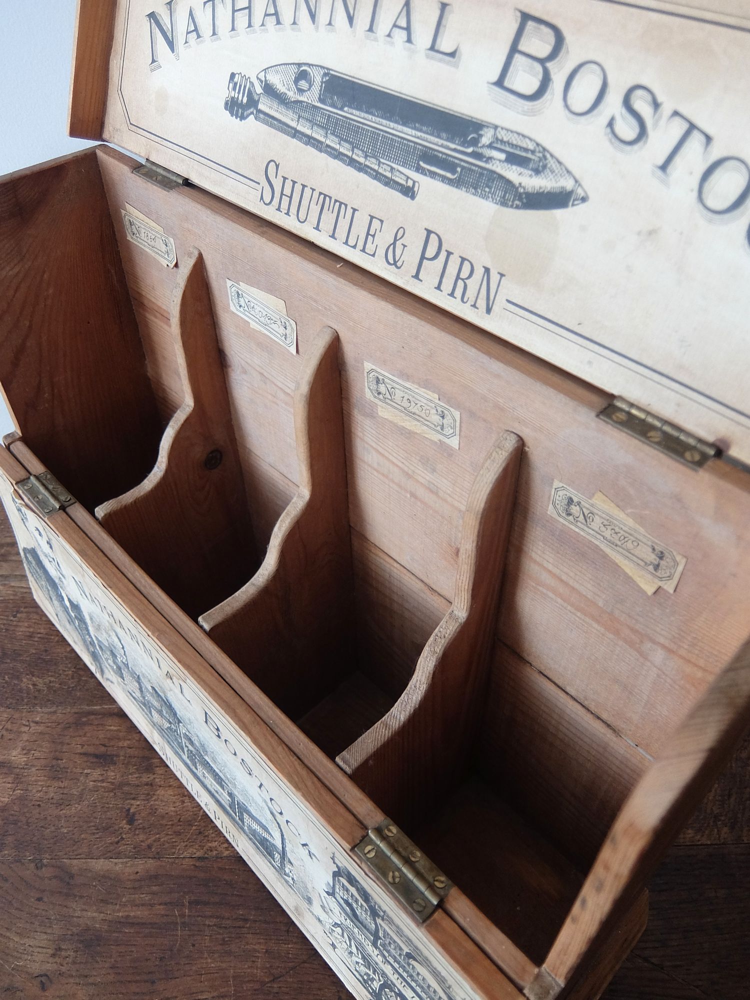 工業用ミシンの糸巻きが収納されていたパイン材の木箱
