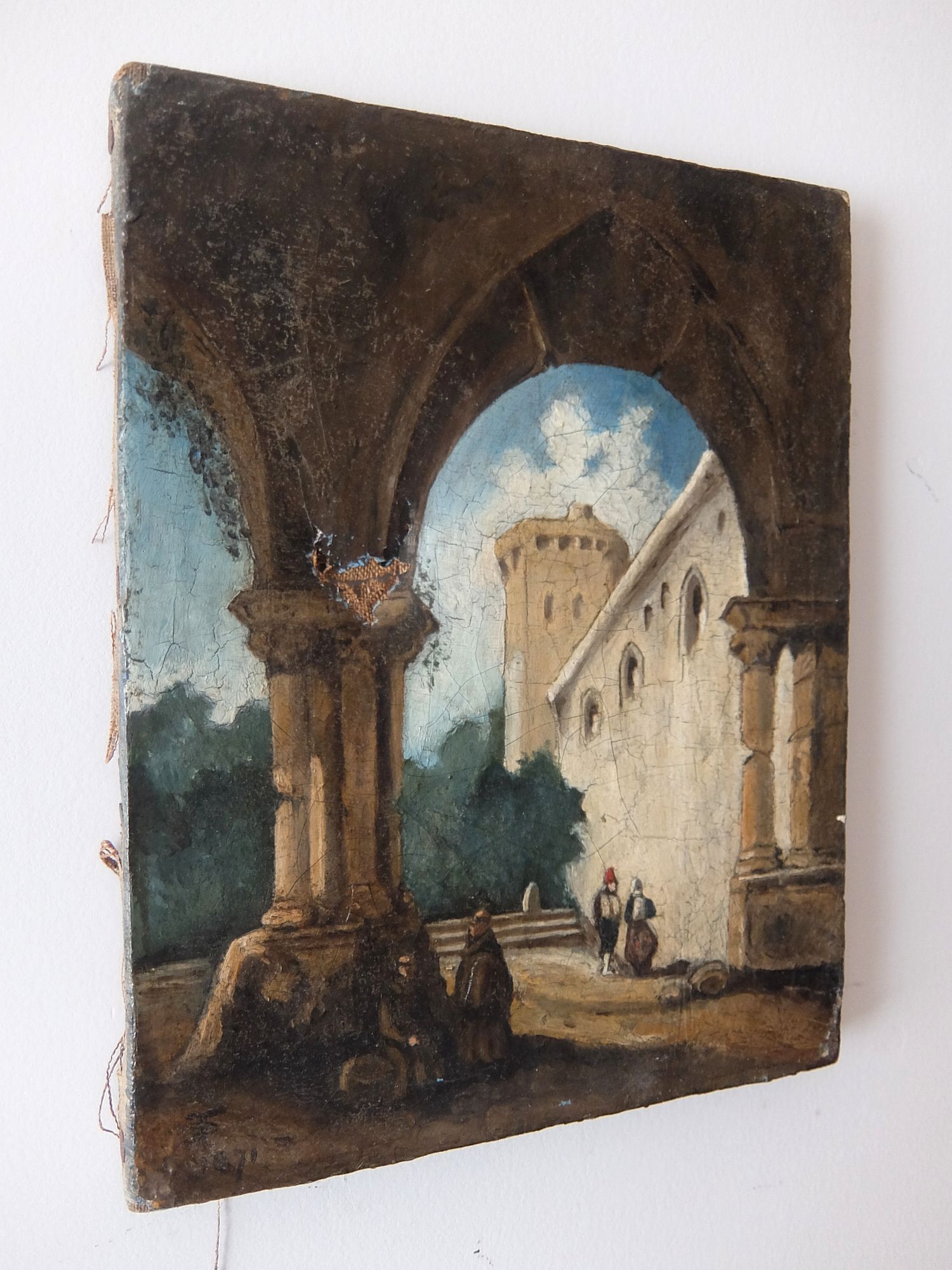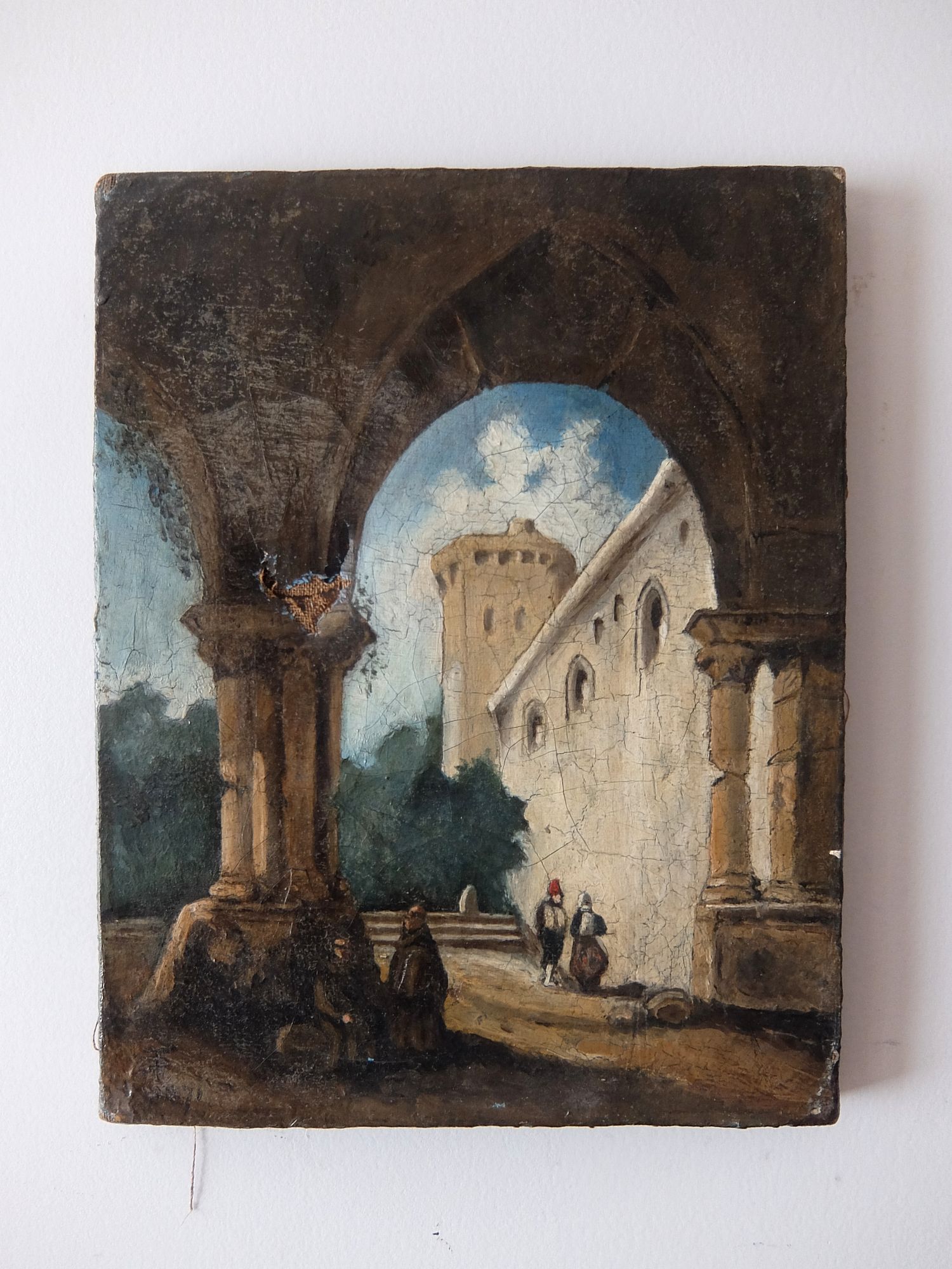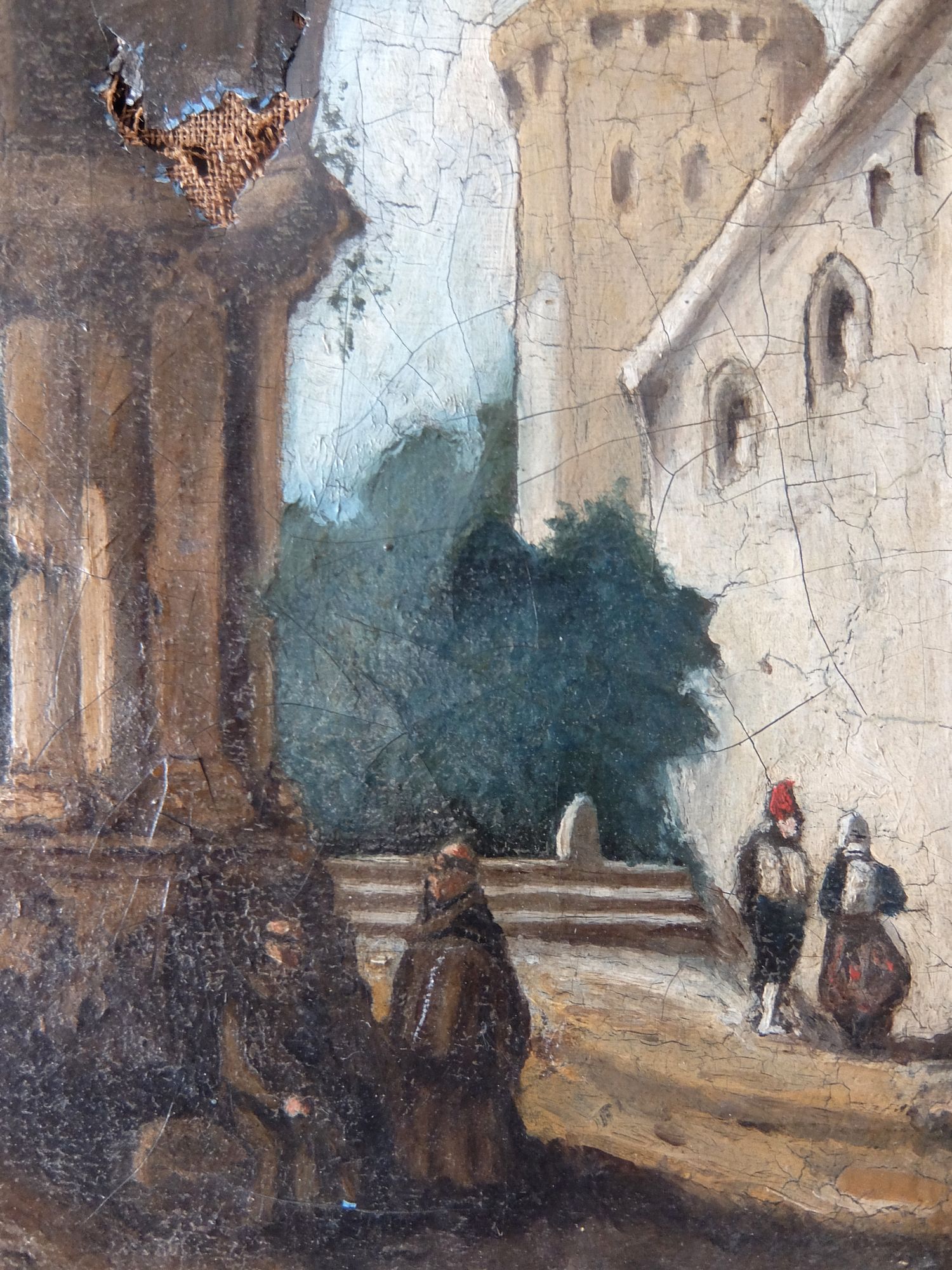 城壁にたたずむ兵士と僧侶の油絵