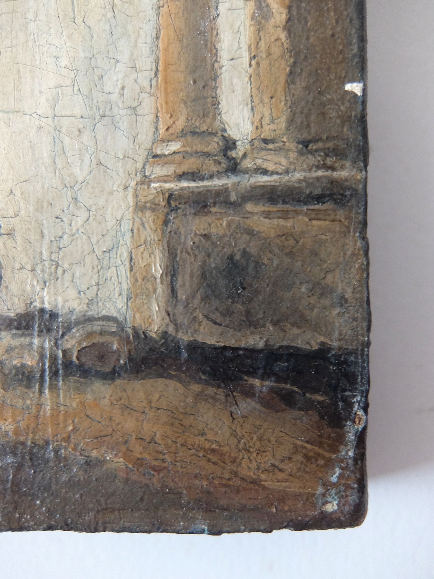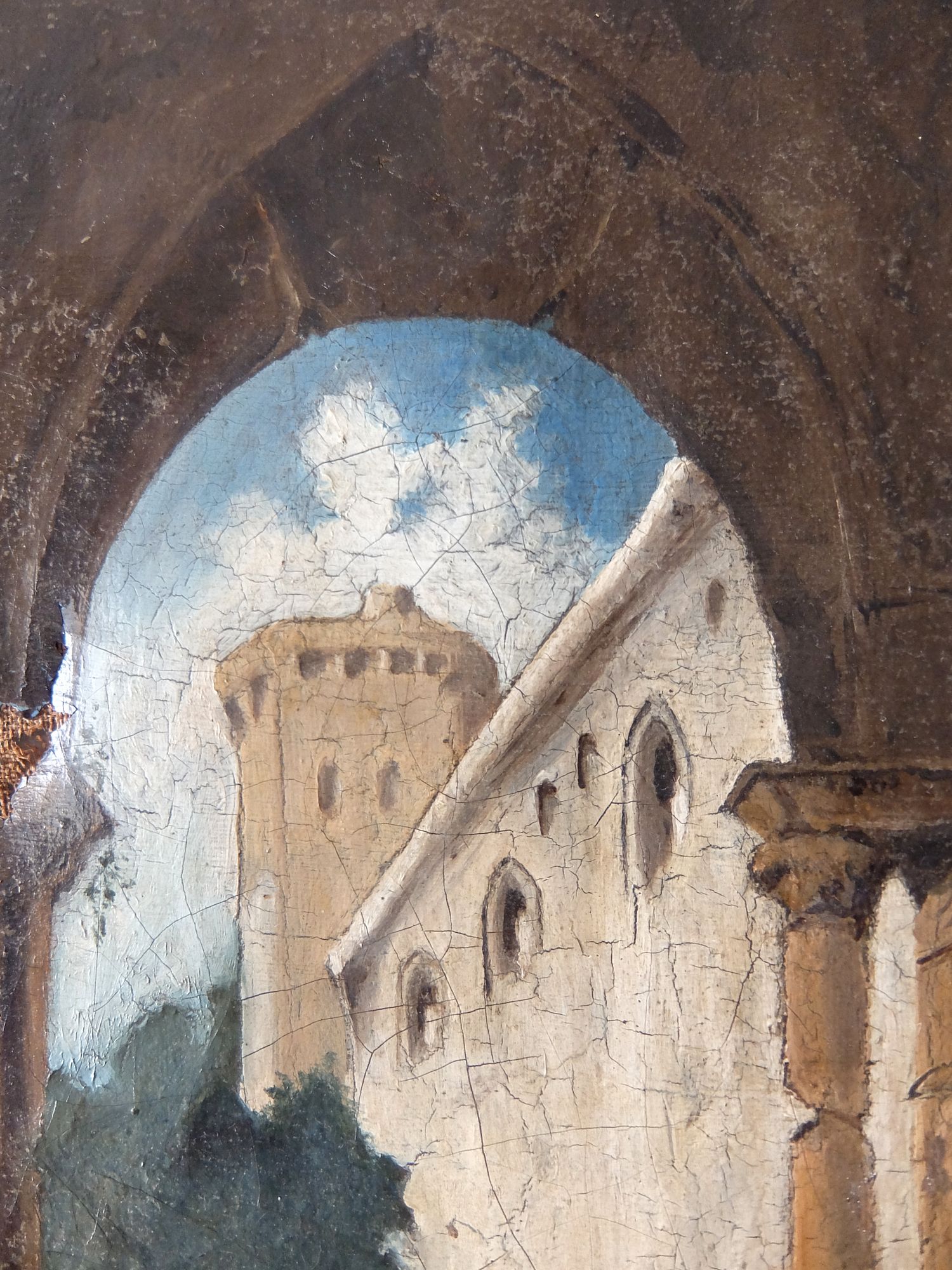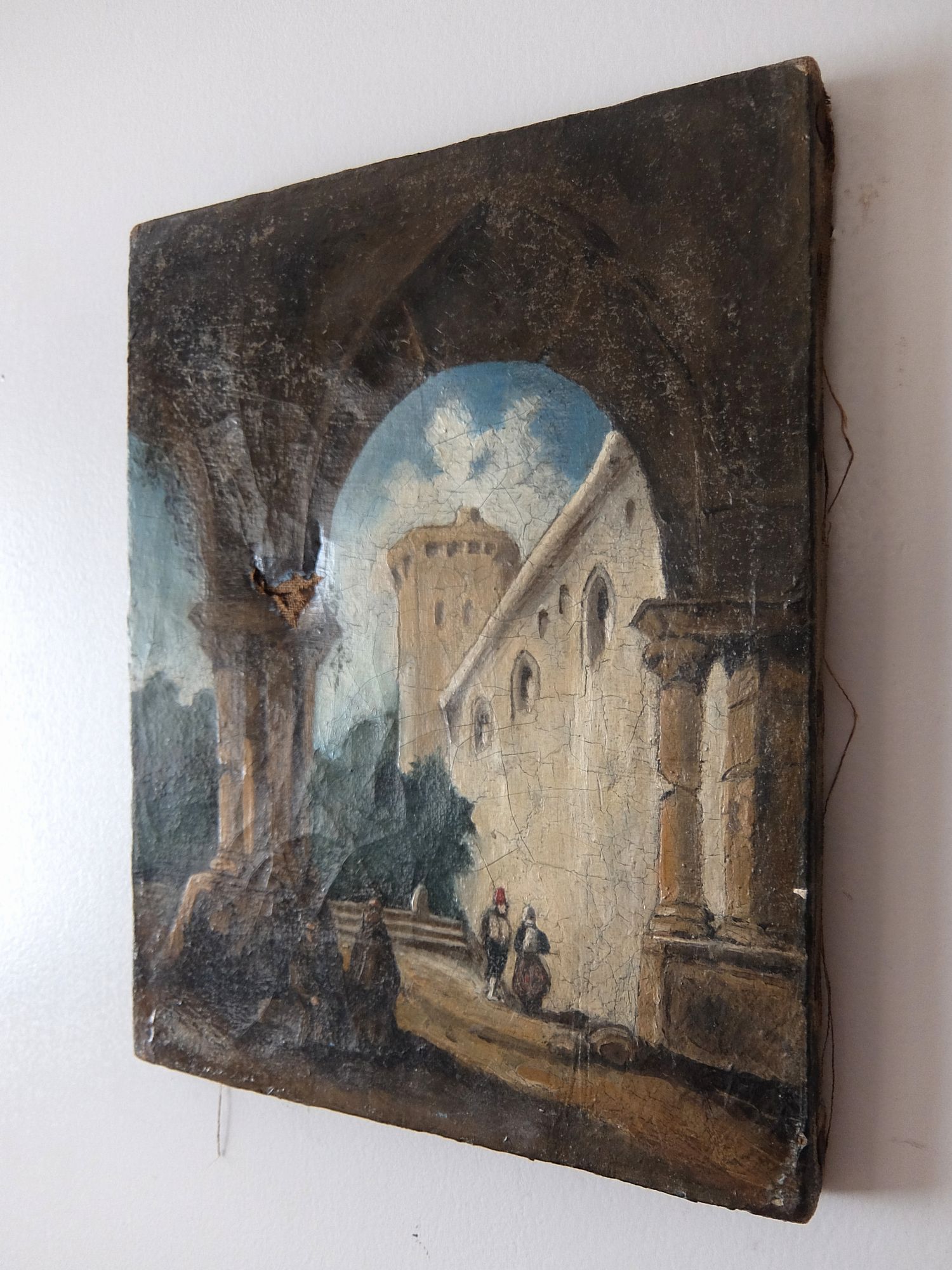 城壁にたたずむ兵士と僧侶の油絵