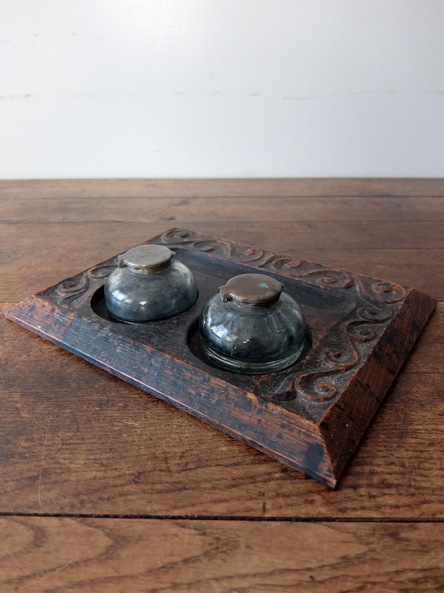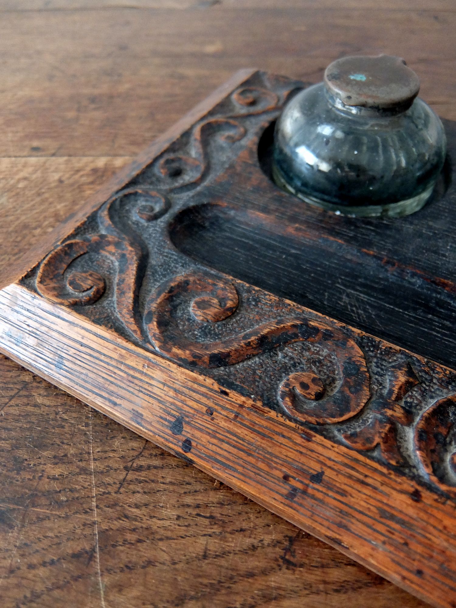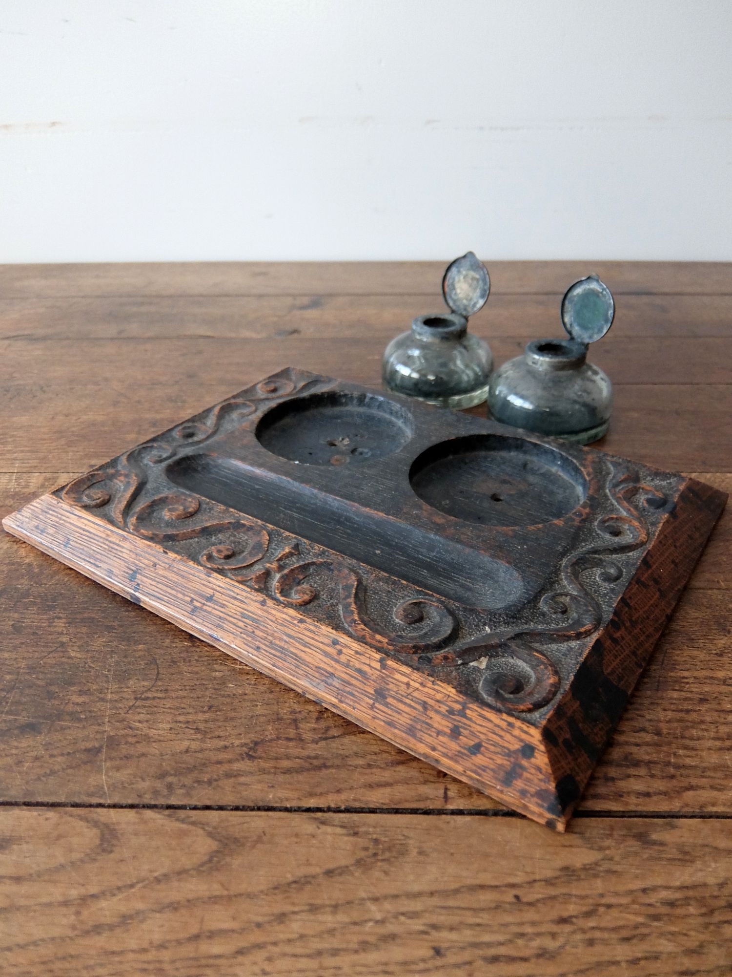 オーク材を削り出した土台と経年の雰囲気が魅力的なインク瓶