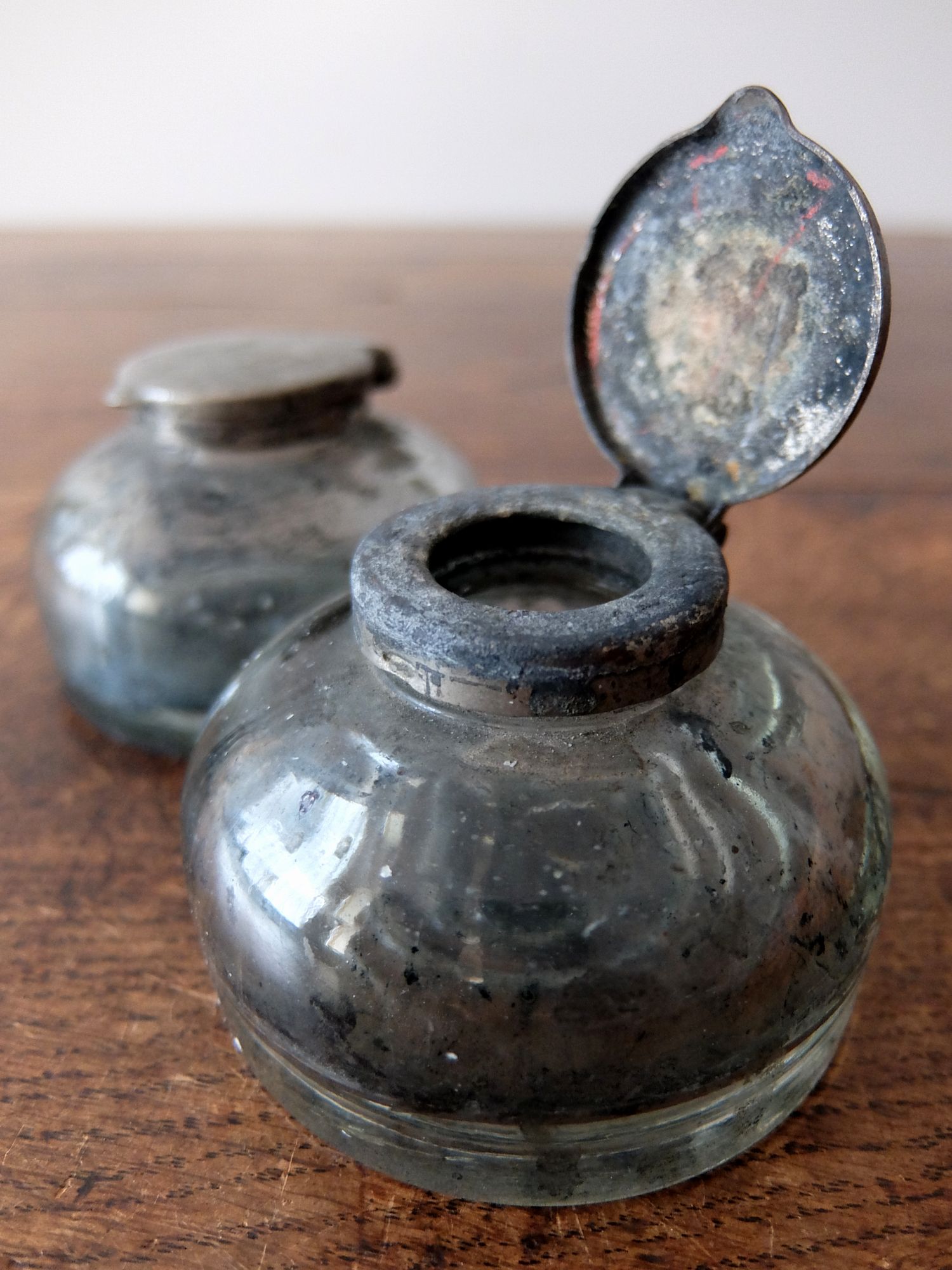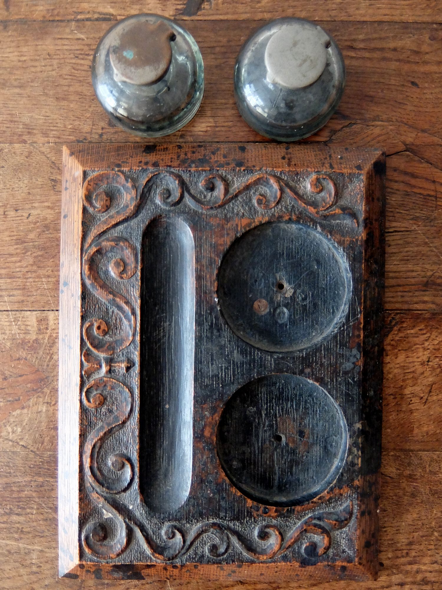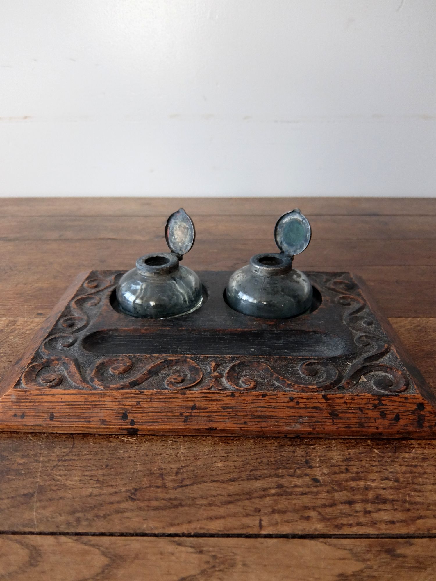 オーク材を削り出した土台と経年の雰囲気が魅力的なインク瓶