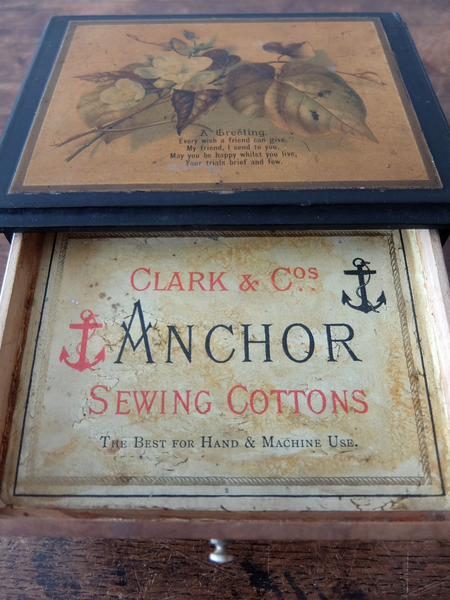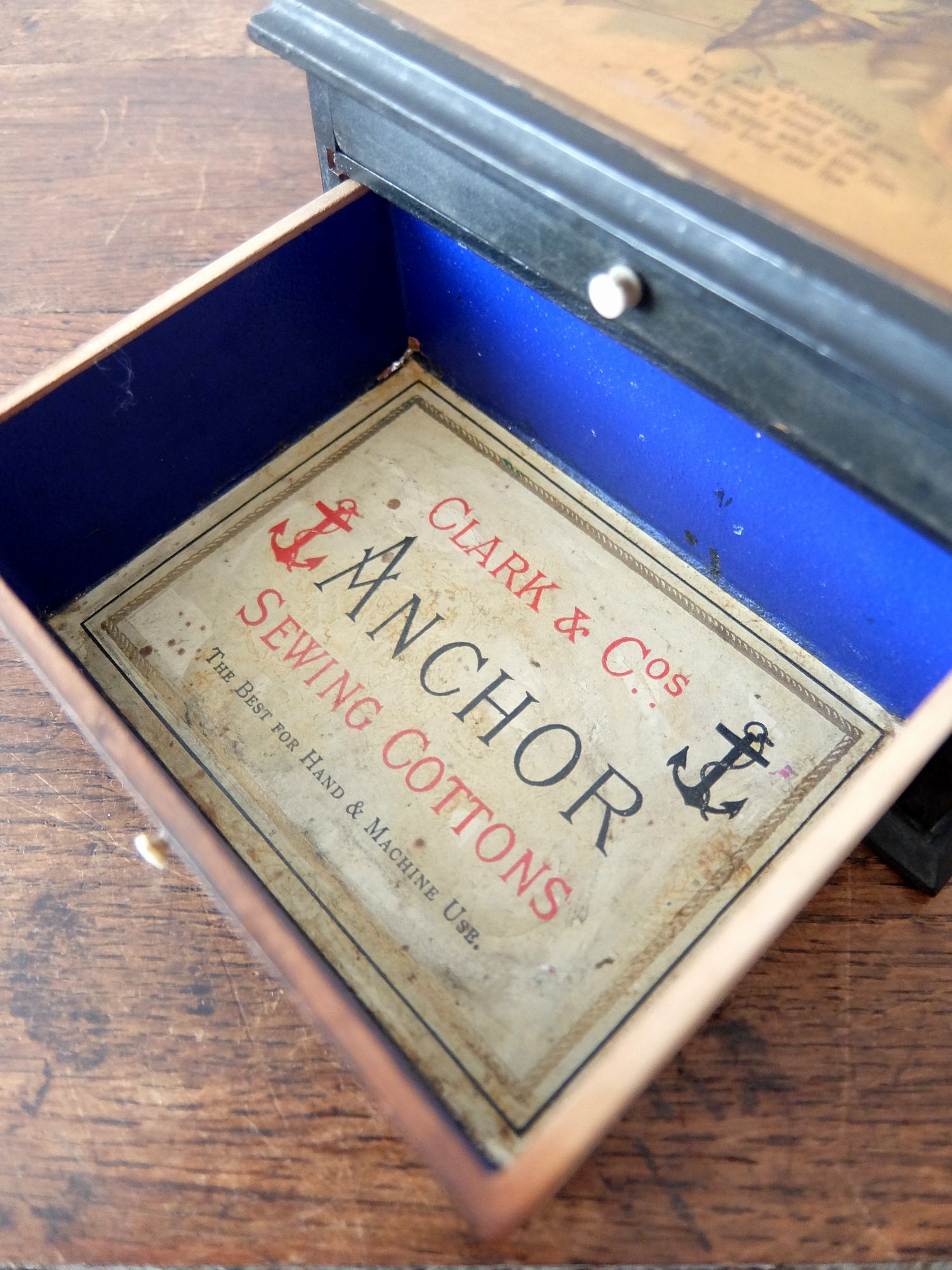 雰囲気のあるラベルが魅力的な【Clark & Co. Anchor】社製の裁縫箱