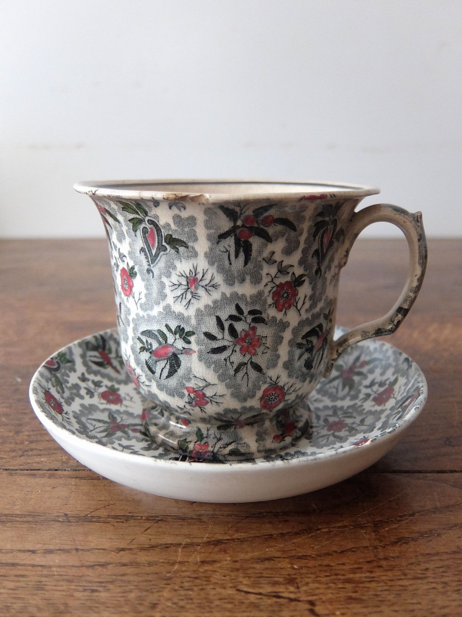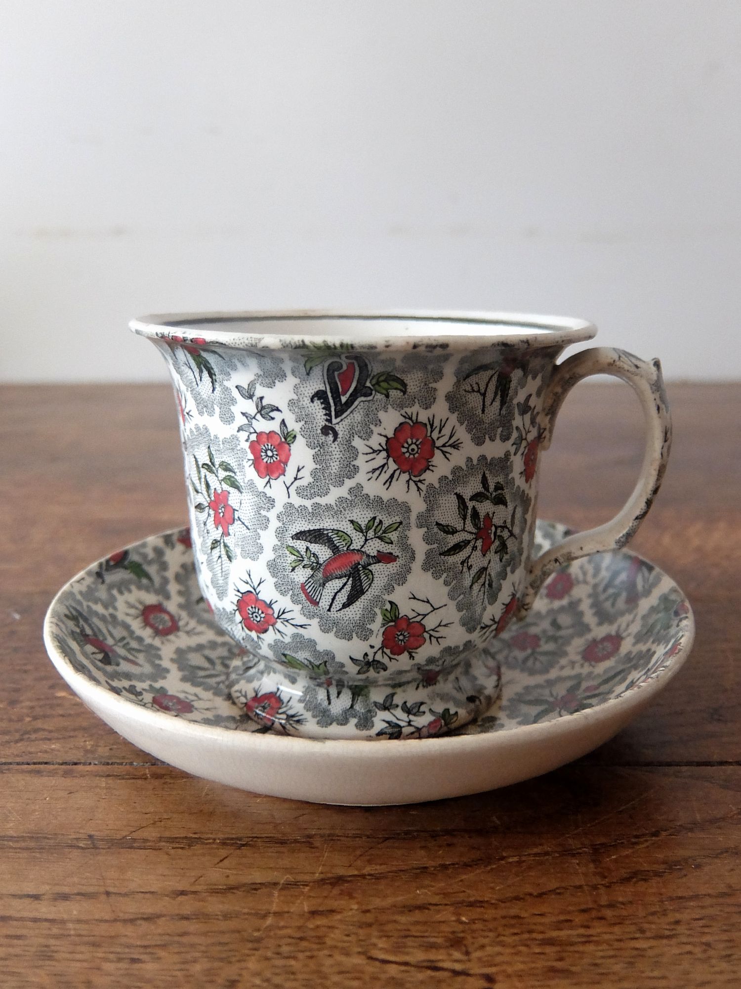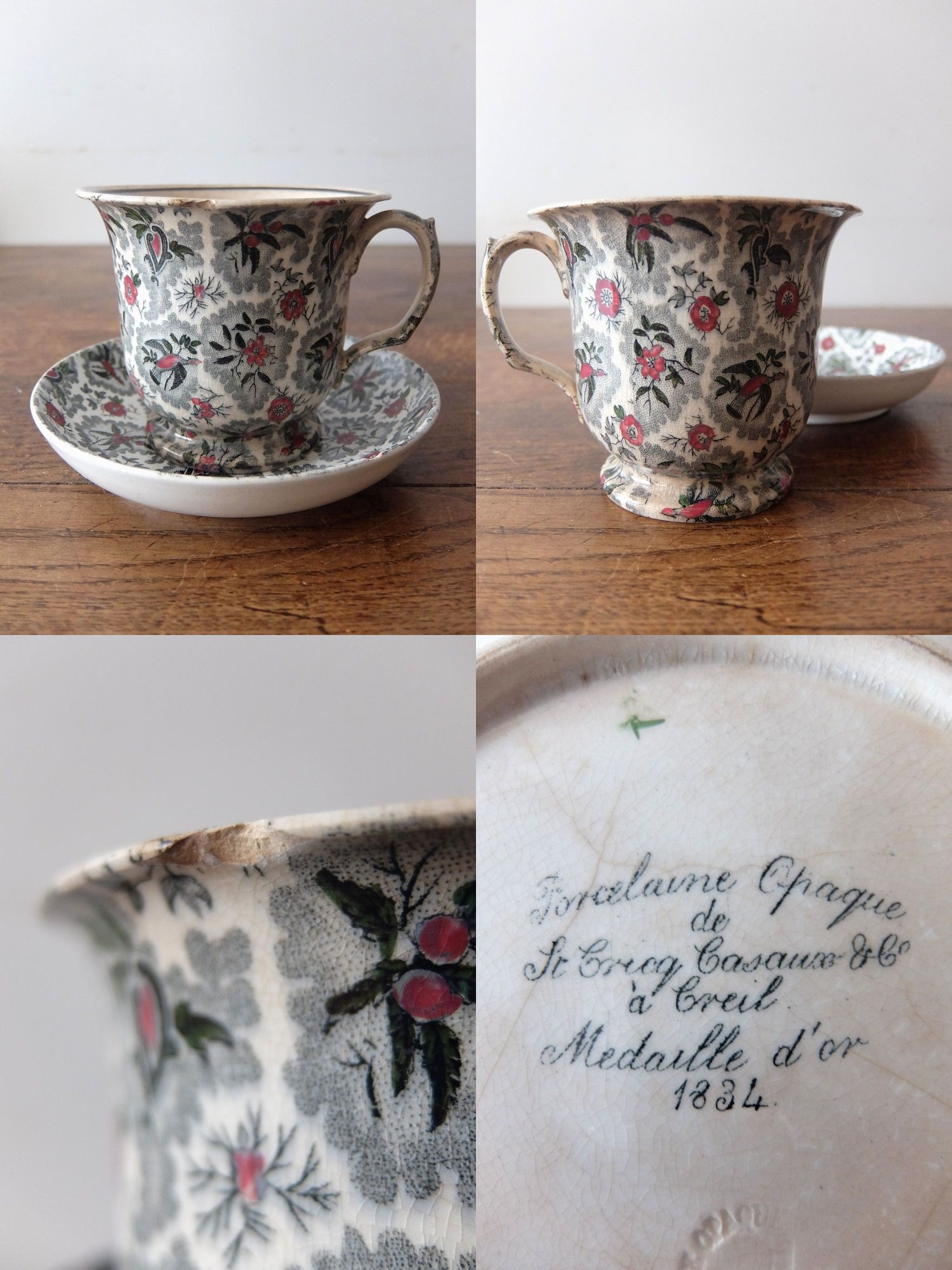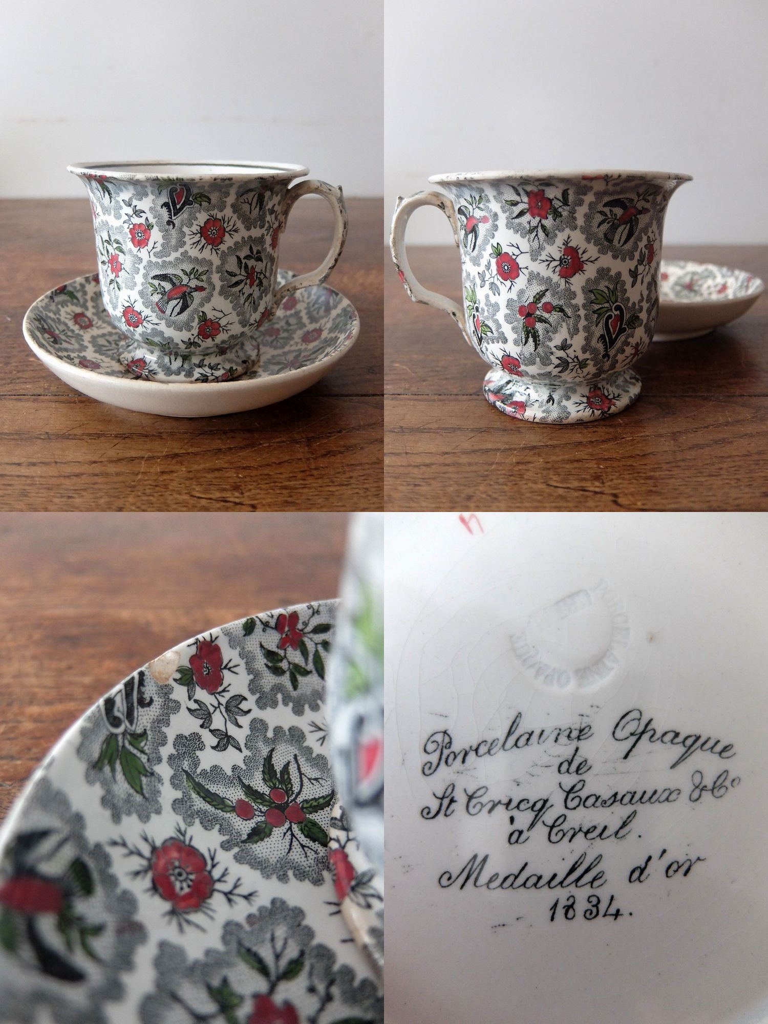 鳥と植物の絵柄が美しいクレイユのカップ&ソーサー(ホットチョコレート用)とシュガーボウルのセット