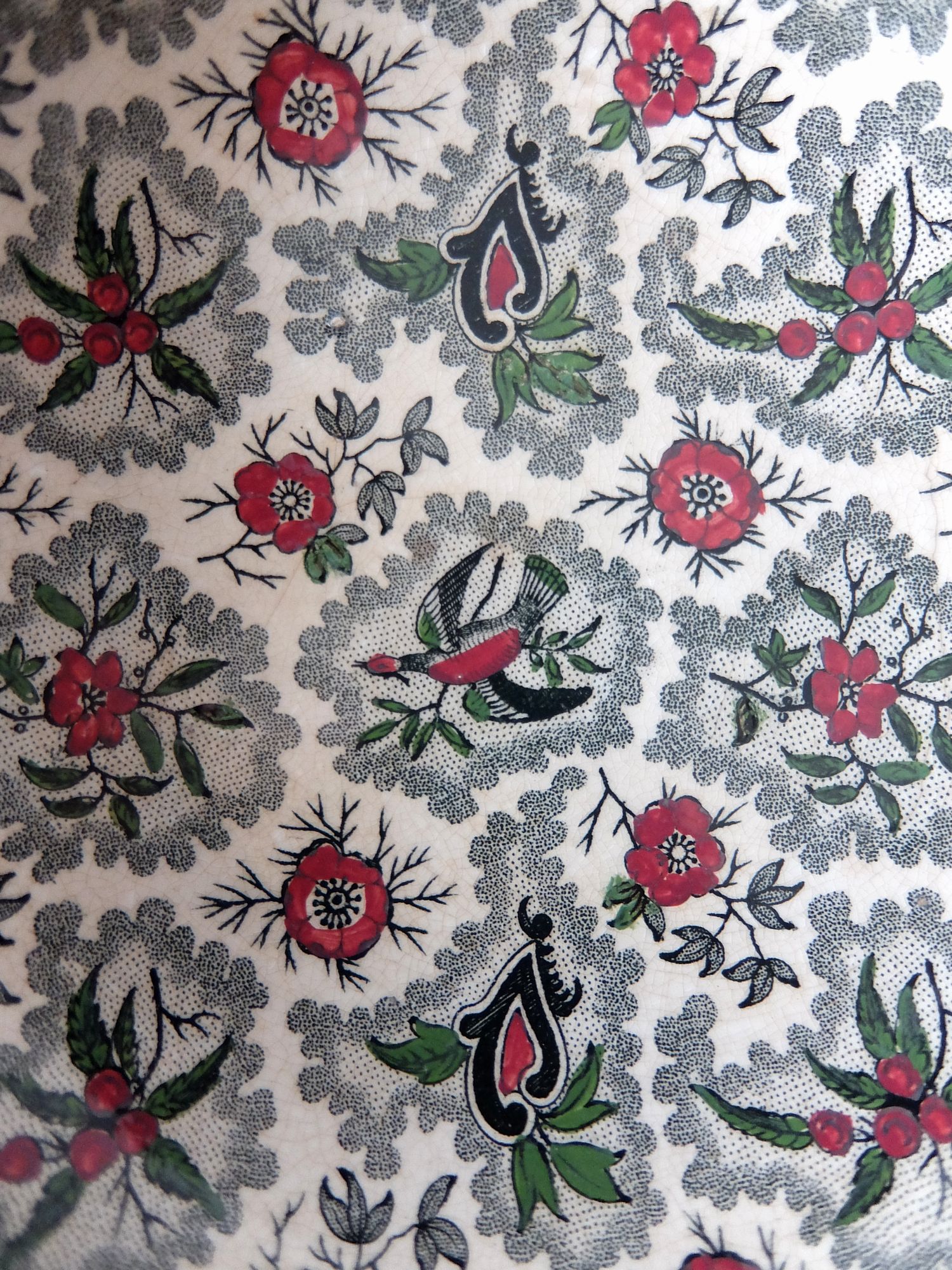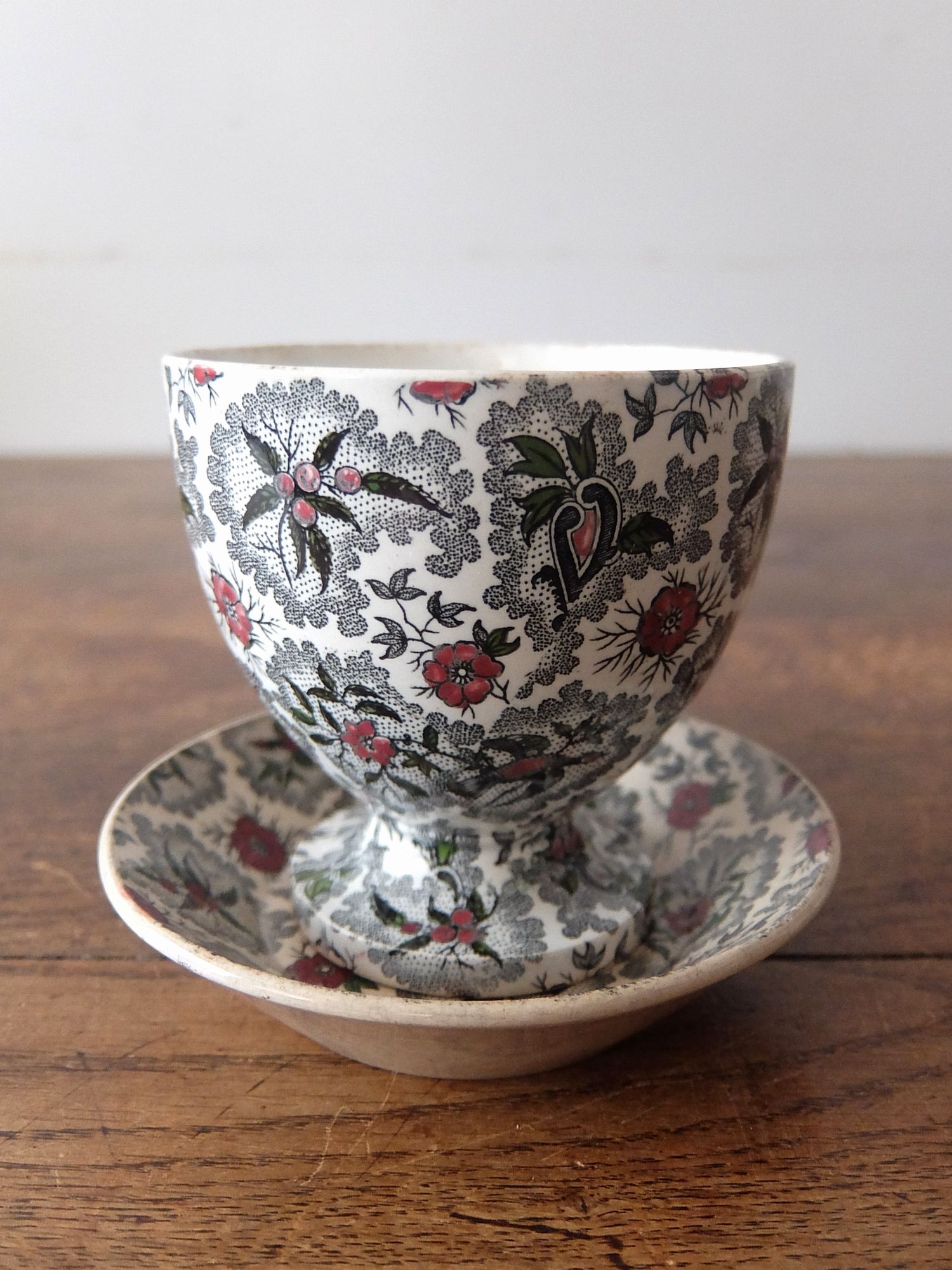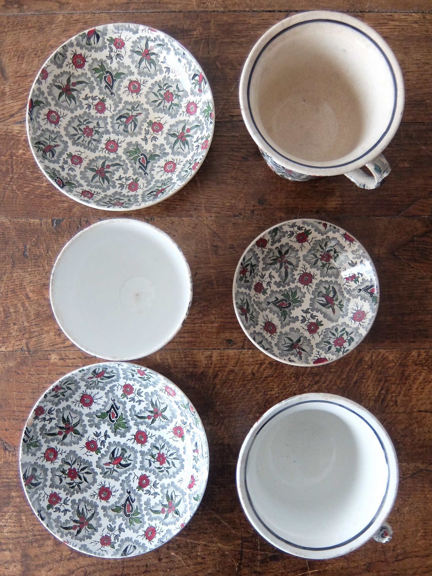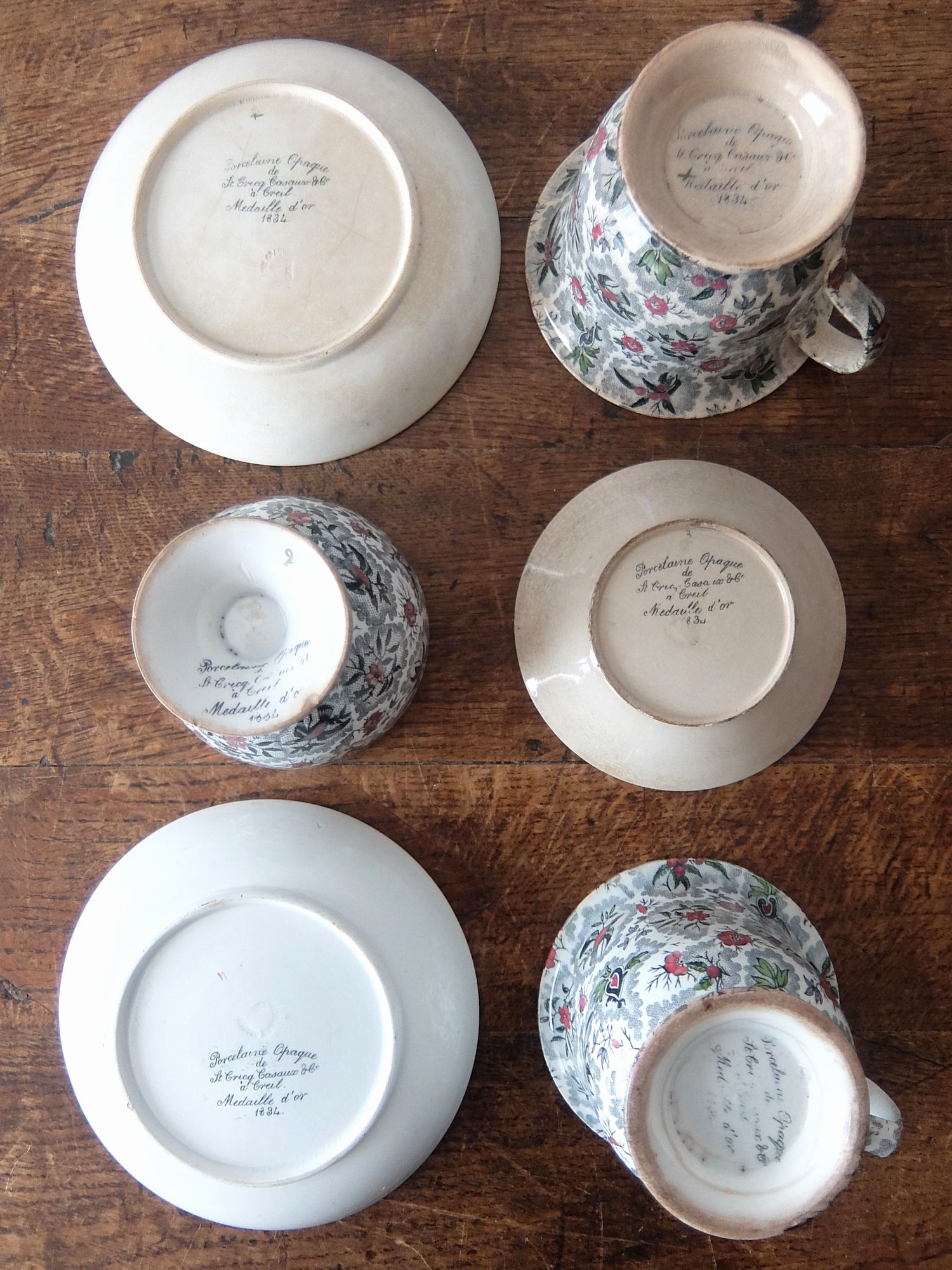 鳥と植物の絵柄が美しいクレイユのカップ&ソーサー(ホットチョコレート用)とシュガーボウルのセット